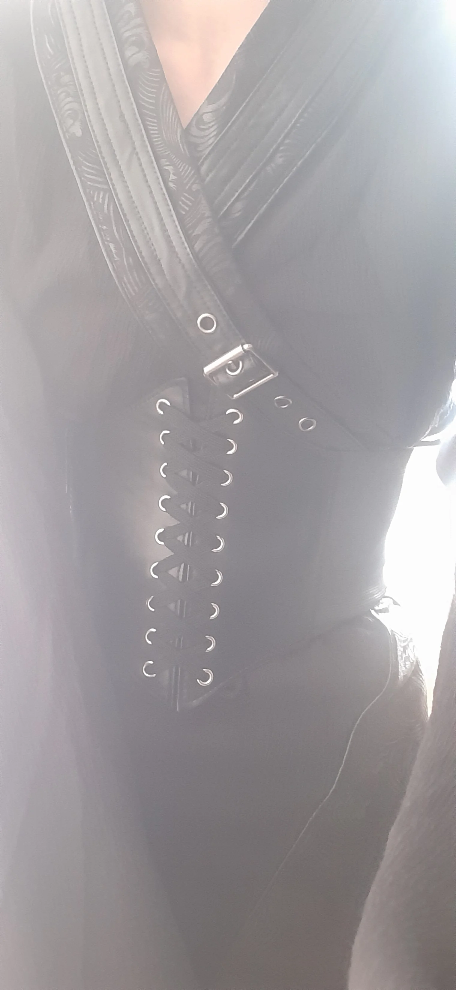Не люблю фотографироваться, поэтому только вот такой кусочек есть Прекрасно, я теперь полностью как мой персонаж. Ещё год назад сделала своему персонажу такую одежду и уже после мечтала её заказать, что в последствии и сделала, и я очень довольна На фотографии всё стянуто и ремень ушёл вниз ( потому что я так сильно стянула, груди же у меня особо нет, а костюм ещё и рассчитан на девушку с грудью). Я очень худая, что даже размер S мне может быть велик, но я нашла способ как его красиво уложить и вышло красиво) Ткань тонкая, не тянется, мнётся как я заметила тоже не слабо, но плюс в том что в нём не будет сильно жарко. А ещё в нем впринципе удобно, так что очень хорошая одежда, мне понравилась) ♥️