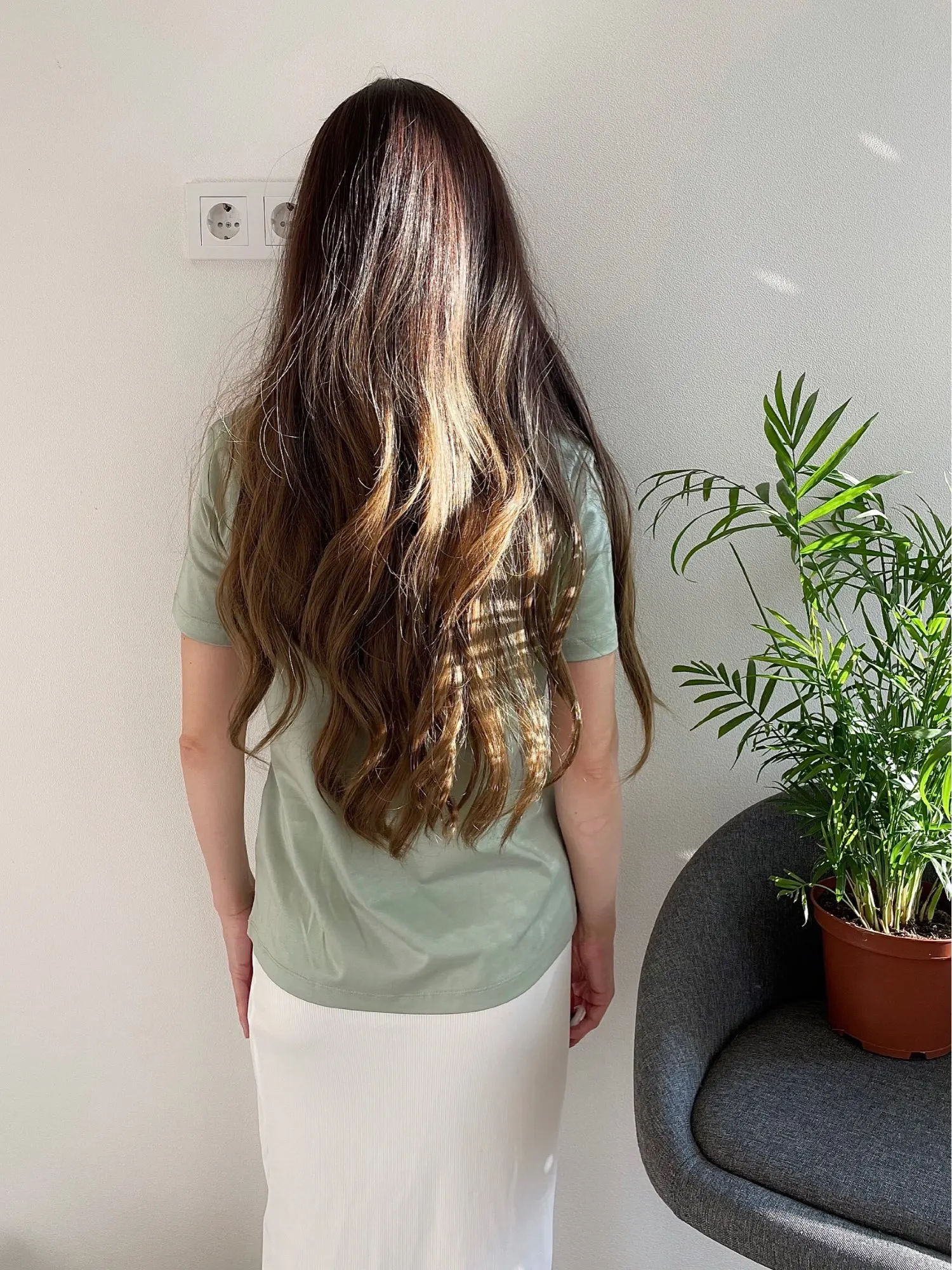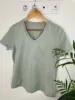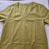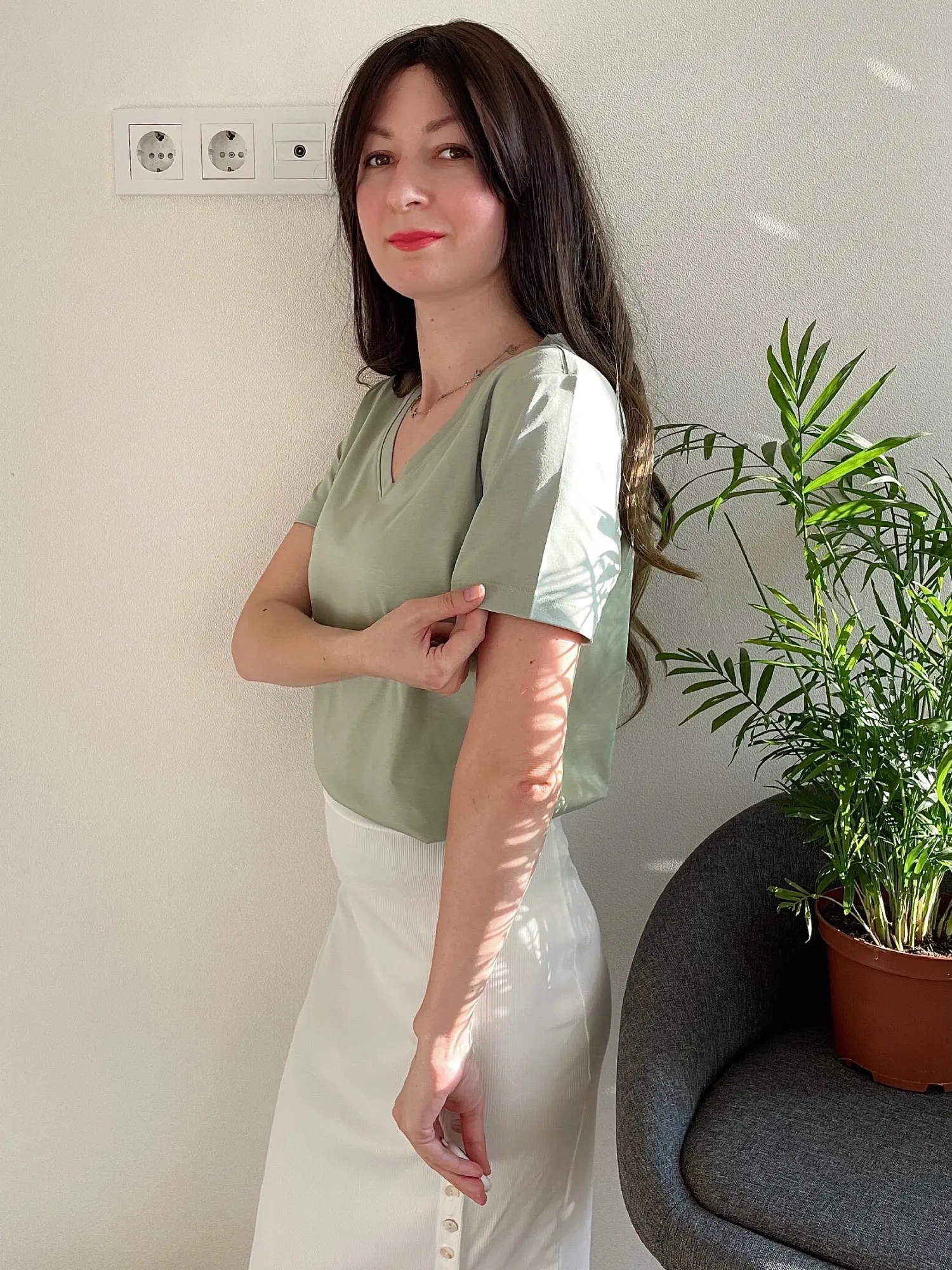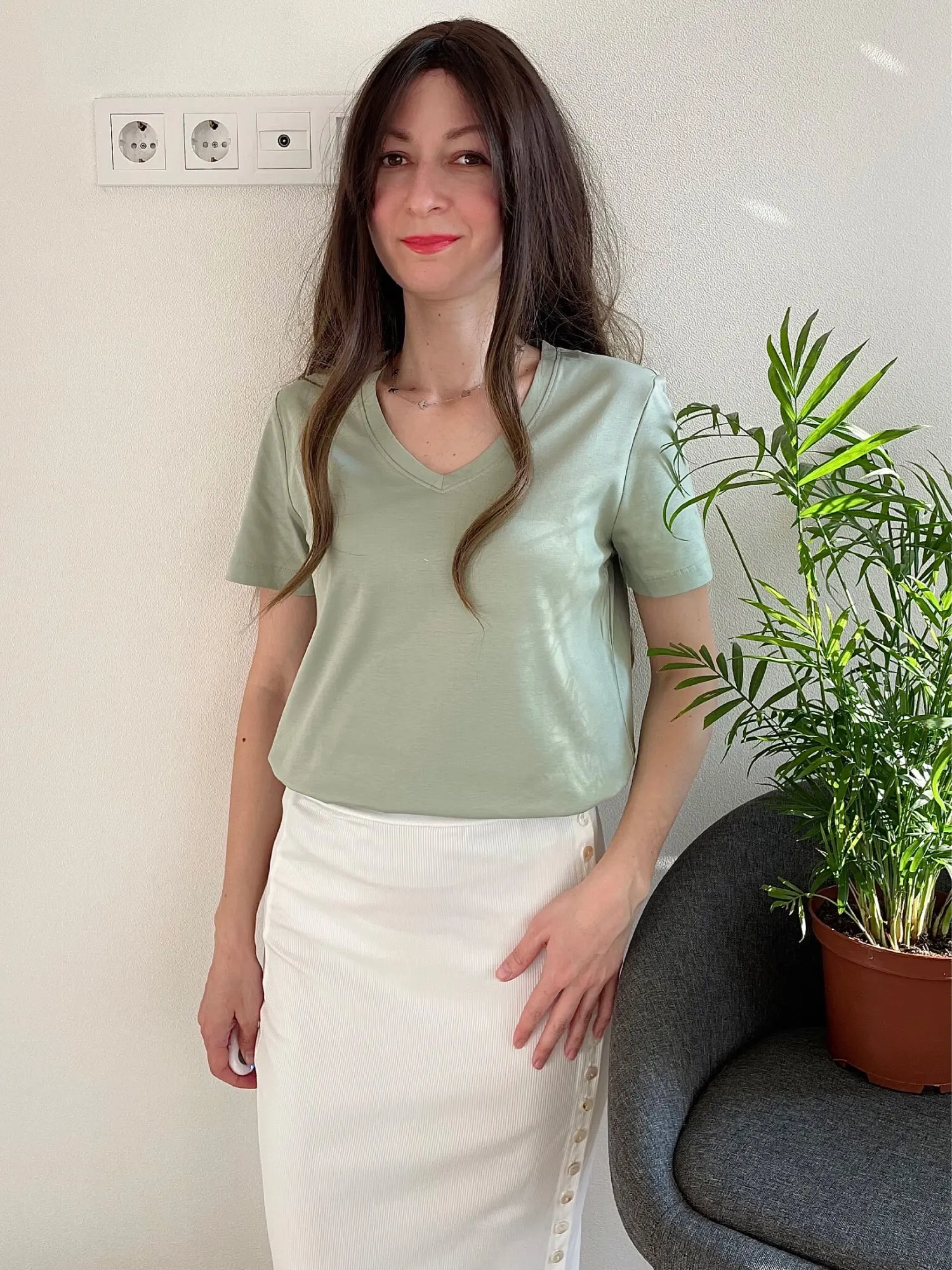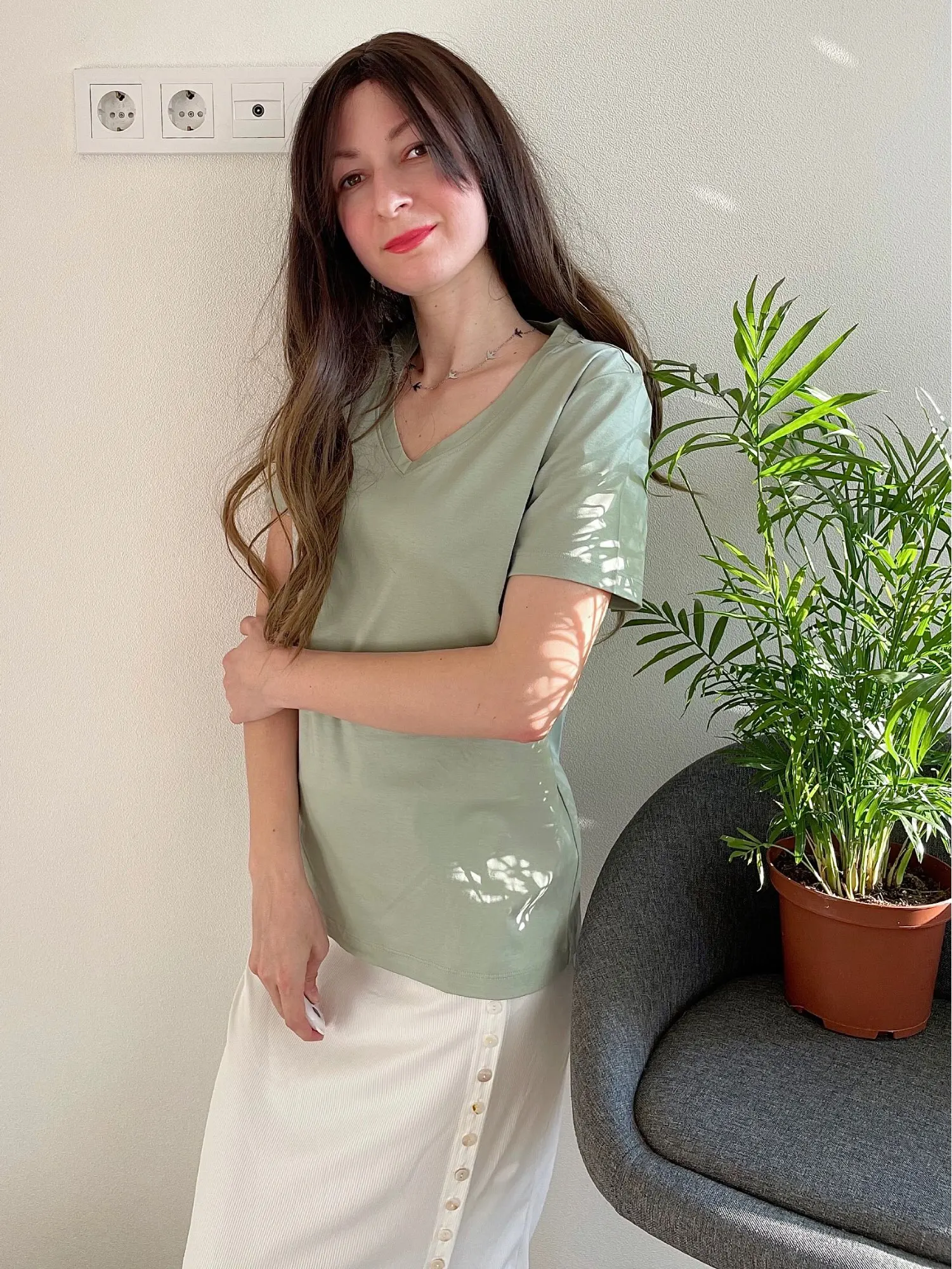 Прекрасная однотонная футболка. Вещь базовая, подойдёт под много образов. Качество шикарное, пошито аккуратно, строчки ровные, нитки не торчат. Материал плотный, шелковистый, приятный к телу. Состав: 65% хлопок, 29% переработанное волокно, 6% шёлк. Цвет 11 Soft Lime - бледно мятный. Футболка представлена в 2 вариантах: круглый и V-образный вырез. На параметры 84-64 и рост 165 см размер S отлично подошёл. Футболка хорошей длины, можно заправить или носить навыпуск. Доставка в срок. Заказом довольна! Рекомендую
