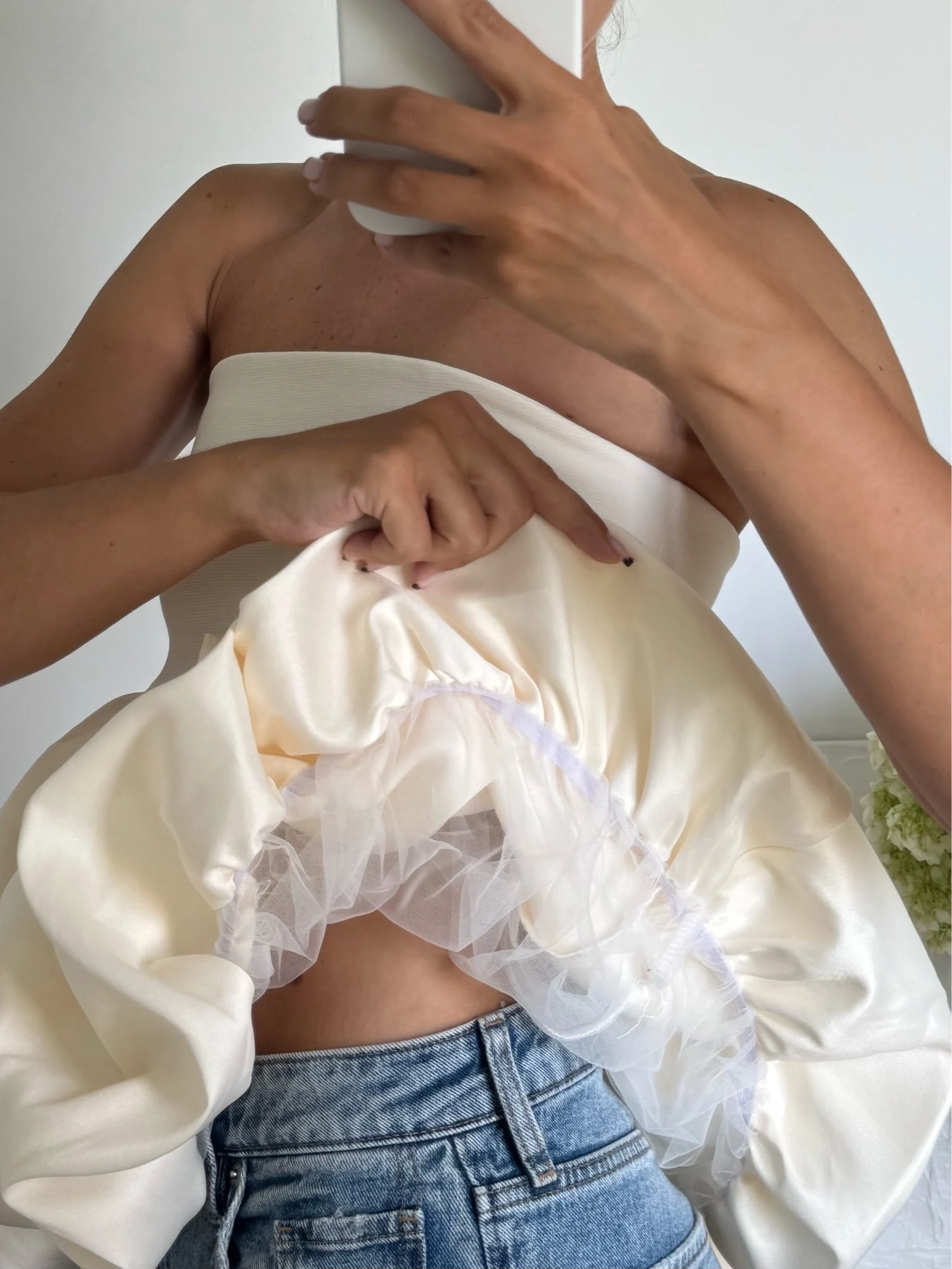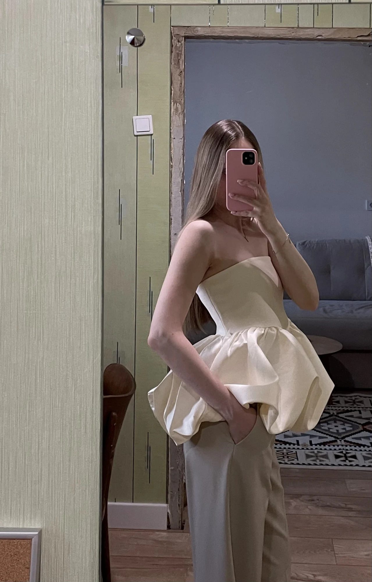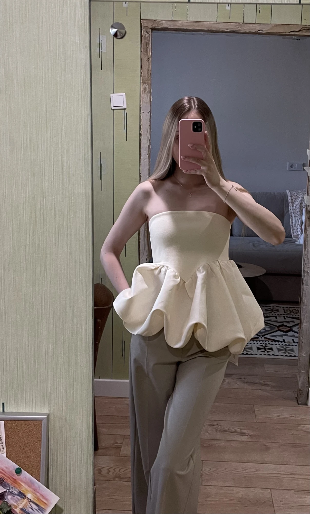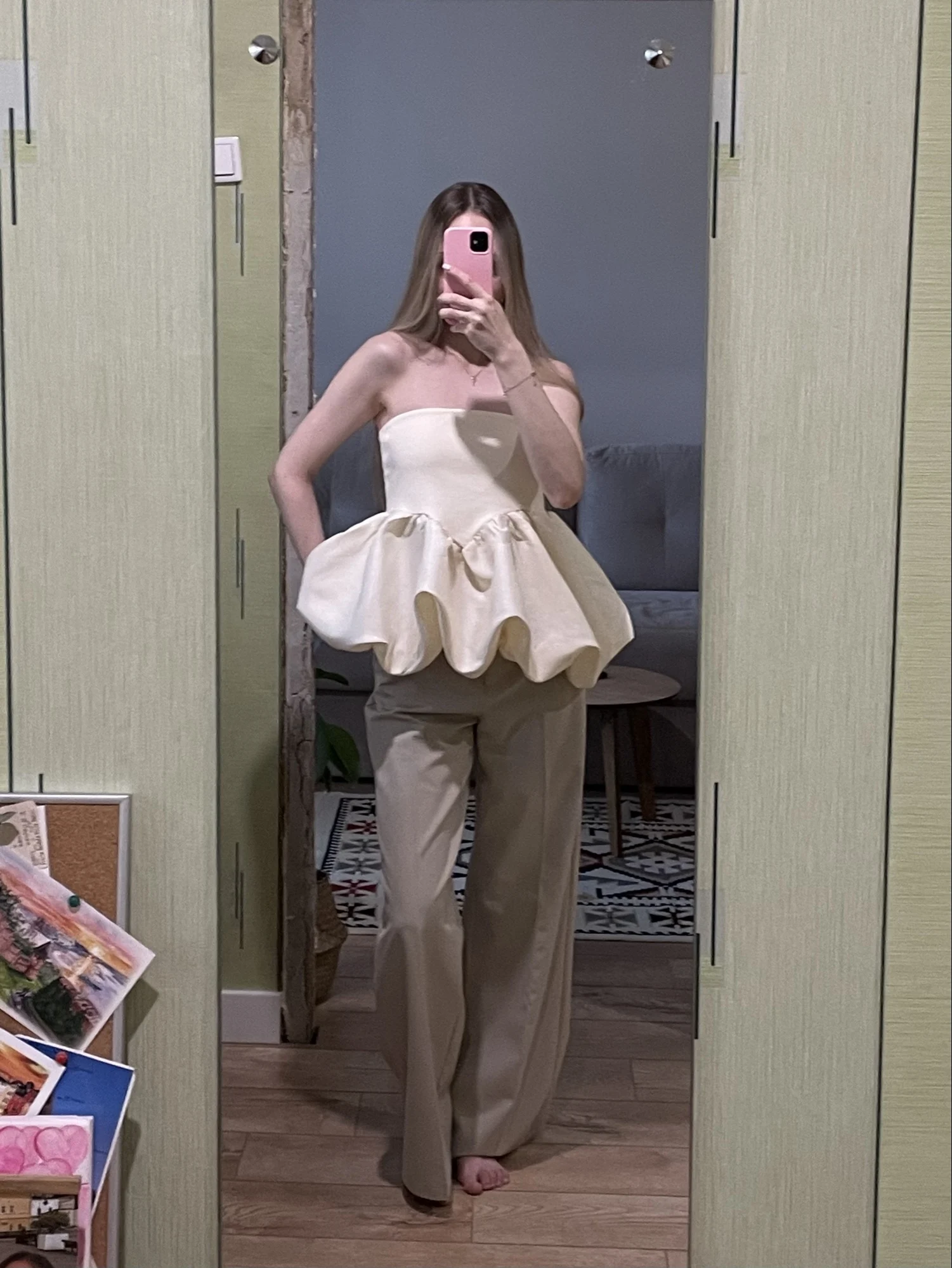 Невероятной красоты топ! Идеально сел, материал плотный, верх трикотажный, тянется хорошо. Вниз не сползает. По верху идет силиконовая лента, на спинке молния. Подумала, что в целом можно даже как юбку попробовать носить (последнее фото). ОГ в спокойном состоянии 66. Рекомендую!