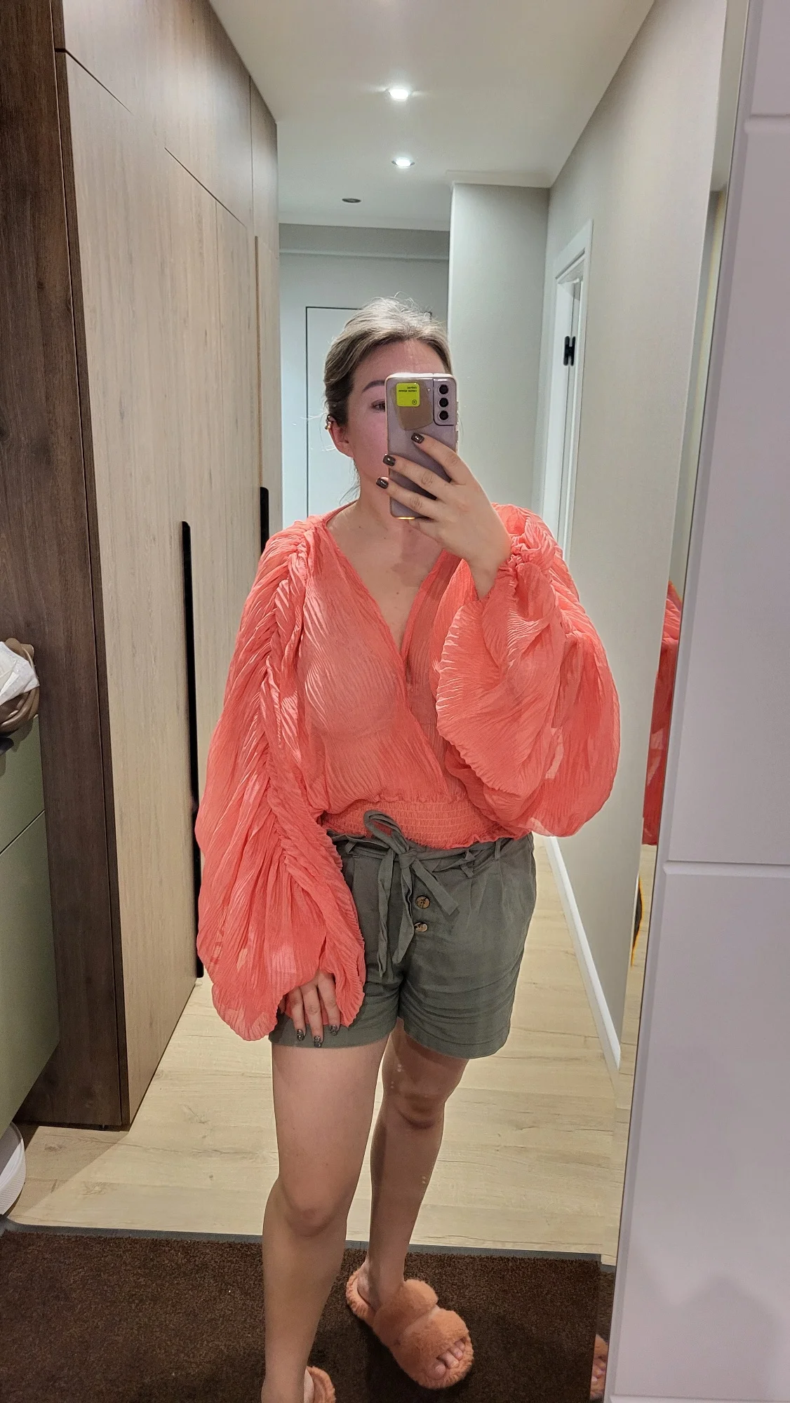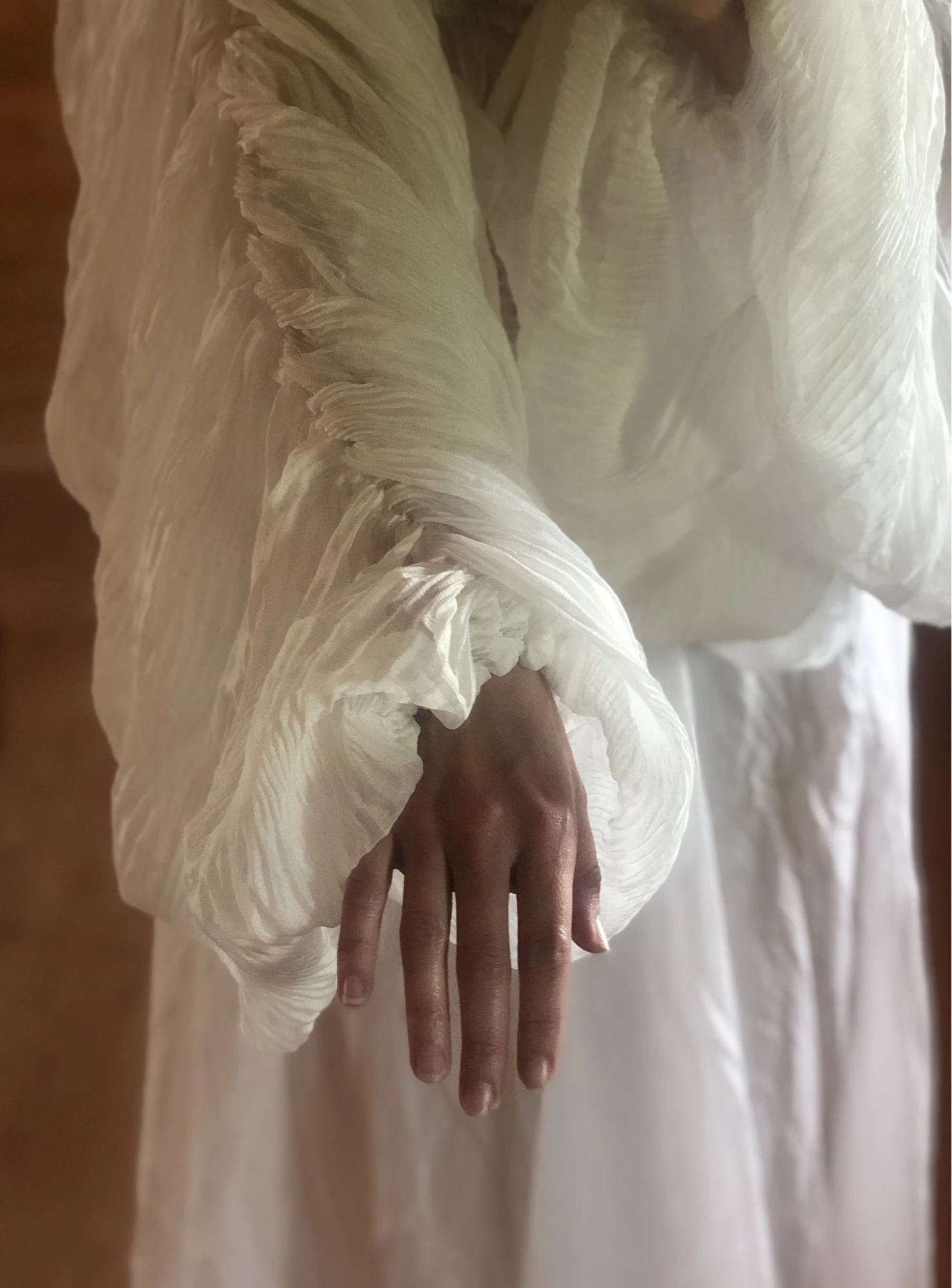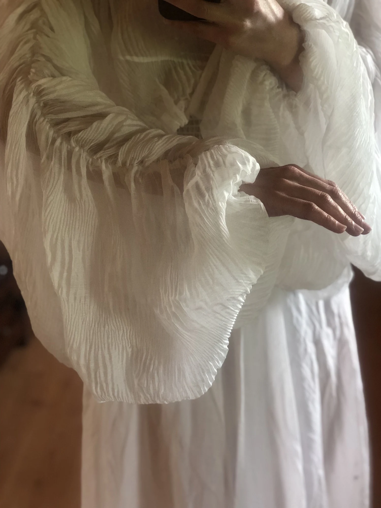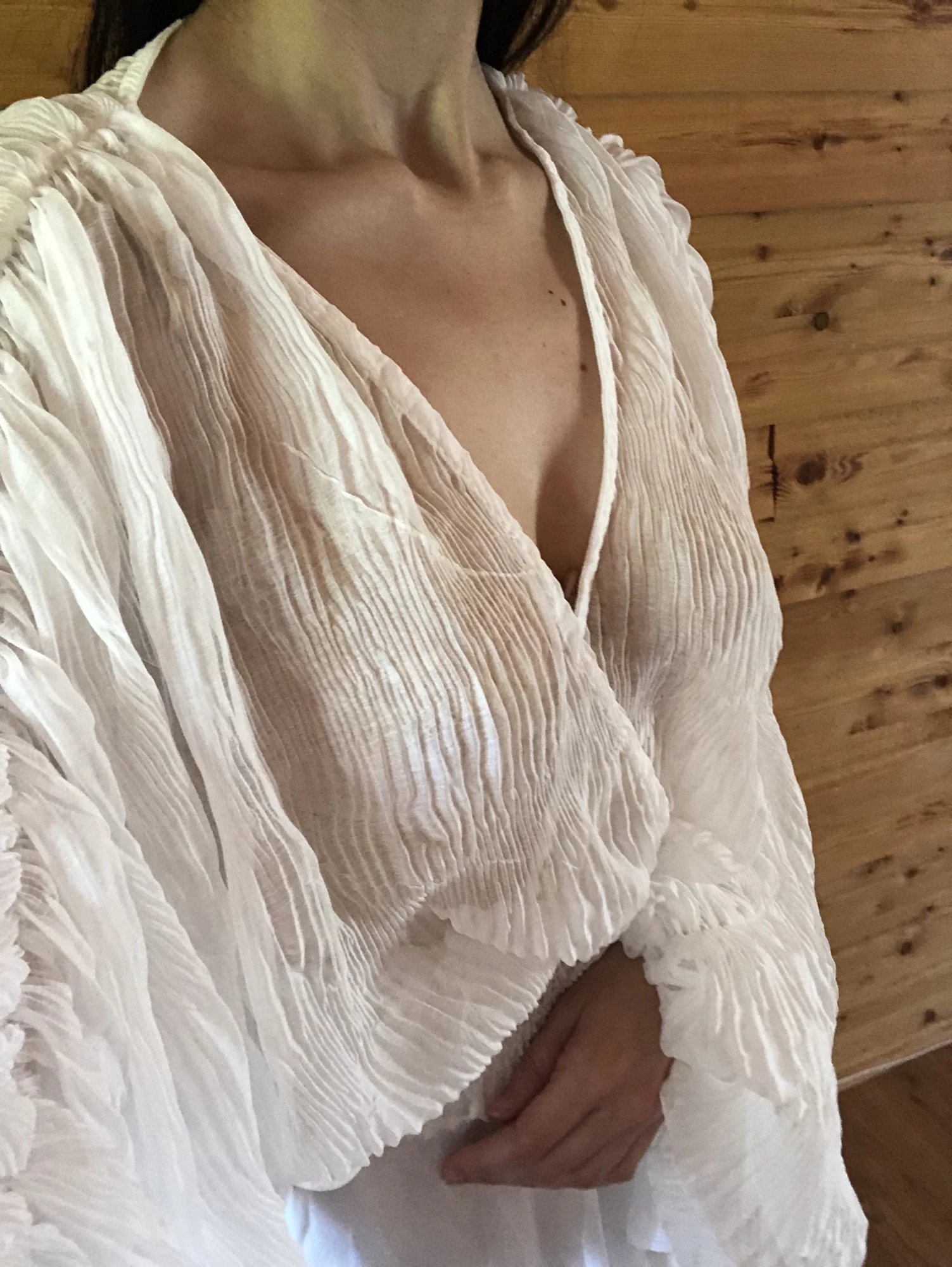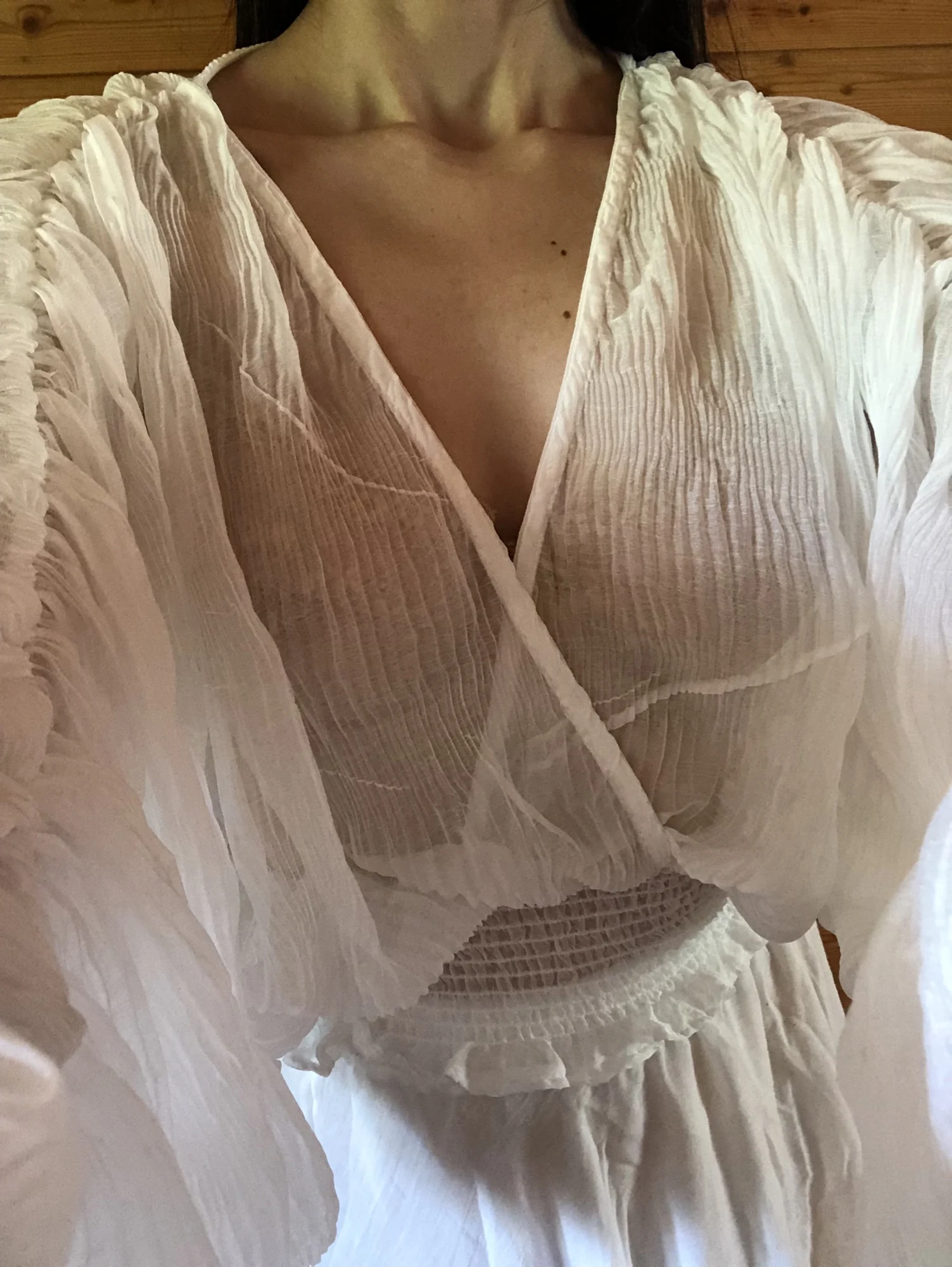 Рубашка полностью соответствует описанию продавца. Очень красивая, аккуратно сшита. Ткань немного грубовата, но иначе не было бы пышных складок. Я очень довольна! На моих фото - с телесным бельём. Мои параметры: рост 164 см, ОГ - 86-88 см, ОТ - 59 см, ОБ - 93 см. Ношу обычно верх XS. Подошло по размеру отлично.