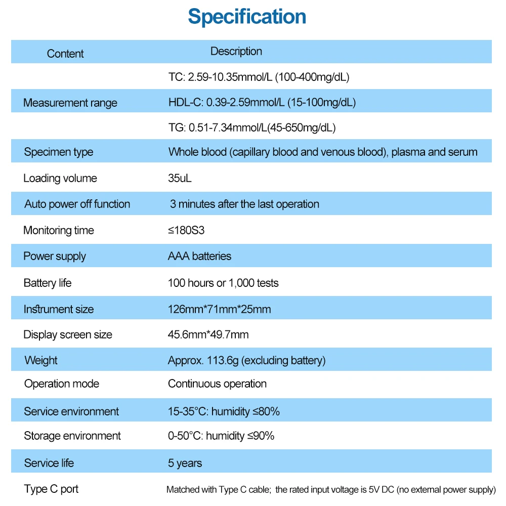 Этот продукт применяется для контроля концентрации общего холестерина (TC), липопротеинового холестерина высокой плотности (HDL) и триглицерида (TG) в цельной крови человека (периферийной цельной крови или венозной цельной крови), in vitro семьями, медицинскими подразделениями и т. д.