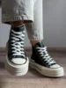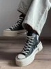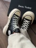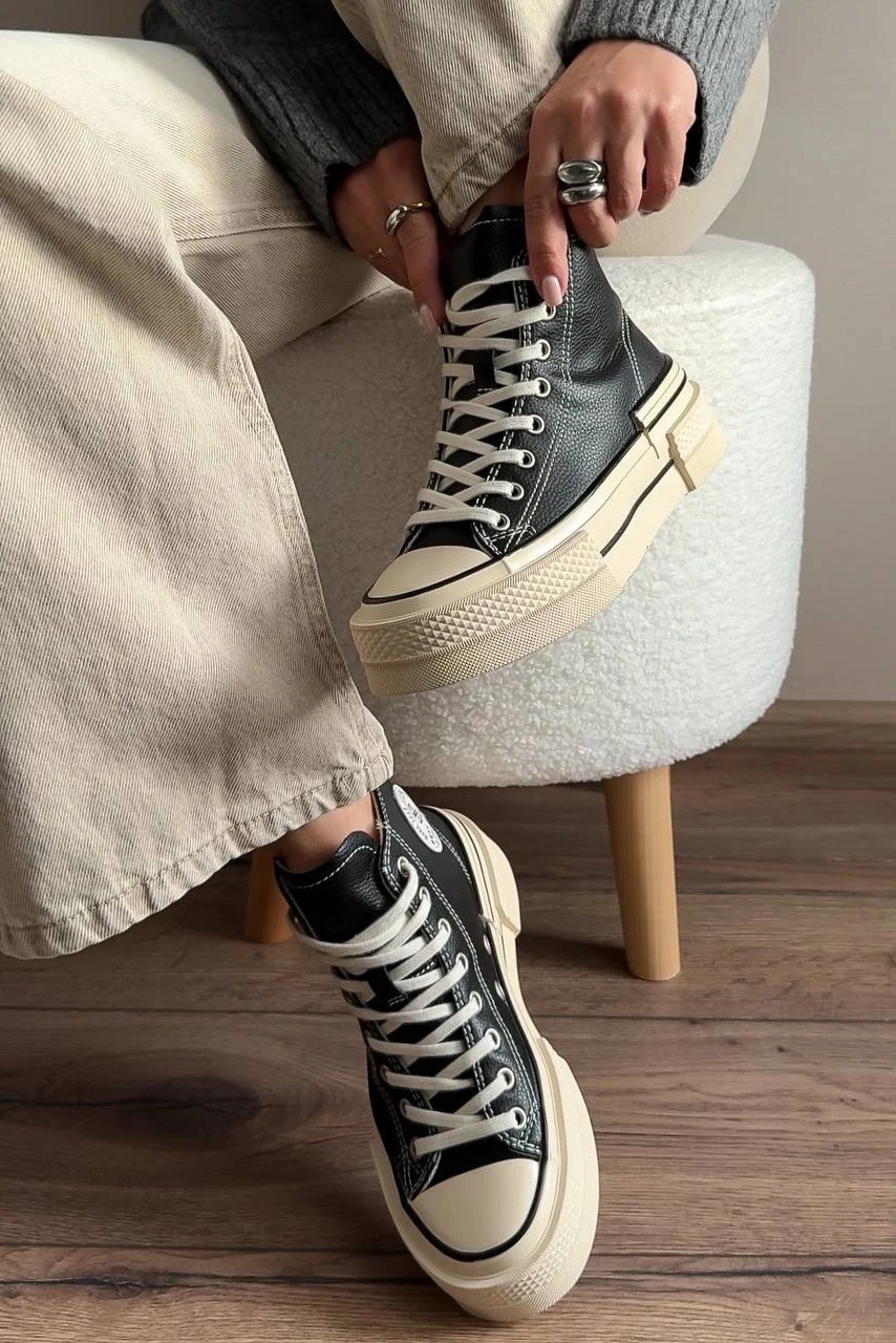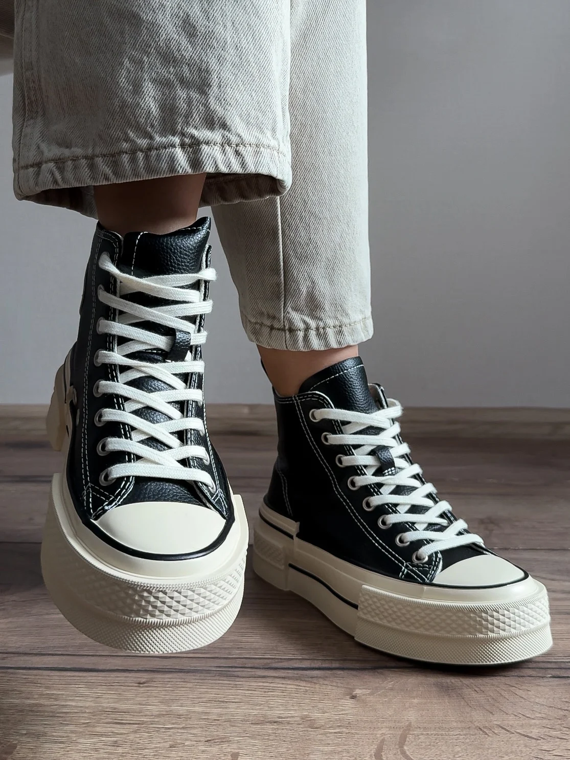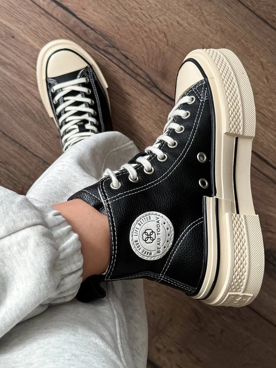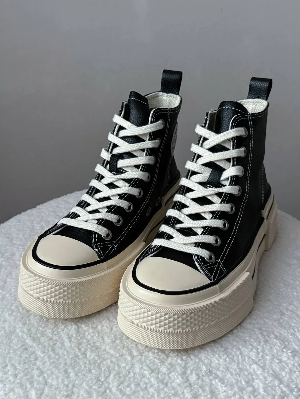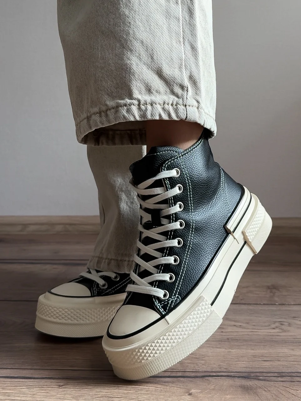 Кожаные высокие кеды На длину стопы 22,5 см заказала кроссовки в цвете Black в размере 5 (35) на свой 35 российский размер, соответственно. На выбор 4 цвета. По размеру подошли идеально. Модель подойдет на узкую и средней полноты ногу. При доставке были упакованы в фирменную коробку - коробка не повреждена. Комплектация: коробка, индивидуальные пыльники, полустельки. Внутри полностью проложены пенопластовыми и картонными вставками для сохранения формы. Выполнены из натуральной кожи. Резиновая подошва. Внутренняя отделка из текстиля для комфорта ноги. Кеды на шнуровке, которой можно регулировать посадку по объему ноги. На ноге сидят очень комфортно, удобные и легкие, несмотря на довольно массивную подошву. Качество безупречное! Выглядят они просто нереально круто! Модель отдаленно напоминает знаменитые кроссовки известного бренда. Очень стильные высокие кеды на прохладное лето и теплую осень!