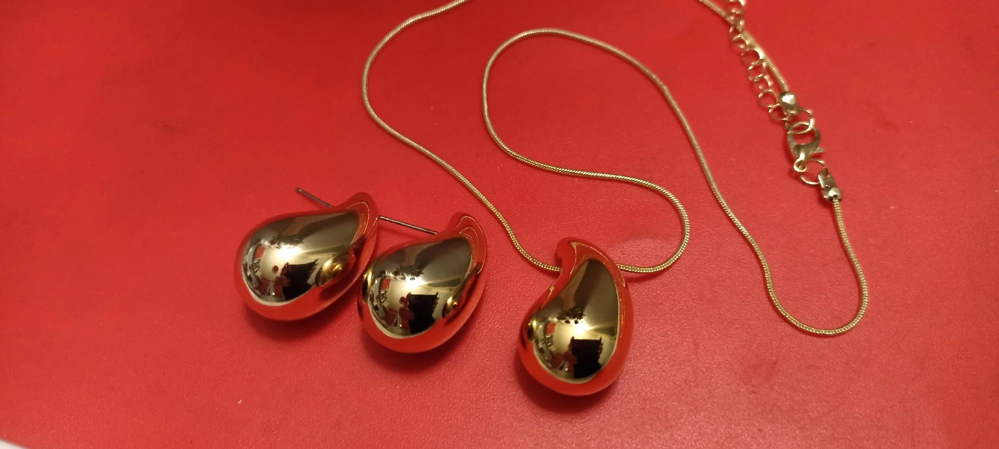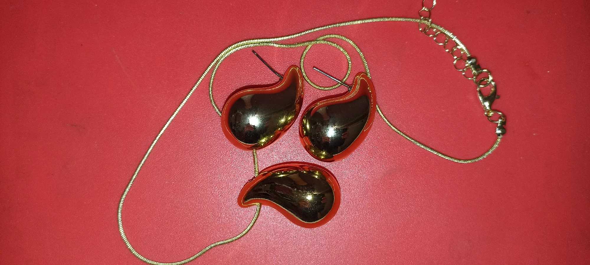 Комплект яркий и оригинальный, притягивает взгляд, выгодно подчеркнëт любой образ! Но качество изделий соответствует цене. Пластик, покрытый краской. Цепочка короткая, вероятно, потемнеет. Заглушки на гвоздиках лучше использовать силиконовые, чтоб не сломать ножку. Серьги и кулон одного размера. За эту цену, всë Ок, спасибо. Доставили быстро!
