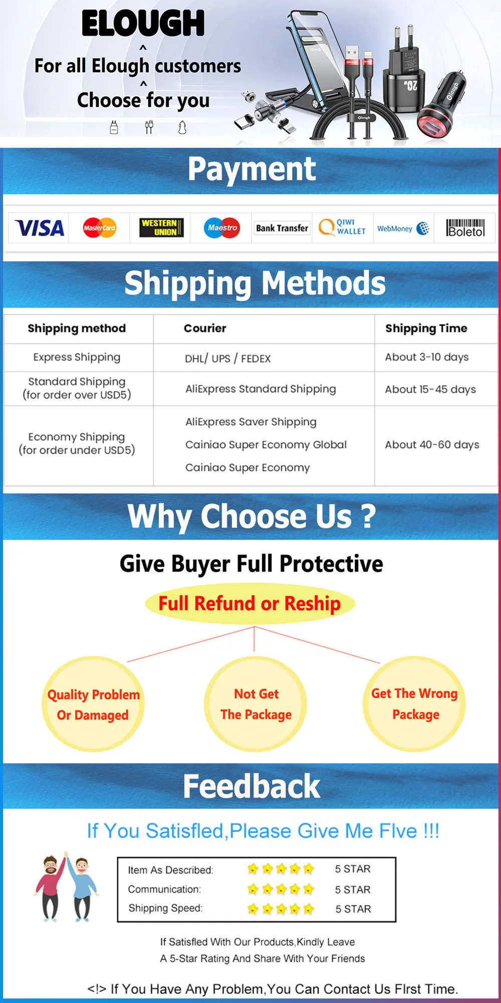Если у вашего продукта есть какие-либо проблемы с качеством или длительная доставка, пожалуйста, свяжитесь с нами, мы предложим вам решение. Если вам нравятся наши товары, пожалуйста, дайте нам пятизвездочный отзыв, спасибо!