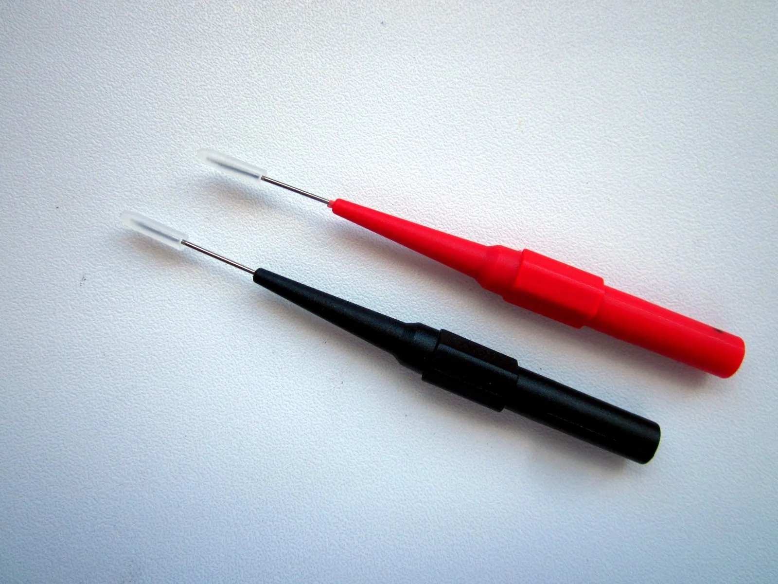 Очень тонкие насадки, что хорошо. Отлично подходят для стандартных щупов. Рекомендую. Провод собрал сам из старых щупов для вольт метра.
