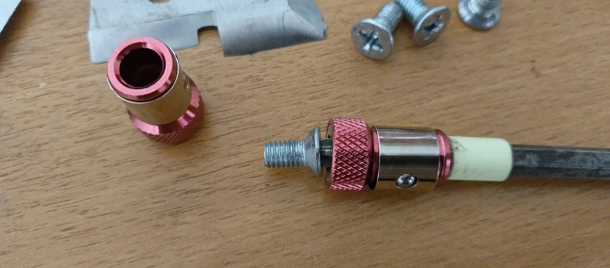 На рыбалку беру всегда отвёртку с длинной крестообразной битой, для замены ножей ледобура. Винтики маленикие и их легко можно потерять при падении в снег, для этого и покупал эти магниты. Магниты магнитятся, будет удобнее работать на морозе. Общая длинна 25,5 мм, диаметр узкой части 12,5 мм, широкой 15,0 мм, внутренний диаметр 7,2 мм. Вес- сколько-то там грамм. Есть стопорный подпружиненный шарик, наверное на какие-то биты он подходит, на моеей просто туго держит магнит.