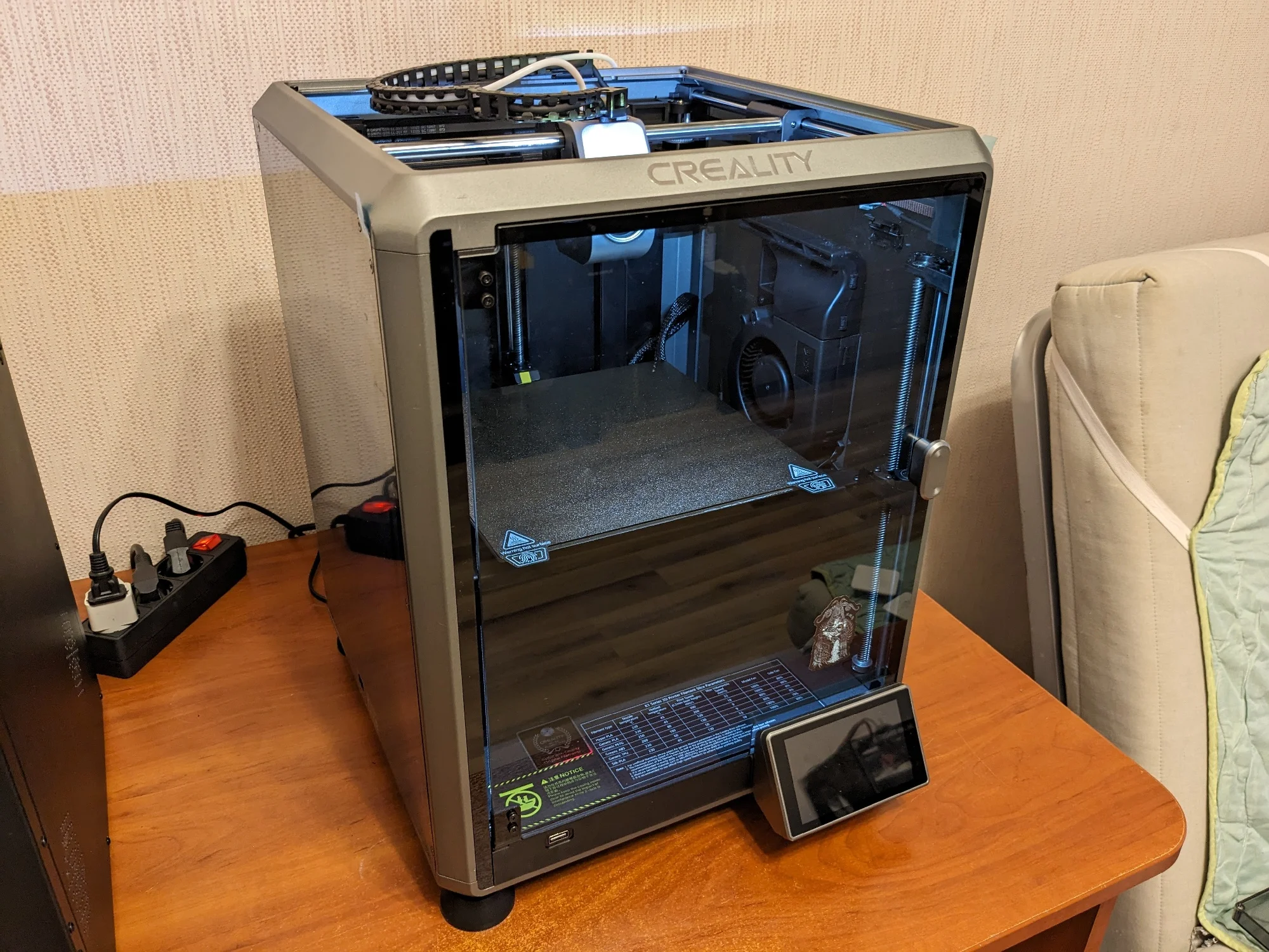 Принтер очень специфический и это проявляется во всём. Очень не советую новичкам, даже за стоимость в 40к по скидке - замучаетесь подбирать настройки и допиливать, чтобы печатал по качеству хотя бы на уровне Ender 3, хоть и в 3 раза быстрее. Распаковка: При распаковке принтера было стойкое чувство, что он немного бу. В углу на дне пятно смазки, от стекла дверцы оторвана магнитная пластинка, по корпусу мелкие царапины и вишенка на торте - транспортировочные винты, которые вручены прям в пластик дна, которые оставляют некрасивые дырки при выкручивании. Первый запуск: При первом запуске всё прошло хорошо, т.к. принтер не первой версии и все самые основные болячки уже исправлены. тестовый бенчи печатает очень быстро, с хорошим качеством, но с сильным эхо. В целом, с пла пластиком проблем нет. Запуск в работу: Т.к. я печатаю на заказ, то мне необходима печать petg пластиком, который я и зарядил в принтер. Но с первого же слоя начинаются проблемы - стол адски кривой, он не выставлен в горизонт совсем и при попытке печатать хоть на 60% площади стола постоянные пробелы между слоями, даже с автоуровнем. То есть, сама пластина стола тоже кривая, с небольшими ямами. В целом перепад высот на столе был около 0.16мм, что очень плохо, это толщина одного слоя. Мои дрыгостолы себе такого не позволяют, там идеальный первый слой) Вторая значимая проблема - недоэкструзия на этом пластике. Я пробовал поднимать температуру, снижать скорость, играться с LA, но ничего не помогает. Если увеличить поток, то лучше становится в одном месте, но в другом появляется переэкструзия. Стоит упомянуть, что в качестве слайсера использовал Cura, а не стандартный от креалити, может на последнем и лучше ситуация. Третья проблема - сильное эхо, которое очень чувствуется на ощупь. По инструкции от Соркина прошил принтер, разблокировал все шейперы, но лучше не стало. По оси Y всё отлично и рекомендуемые ускорения были 9к, но по оси x всё чего мне удалось добиться после переборки портала - 3к, что очень плохо. То есть, печать без эха возможна только на ускорения как на дрыгостолах под клиппером. Из улучшений проводил прошивку, настроил шейперы и поменял сопло на 0.4 от треугольников. Ряби, кстати, не заметил на скоростях 150-200мм\с. Вот и получается что печатает он быстро, но доводить его до ума нужно долго и очень вдумчиво, да и заказываете вы кота в мешке, учитывая его не самую лучшую упаковку.Vlad P. 22 ноября 2023