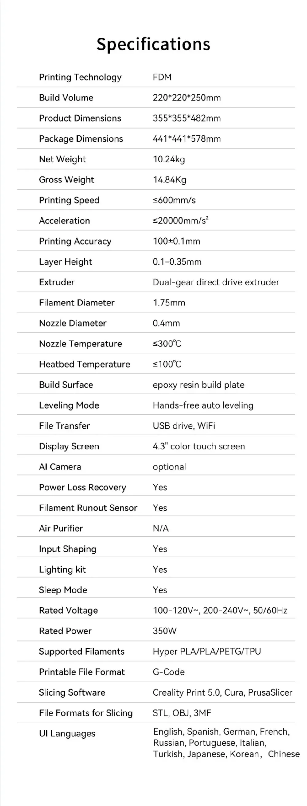 - Программное обеспечение:Creality Print compatible with Cura, Simplify3D, PrusaSlicer