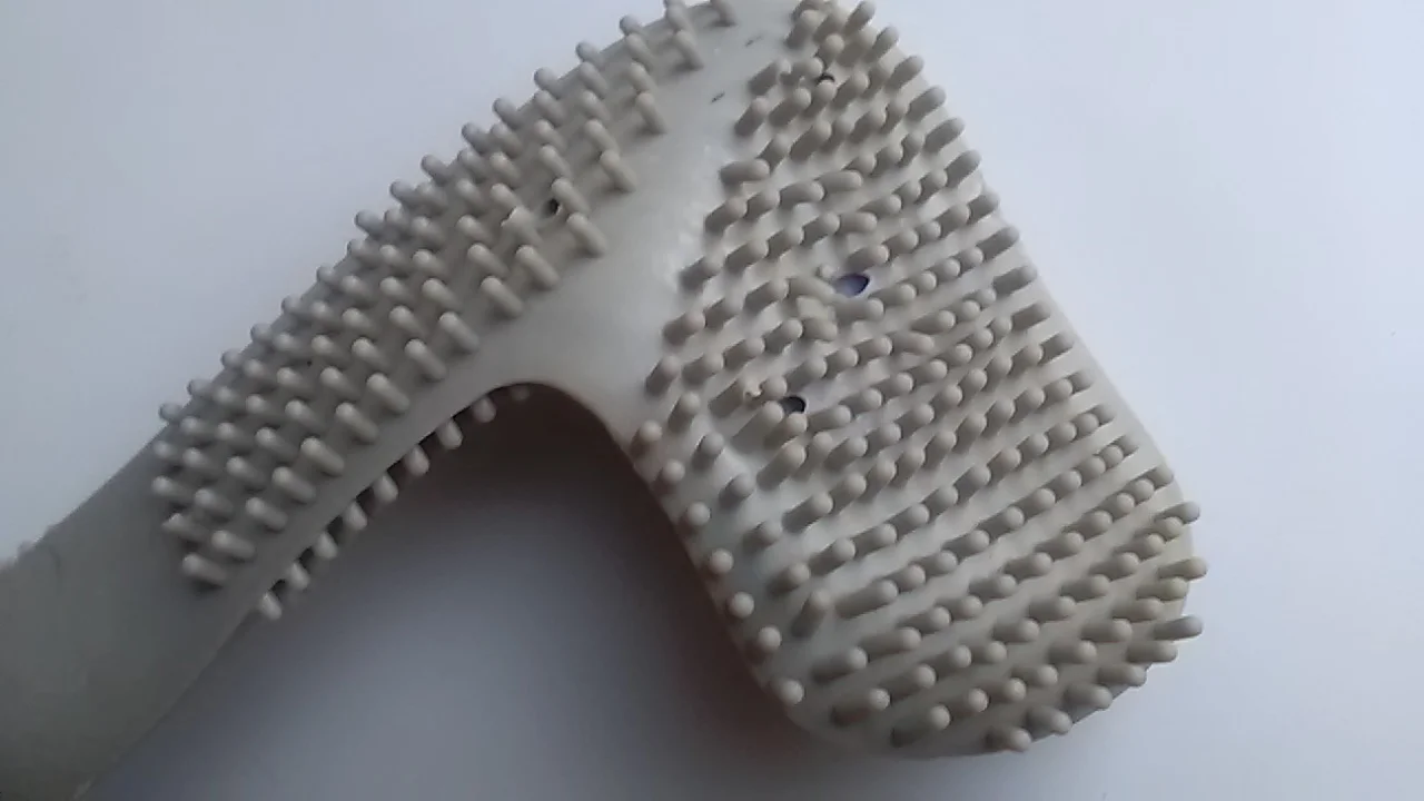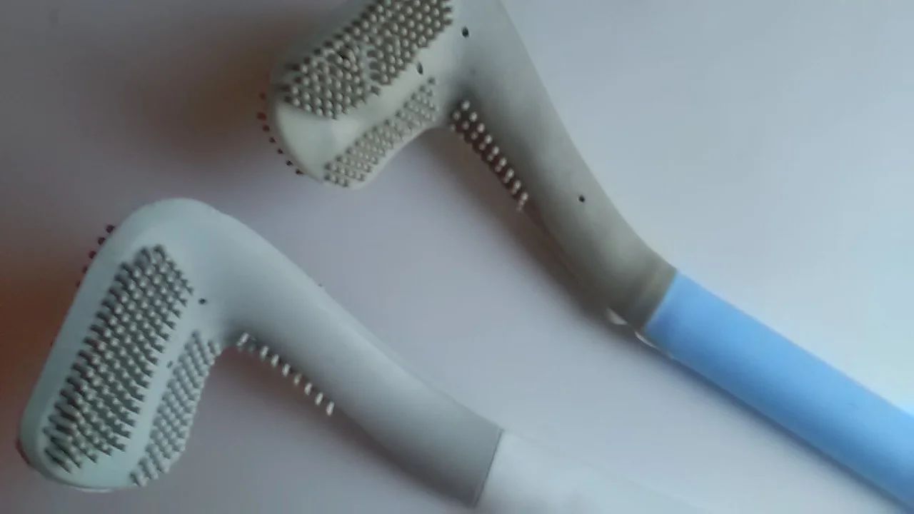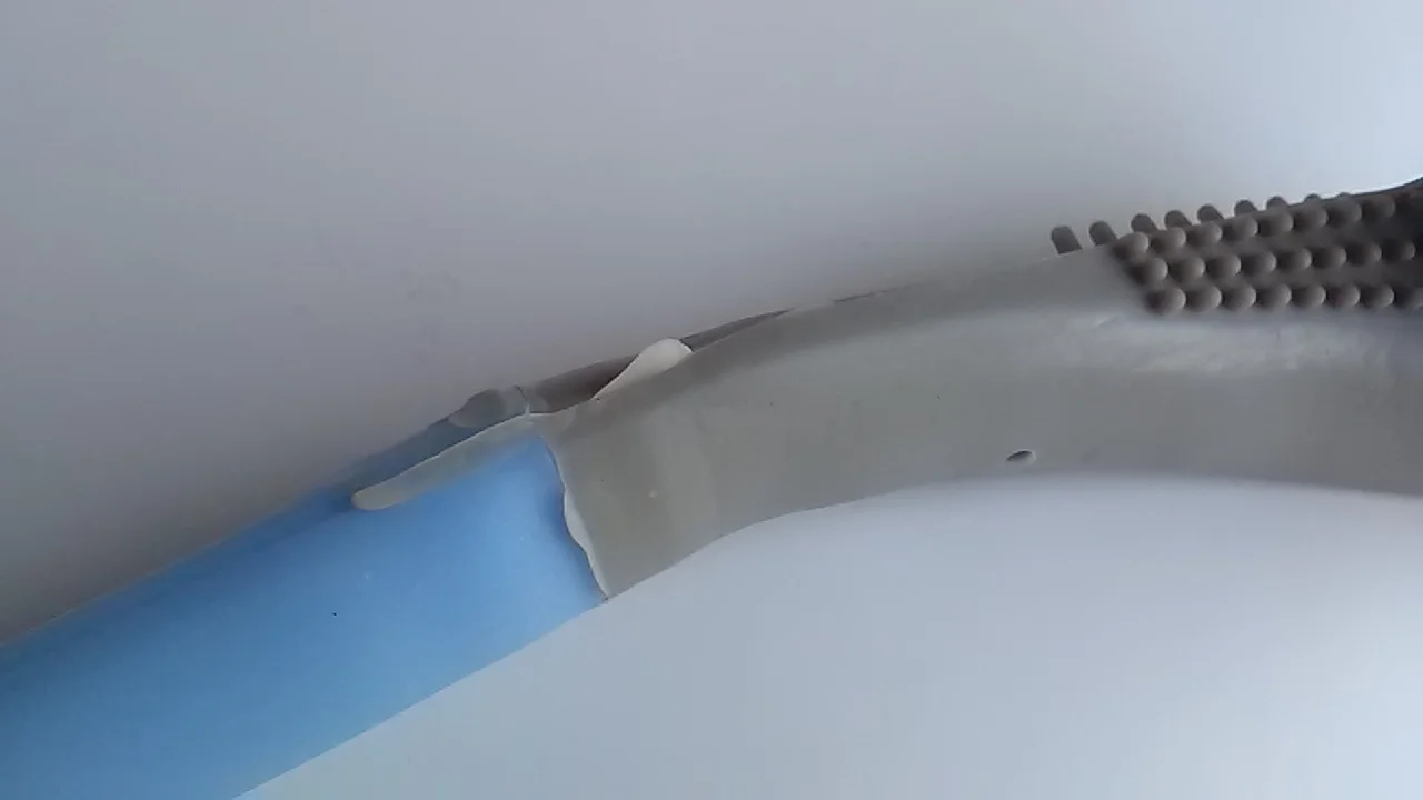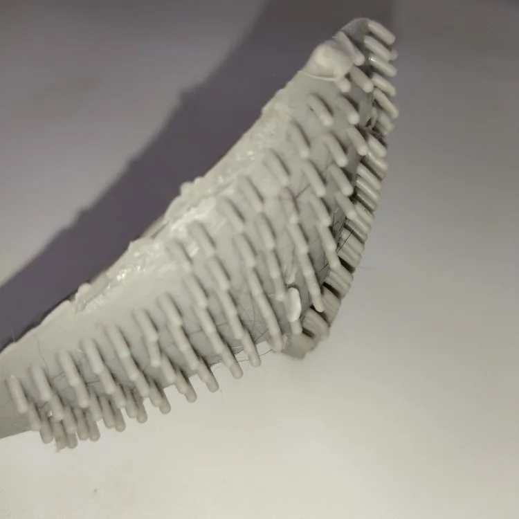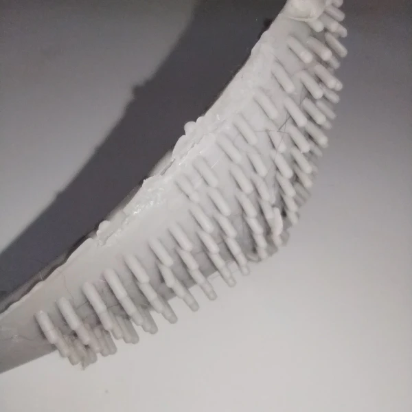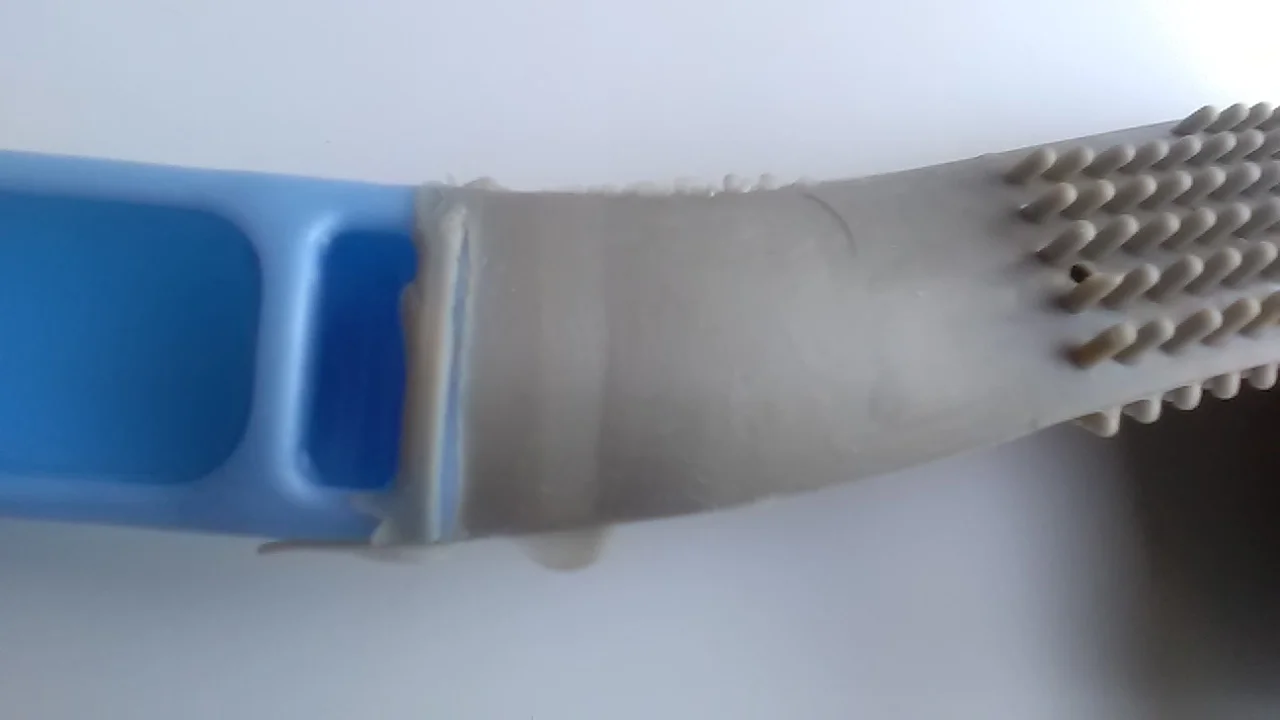 полтора года пользуюсь подобной щёткой из другого магазина, хотела теперь маме приобрести, но очень огорчило качество(((, потеки резины, поверхность потертая, грязная, как было отмечено в других отзывах, какие-то дыры... никаких крючков прислано не было, в сравнении с моей белой, эта "новая" голубая, выглядит старее, хуже и неопрятнее((