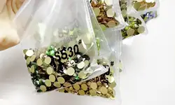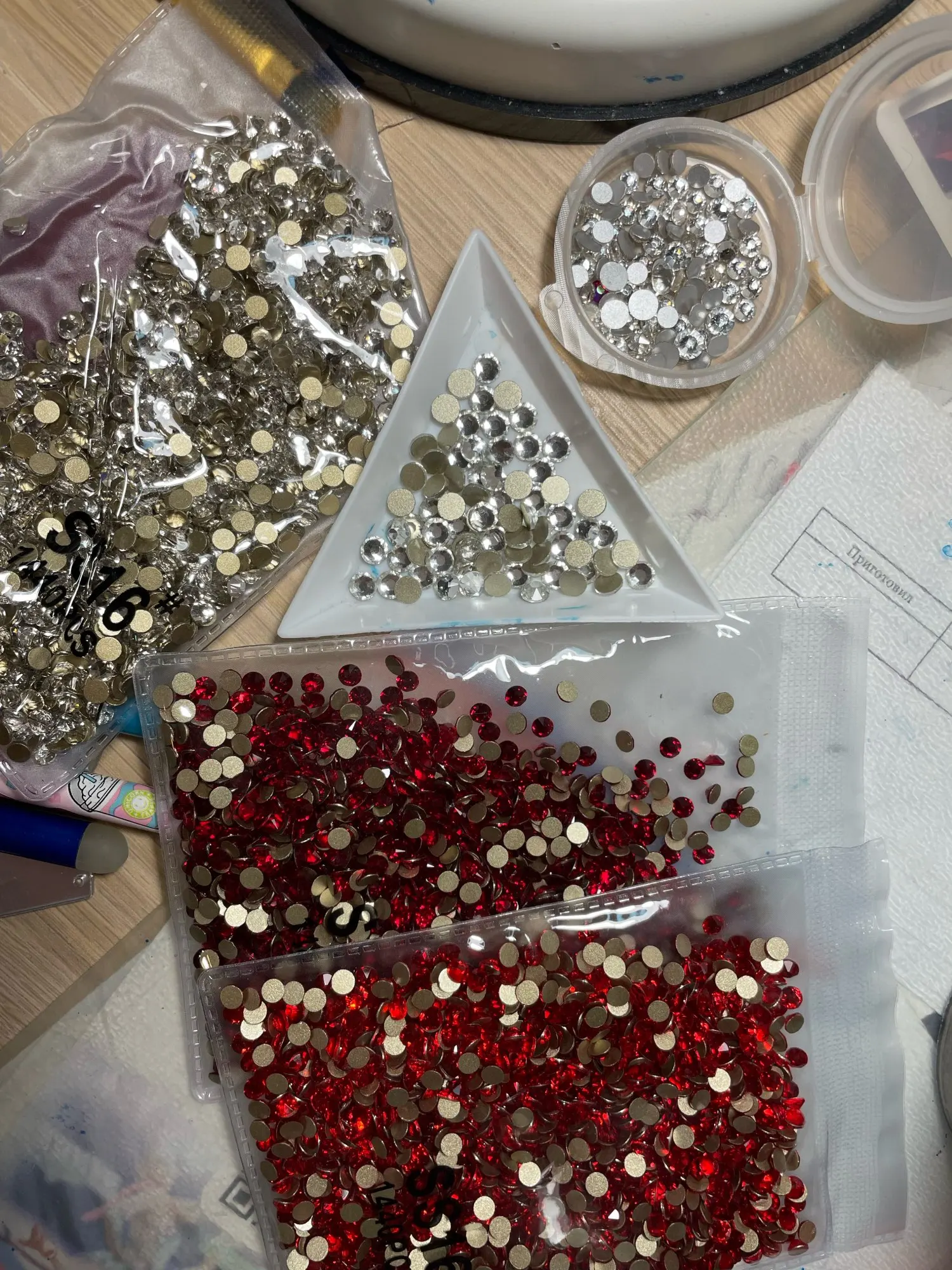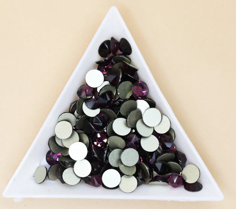 Стразы мутноваты и не совсем чистый кристальный цвет. Блестят не очень. На фото они в треугольном контейнере (в круглом другие стразы для сравнения)