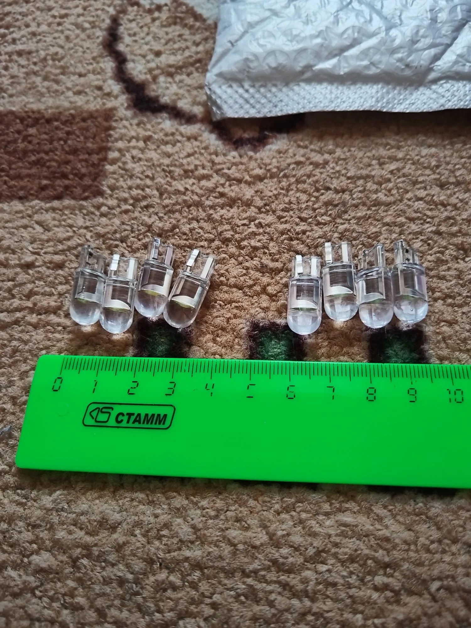 Упакованы хорошо, в пупырчатый непрозрачный мешочек. Повреждений и брака визуально не выявлено. Цвета диодов похожи, но у этого (цвет кристалл блю) оттенок серо-стальной. В отличие от других ламп (цвет белый), где цвет диода с оттенком светло-лимонного цвета Это заметно. Заказ этого товара (цветов: зелёный, красный) в этом магазине у данного продавца уже третий по счёту. Я всё уже комментировал в подробностях ранее. Товар хороший, всем доволен. При случае дополню фото с цветом свечения, когда установлю их на проверку. Конкретно эту посылку задержали на 10 дней. Хотя самую первую прислали на несколько дней раньше заявленного.