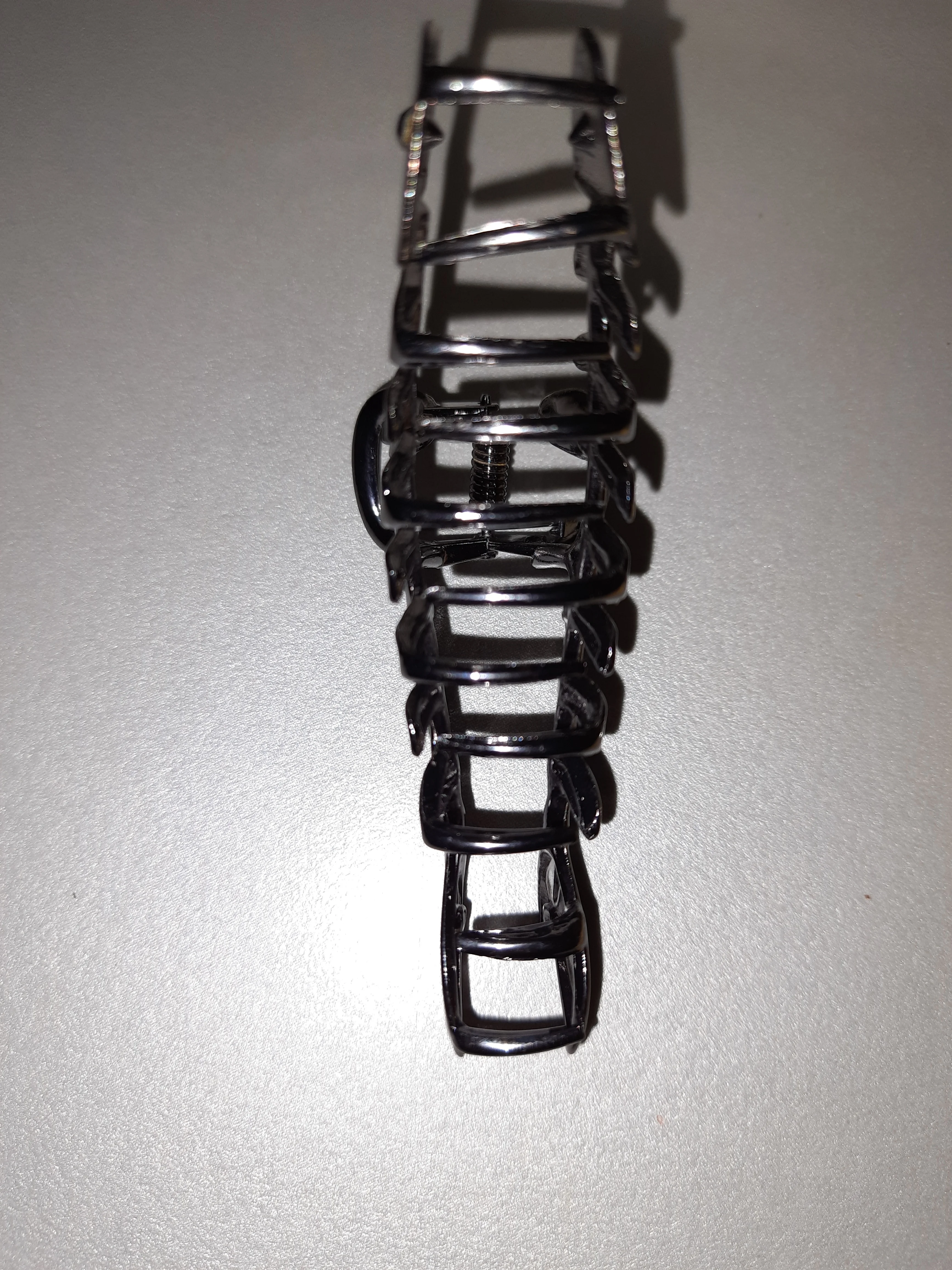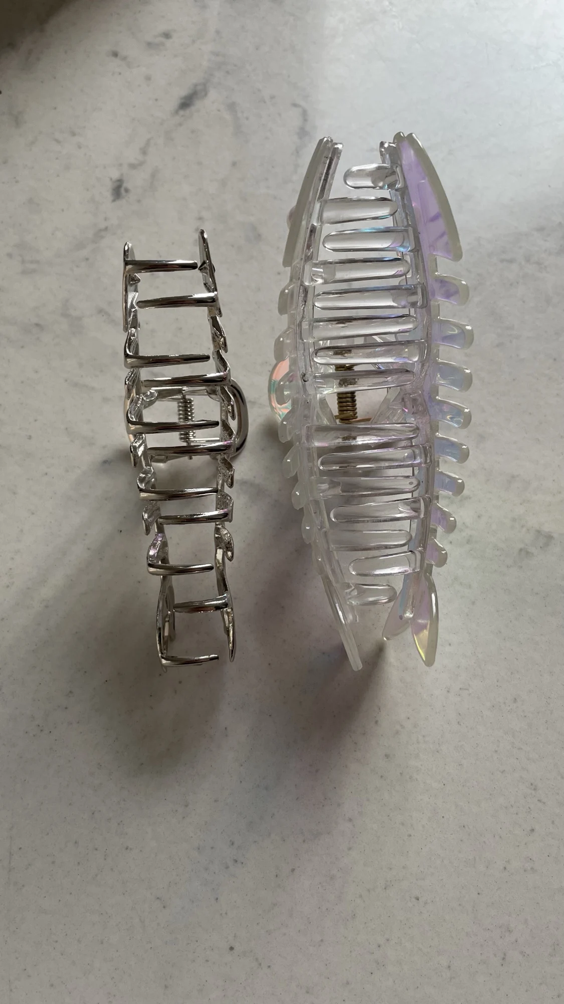 крепкая тяжёлая железная заколка. меньше чем я ожидала, но на средние густоту и длинну пойдёт. пластиковая заколка в длинну 12см. железная 10 см.