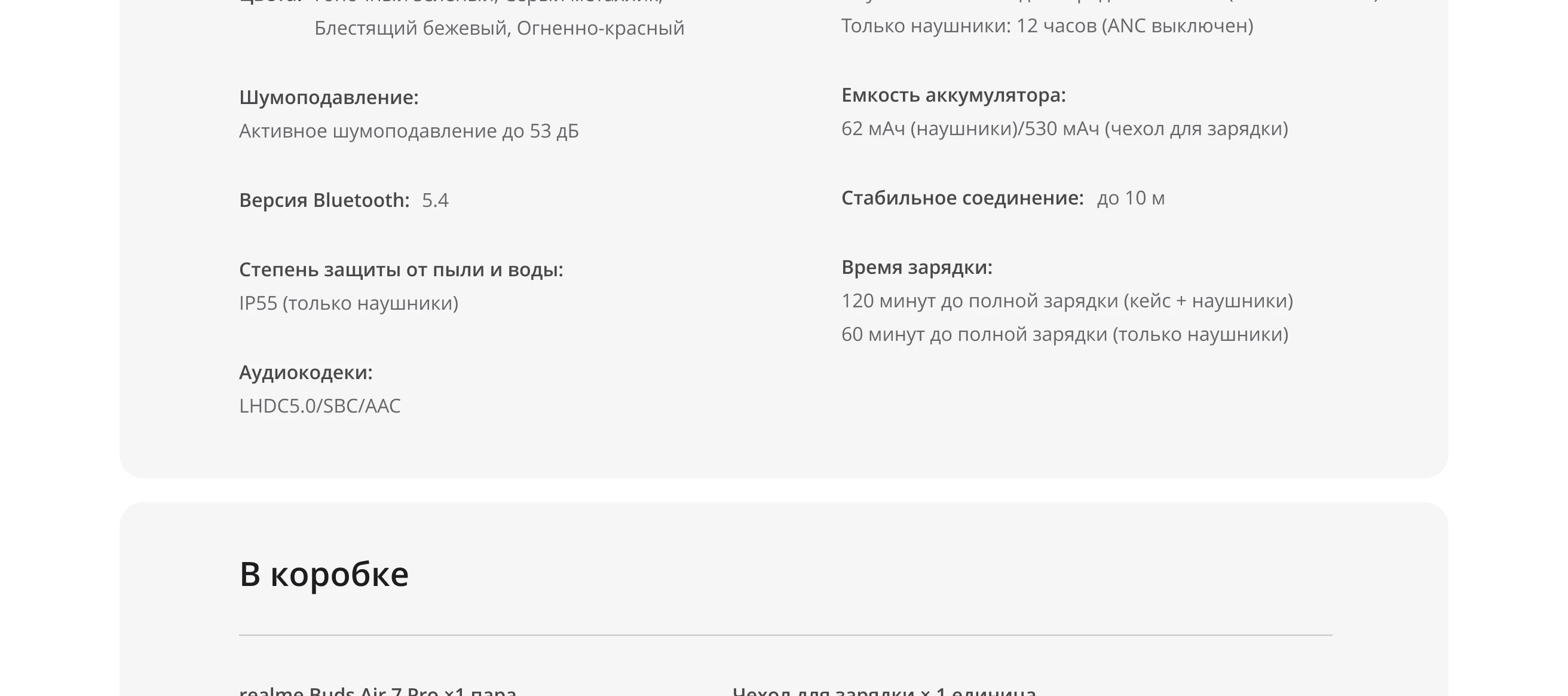 Только наушники (50% громкости, включен режим шумоподавления/прозрачности): 7,5 ч(AAC), 5 ч(LHDC)