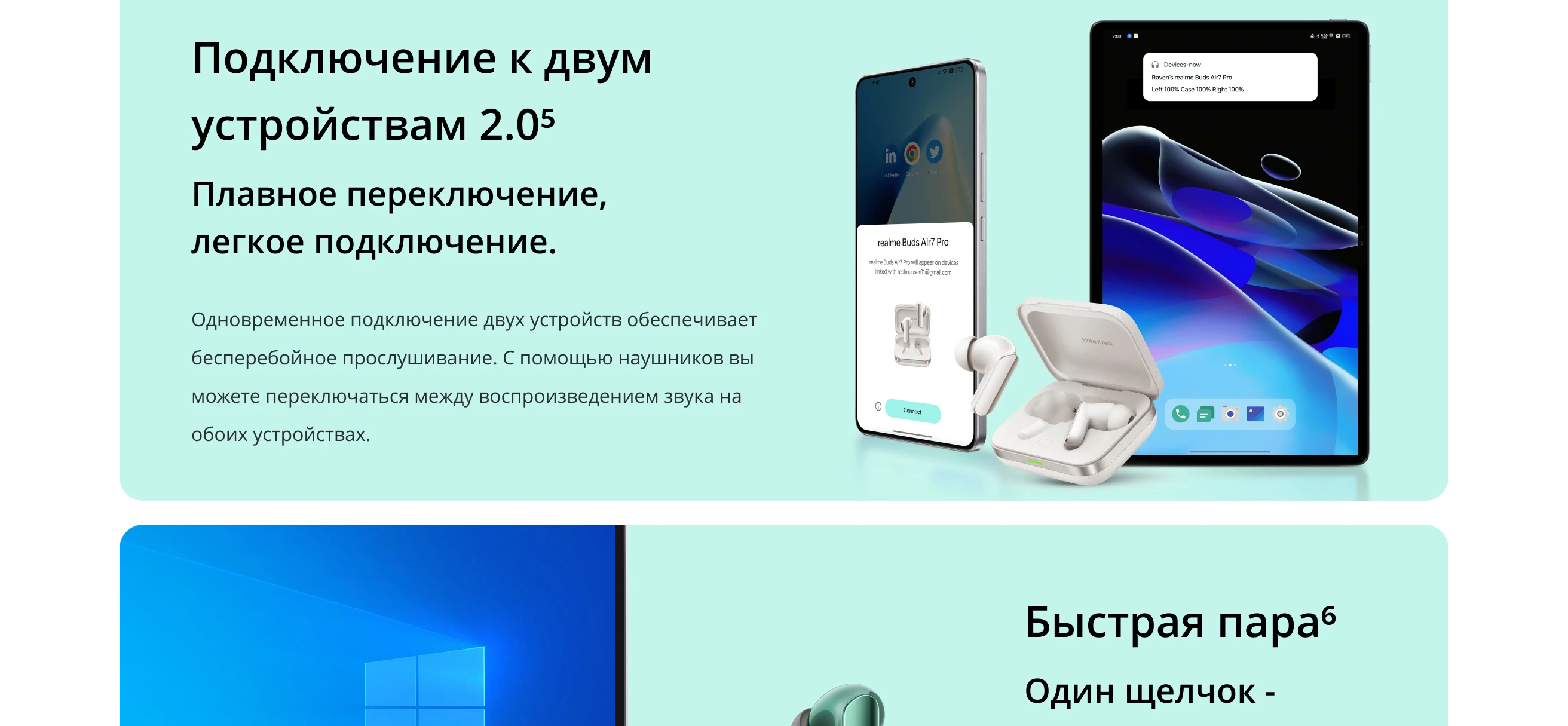 Бесшовный опыт: Swift Pair, подключение двух устройств 2.0, сверхнизкая задержка 45 мс