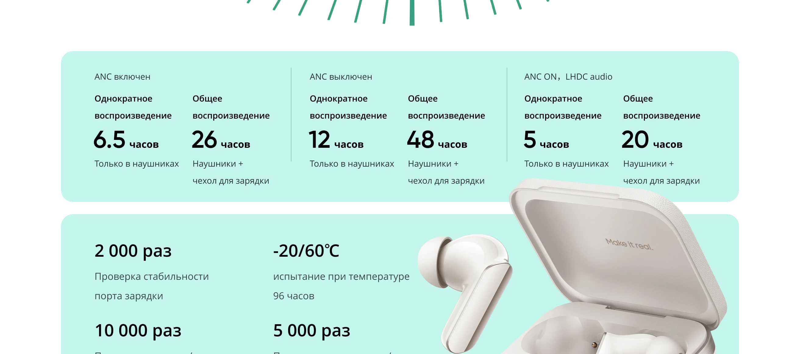 Наушники + чехол для зарядки (50% громкости, нормальный режим включен): 48H (AAC), 28H (LHDC)