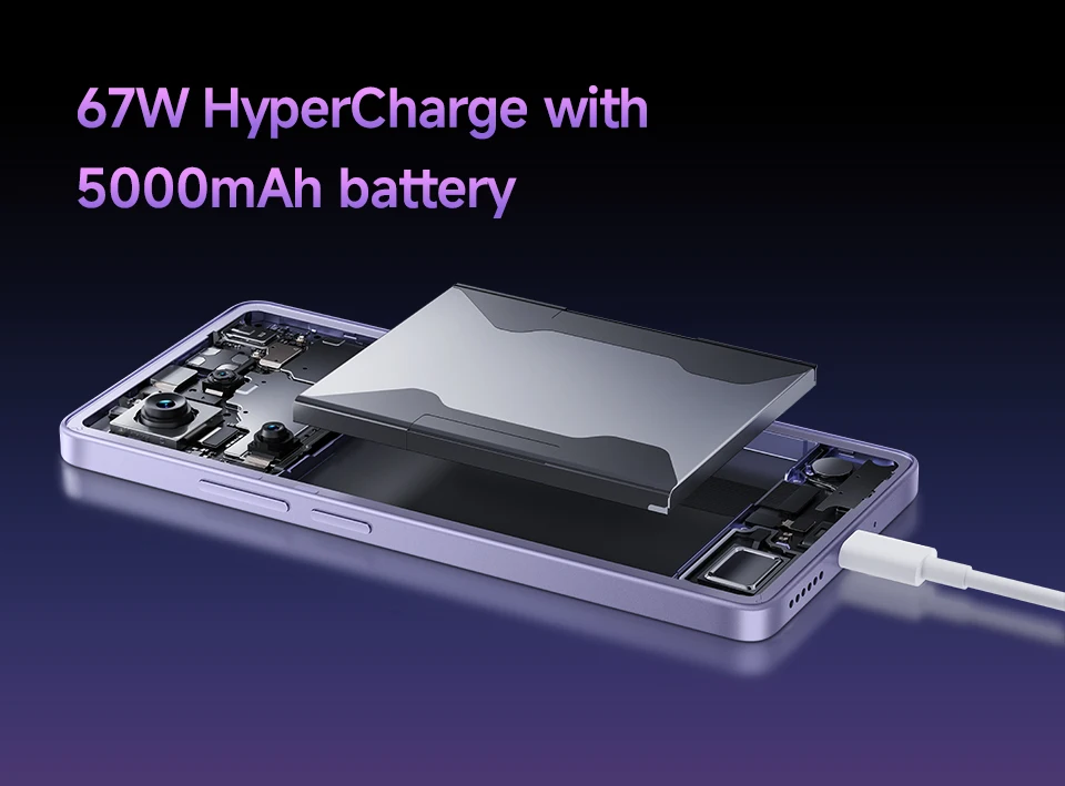 5000 мАч (тип), поддержка гиперзарядки 67 Вт, встроенное зарядное устройство 67 Вт.