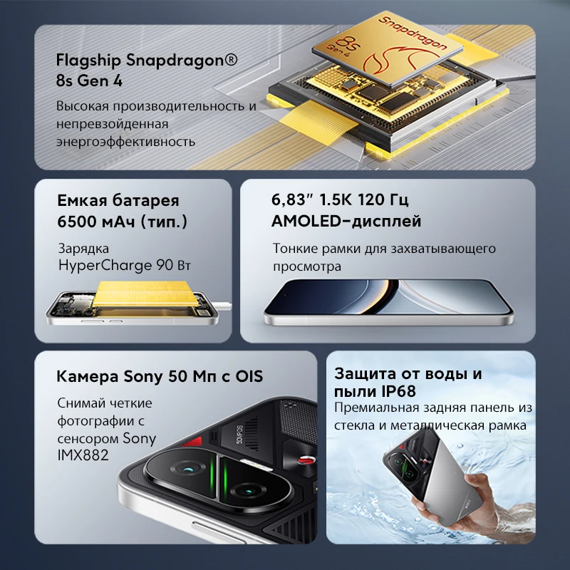 ОС-----------Работает от Xiaomi HyperOS 2, поддерживает несколько языков и Google Play, встроенный датчик отпечатков пальцев, разблокировка лицом AI, защита от пыли и воды IP68, двойные динамики