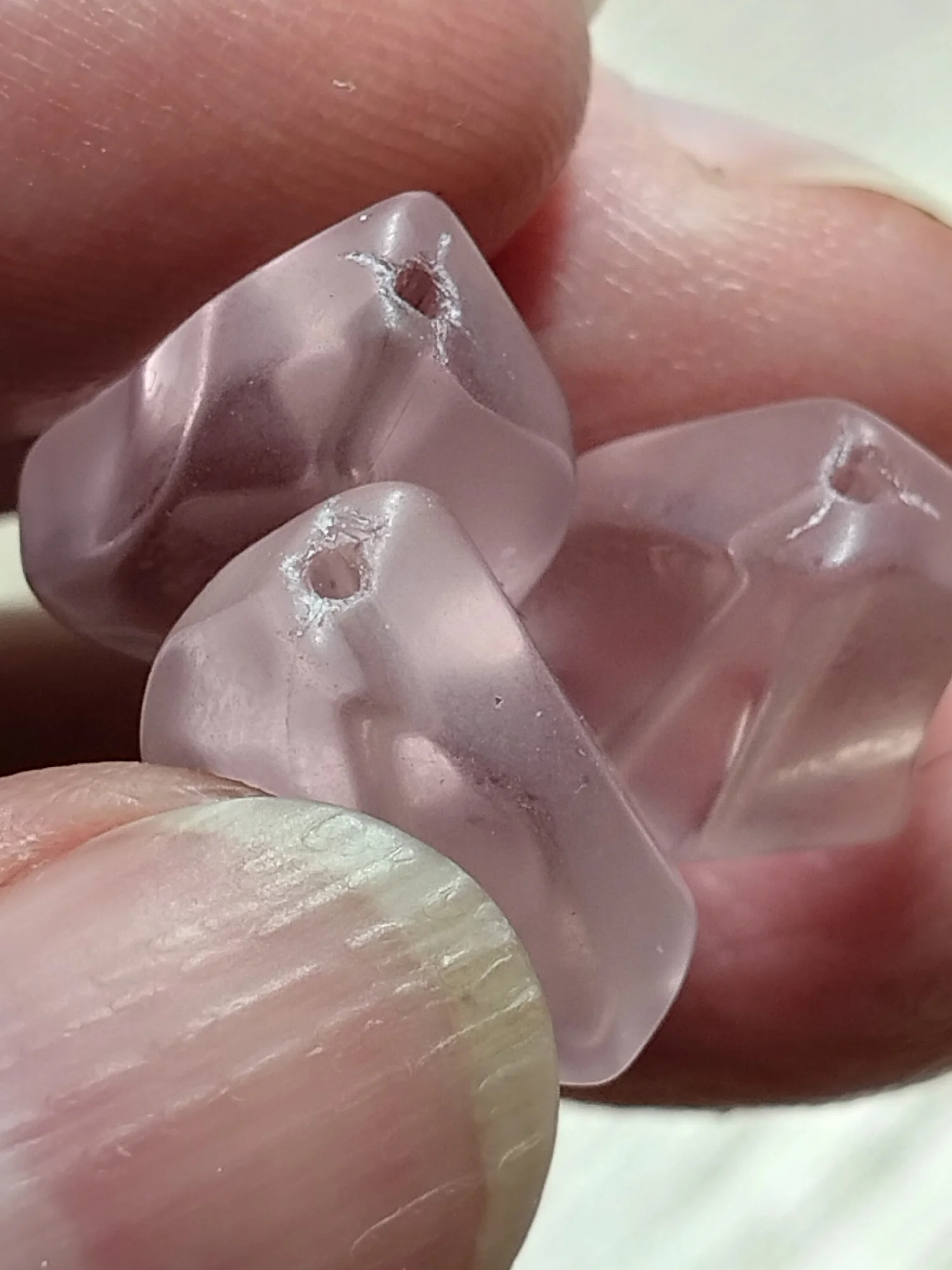 Купила эти бусины в двух цветах.Розовые понравились. Есть нюансы. На одной бусине скол и у многих бусин неаккуратные отверстия. А вот двухцветные бусины все 10 бракованные.