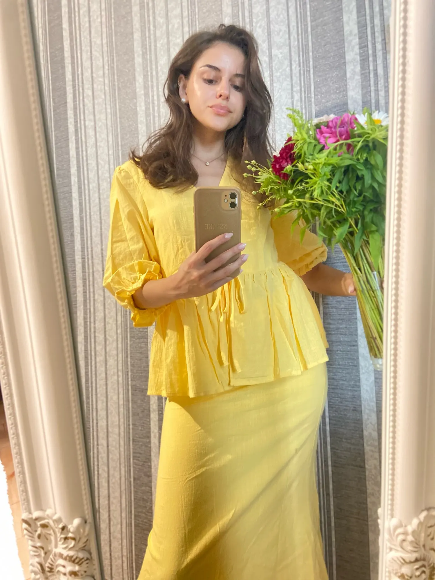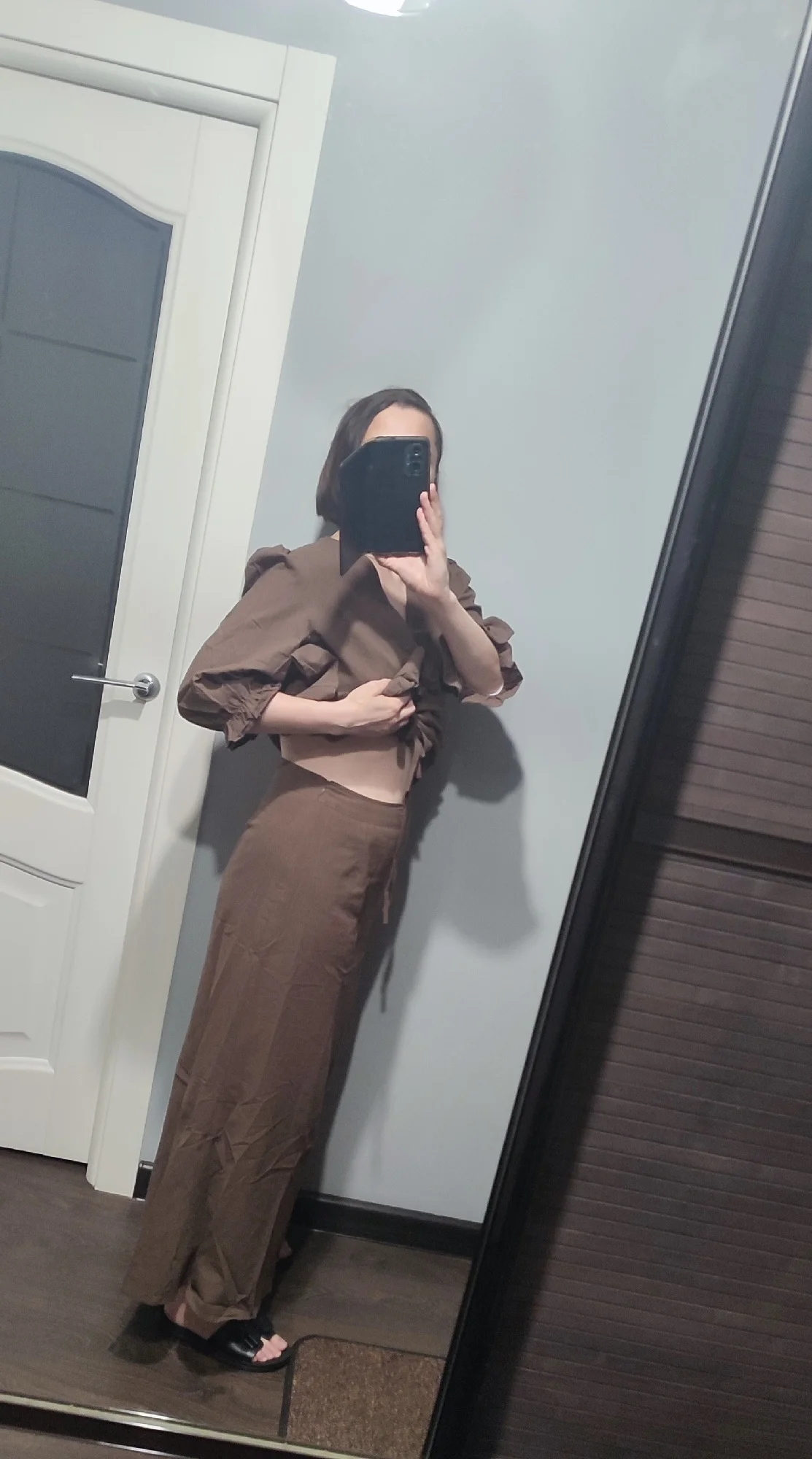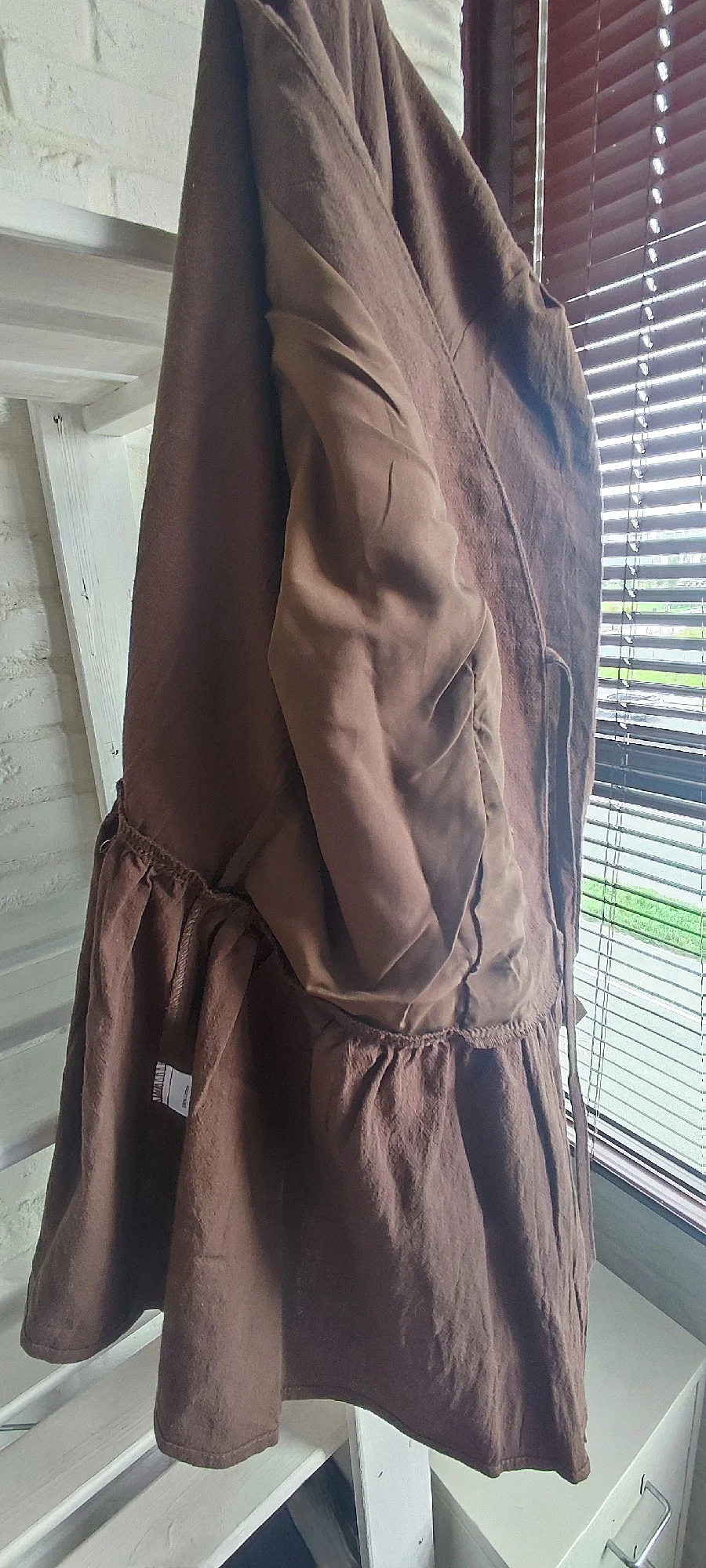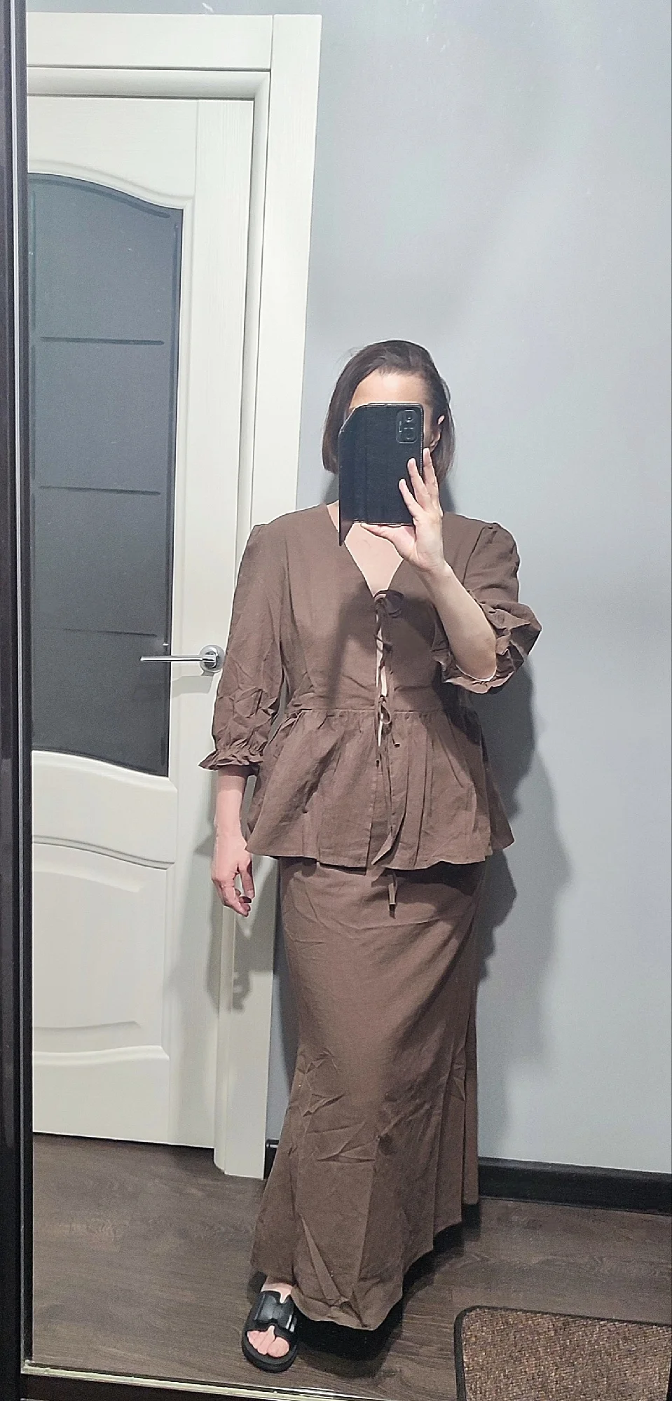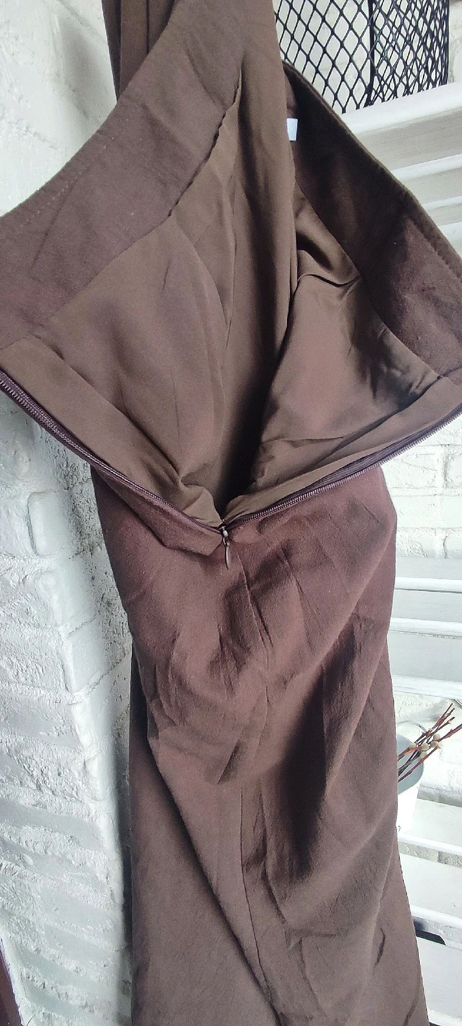 За 25 дней в Петрограде. Цвет не соответствует - не тёмного шоколада, как на фото продавца, а молочного, рыжее. Пошив неплохой, были нитки, кое-где неидеальные стыки по швам. Ткань хлопок, плотный, приятный. На юбке почти донизу пришитый сверху подъюбник и на блузе вшитая спереди изнутри подкладка синтетическая - материал тоненький и мягкий, надеюсь, нежаркий. Без подкладки, скорее всего, будет просвечивать. Юбка размера Л на молнии сбоку: от 76 см, об 108 см, длина 94 см. Блуза размера Л: ог 100 см, от 90 см, длина по спинке 61 см, длина до баски 40 см. Продавец отвечал, но советовал мне М на мои параметры, но люблю посвободнее и заказала Л - то, что надо: словно на меня шили. Сидит чуть свободно, но меньше мне не надо однозначно...не люблю, когда куце и тесно и в обтяг. Мои параметры: 94-74-103 см/163 см-63 кг. Со скидкой довольна. Единственное, цвет хотела темнее и оборку на рукавах уберу до резинки (не тугая) - перебор для меня. Без лифа, топа носить не буду - завязки рискованные.