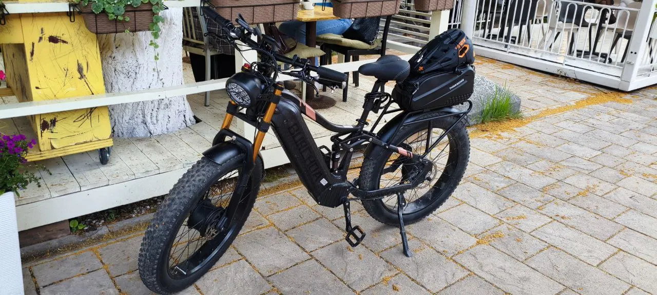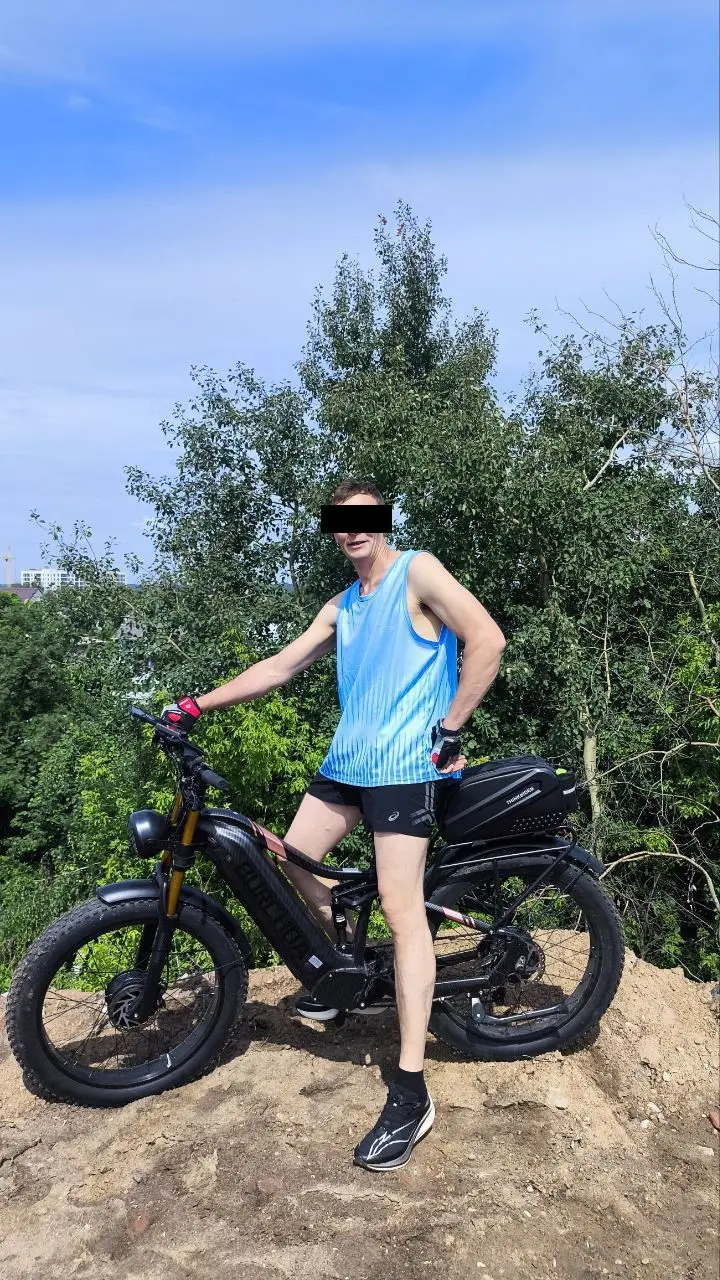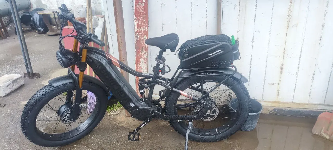 Ну вот и дошли руки до отзыва. Я являюсь счастливым обладателем этого чуда техники две недели. Эти две недели я каждый день ездил на работу/обратно и не только, накопились впечатления. Хочу сразу оговорится, что все мои наблюдения и оценки исходят из моей любви к технике, и объективного восприятия соотношения цена/качество. Если вы из тех, кто хочет купить новый мерседес за 100$ и без обмана, смело листайте дальше. Мощность: благодаря роторным двигателям я пару раз преодолевал такое, где пешком бы не прошёл, влажные грунтовые подъемы под 40% (естественно педали+2 мотора), заболоченные топи (естественно педали+2 мотора), заливные луга после ливня (педали+передний привод). Тягу держит стабильно. Скорость: роторный двигатель урезает максималку априори, но держит скорость на любых доогах и подъёмах. Стабильные 45 км/ч, с горки 52 км/ч максимум. Комфорт: всё вполне себе хорошо, единственное что изменил – переставил органы управления под себя (тормоза, переключатель скоростей, управление компьютером и прочее). Сиденье комфортное, подвеска отрабатывает на твёрдые 4+, резина нормальная (мягкая), багажник большой и прочный. Запас хода: 70 км в режиме PAS 3 (PAS 0 – PAS 5, где 0 – двигатель выкл, а 5 – полная мощность), примерно 50% - на переднем приводе, 40% - на заднем, 10% - на полном, в нормальном режиме работы аккумулятора, т.е. я оставляю около 15% заряда и не заряжаю выше 90%. Ах, да, чуть не забыл, дисплей хороший, читается отлично в энергосберегающем режиме даже в солнечную погоду, управление не то чтобы интуитивное и простое, но привыкаешь быстро. Параметры ездока: рост 195, вес 94 В подарок получены: велонасос, держатель для телефона, велозамок тросовый, набор ключей для сборки Однозначно рекомендую высоким и активным, велосипед тяжёлый, примерно 50 кг, не для ребёнка и не для девушки. Требуются права категории «М». Продавец постоянно на связи, помогает по всем техническим вопросам и не только. За эти деньги не нашёл ничего даже близко похожего. Счастлив как 14-ти летний пацан после секса))) Спасибо огромное!