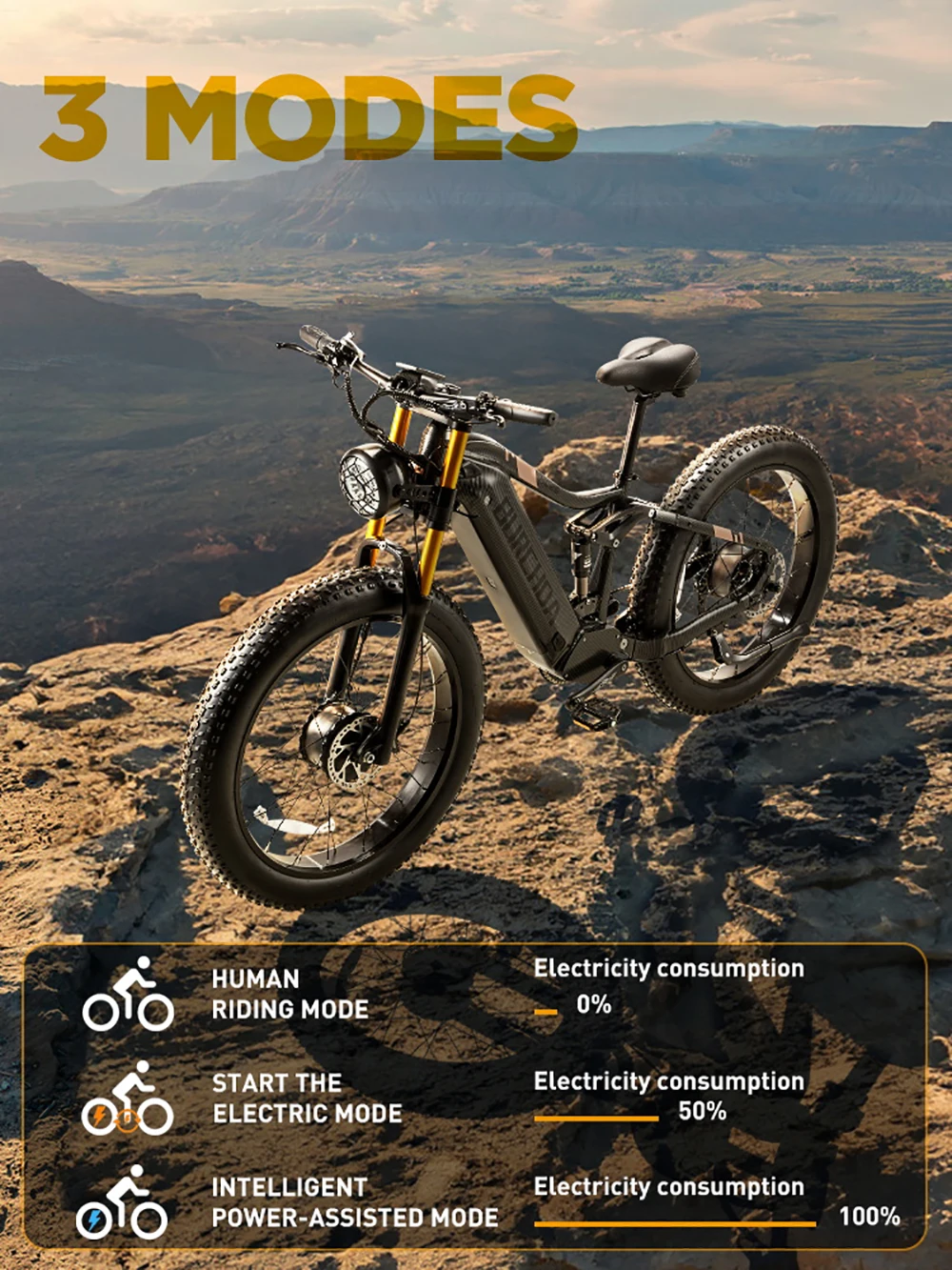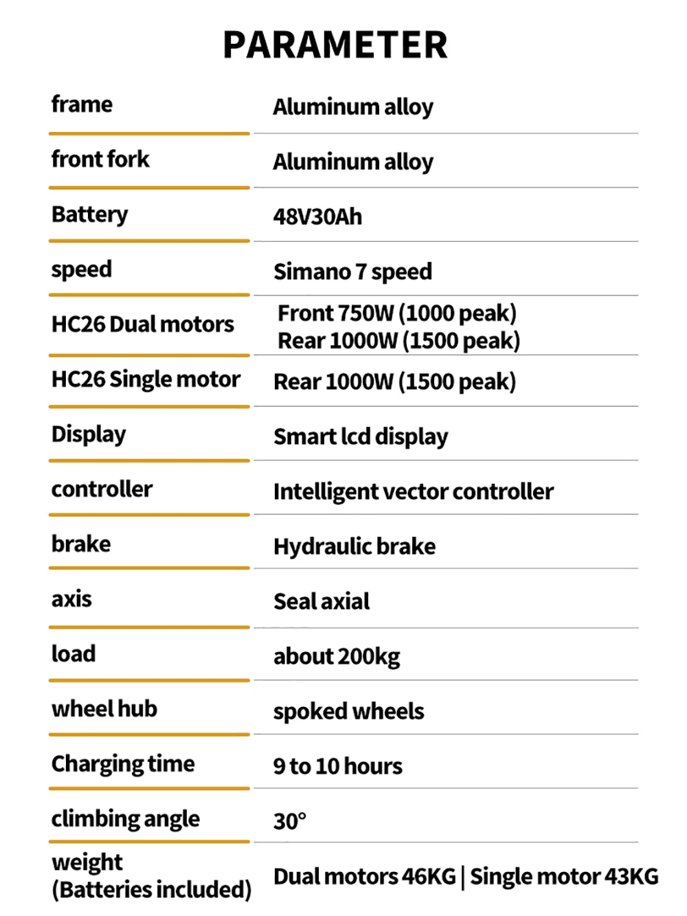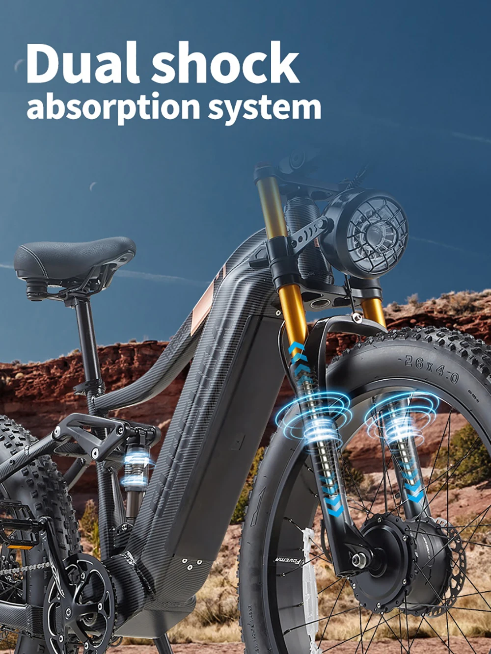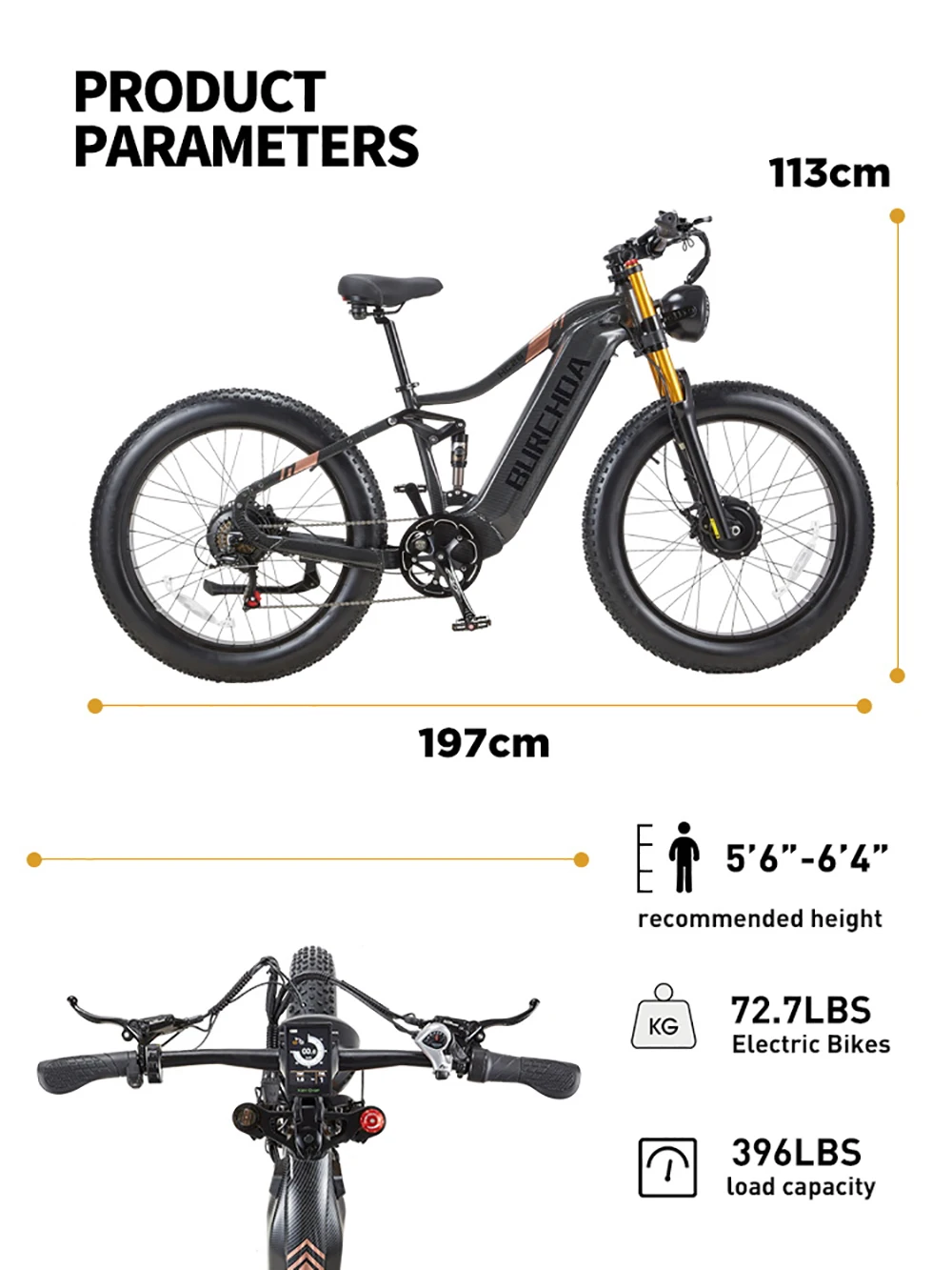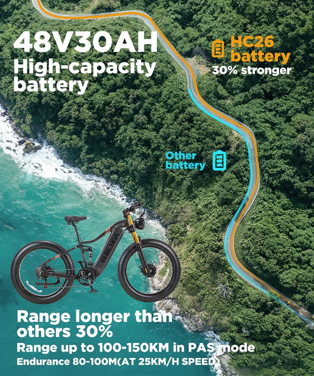 Бесщеточный двигатель мощностью 2000 Вт. Электрический велосипед BURCHDA HC26 оснащен мощными двойными двигателями с пиковой мощностью 2500 Вт, которые могут легко помочь вам путешествовать со скоростью 50 км/ч и обеспечить сверхмощность, позволяющую покорить каждую дорогу в путешествии.