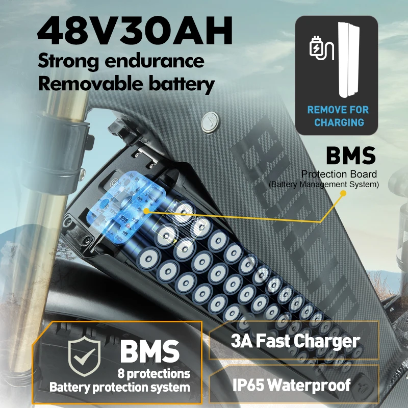 Съемный литий-ионный аккумулятор 48 В, 30 Ач. Этот электрический велосипед оснащен аккумулятором емкостью 30 Ач, аккумулятор большой емкости может работать до 70-80 км при полностью заряженном синтезе с временем зарядки составляет 10 часов.Дизайн.