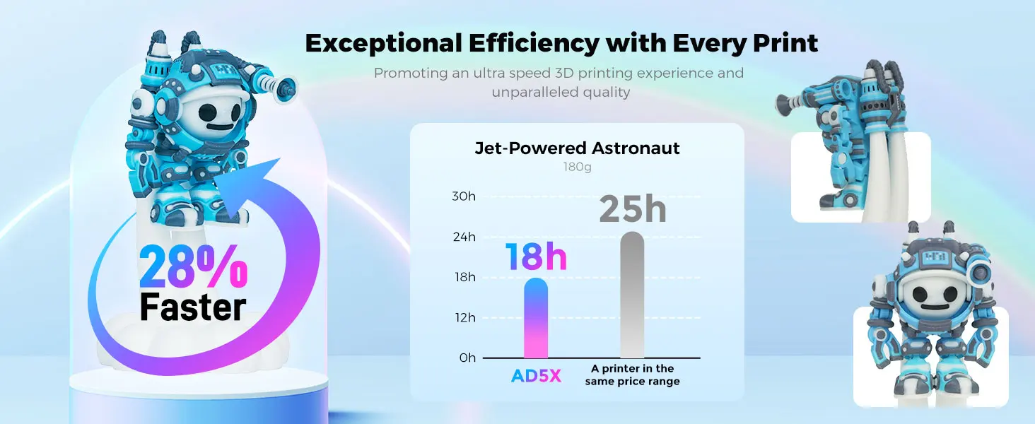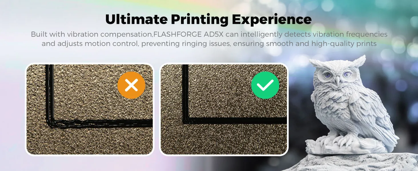 FLASHFORGE AD5X, созданный с учетом компенсации вибрации, может интеллектуально определять частоты вибрации и регулировать управление движением, предотвращая проблемы звонка, обеспечивая плавную и высококачественную печать.