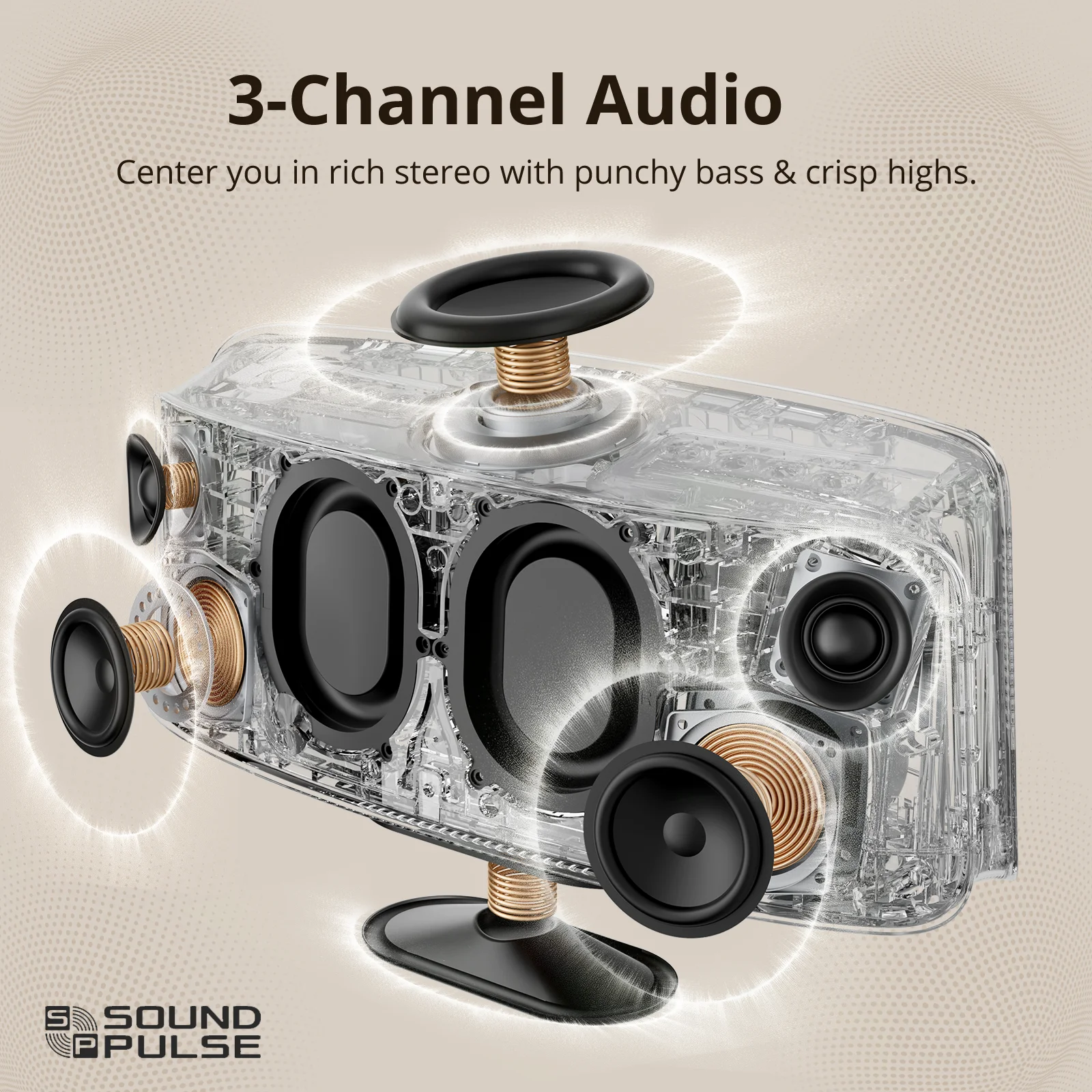 Конструкция низкочастотного динамика в форме гонки внизу, а также 2 средних частот и 2 твитера с каждой стороны создают всенаправленное поле объемного звучания для более широкой звуковой сцены и более захватывающего прослушивания.