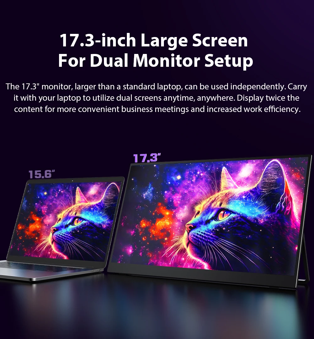 17.3-дюймовый портативный монитор для ноутбука 2K Наслаждайтесь высоким разрешением 2560 x 1440p на 17,3-дюймовом IPS-экране, что обеспечит более четкое, реалистичное и яркое изображение.Матовый экран отлично защищает от отпечатков пальцев и устраняет проблемы, вызванные отражением.