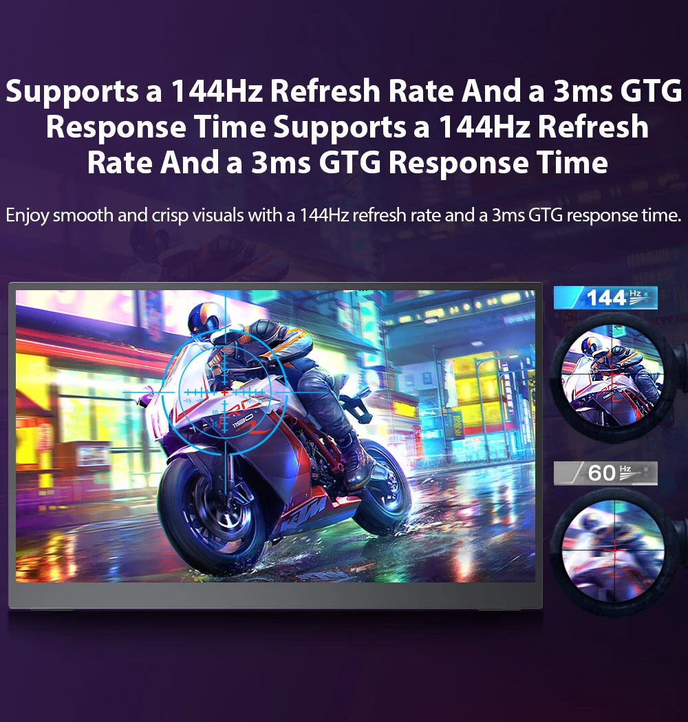 Портативный игровой монитор 144 Гц Испытайте идеальные игровые визуальные эффекты с частотой обновления Truly 144 Гц, которые помогут вам улучшить все ваши игровые квесты;Оснащен технологией FreeSync и функцией HDR для устранения разрывов и заиканий изображения для более высокой четкости движения и более плавного игрового процесса;Фильтрация синего света, антибликовая конструкция и отсутствие мерцания минимизируют нагрузку на глаза.