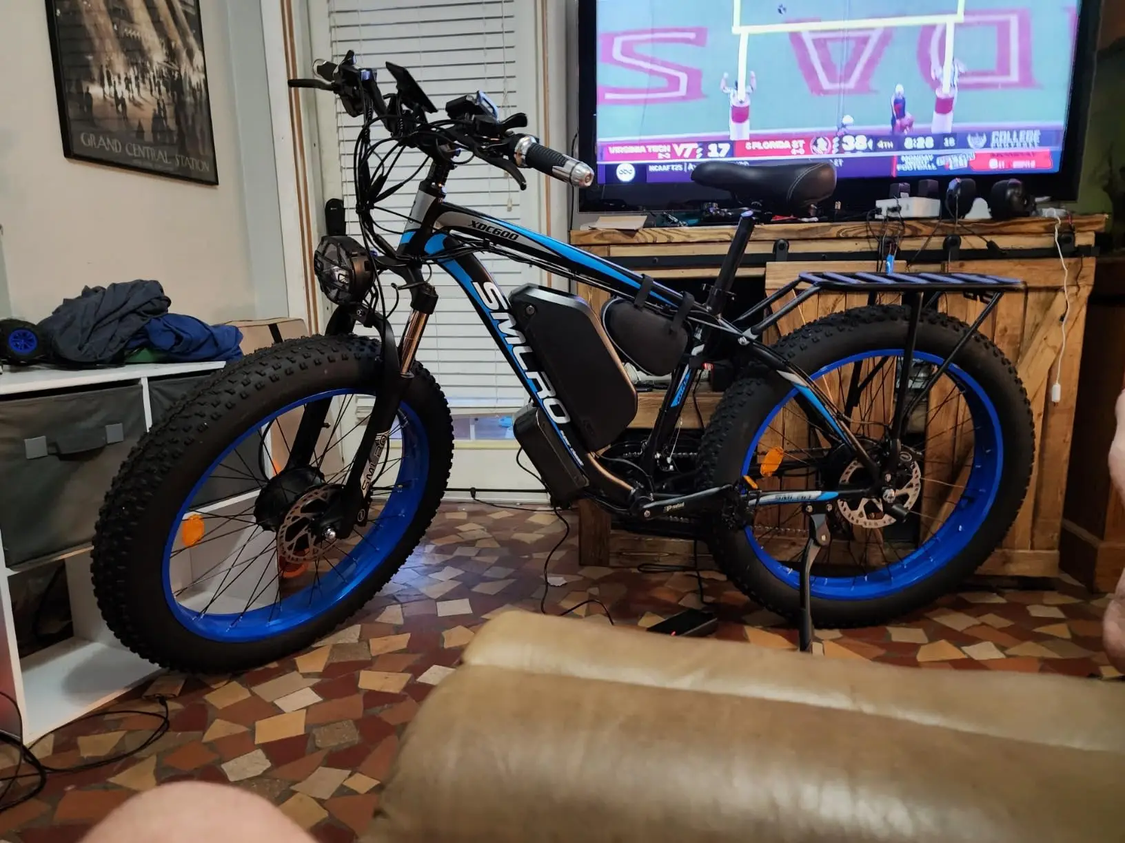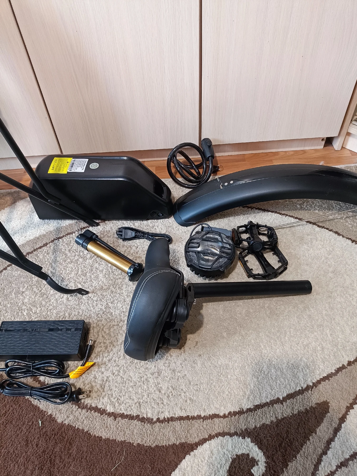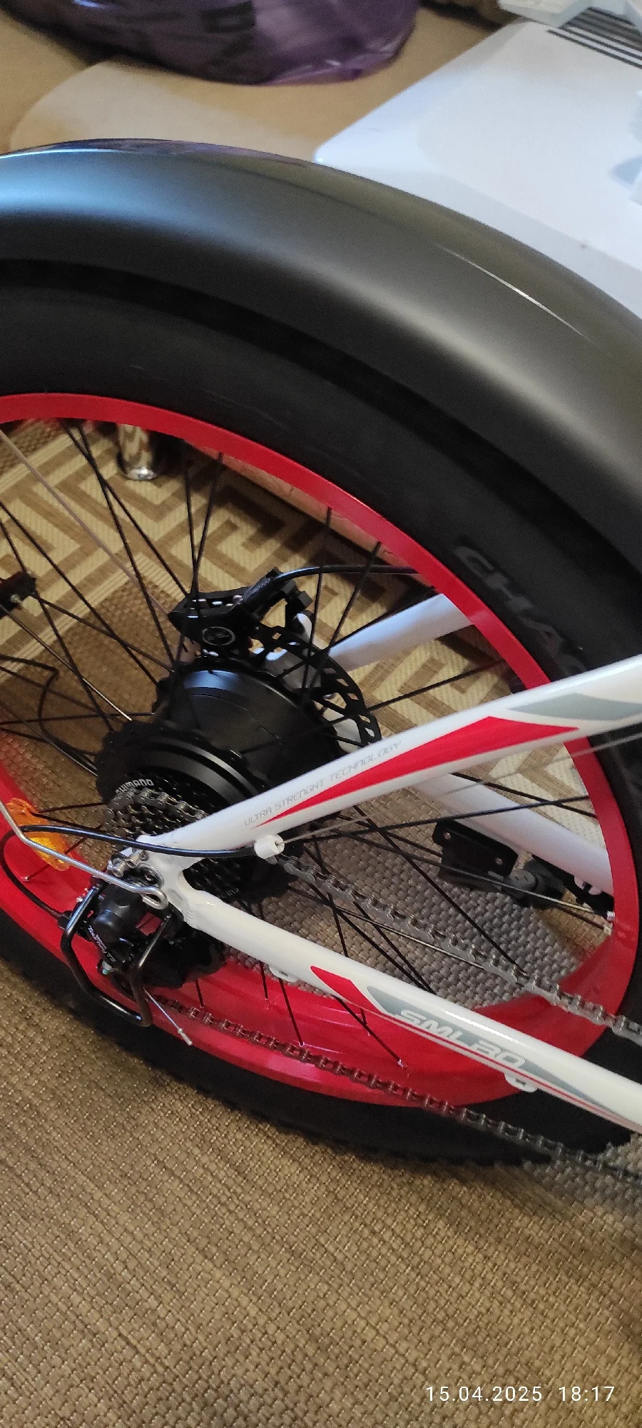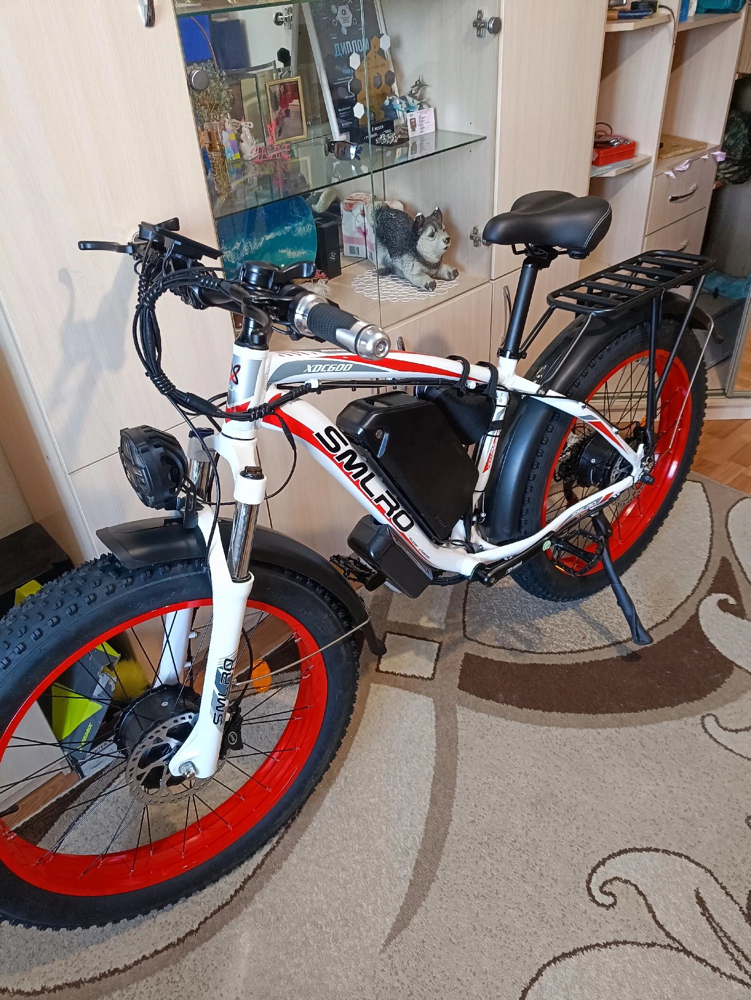 Велик пушка. сборка простая прикрутить колесо руль багажник всякую мелочь. на два вд бежит 60 км в час правда батарея разряжается соответственно быстро. Точно не замерял но думаю километров 15 пробежит на полном если ехать км 30 в час то само собой больше. и на коле́сах небольшой дисбаланс совсем не большой. в целом доволен !!!