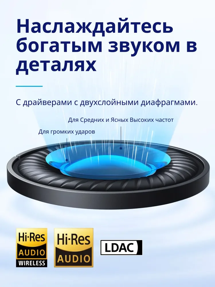 Наслаждайтесь звуком с новыми уровнями детализации благодаря инновационным двухслойным диафрагменным динамикам Bluetooth-наушников Space Q45.Бас расширен для дополнительного удара, вокал насыщенный, а высокие частоты четкие, что позволяет свету каждый слой песни.
