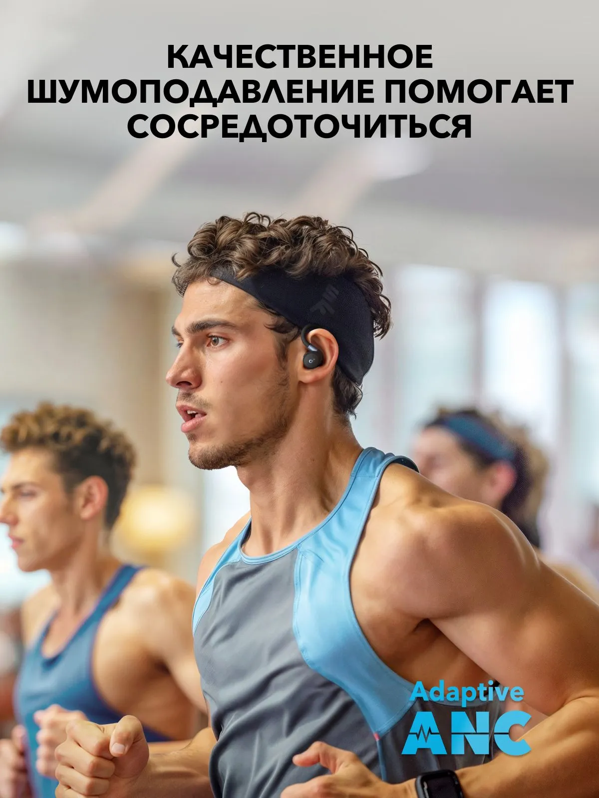 Автоматически блокирует звуки тренажерного зала, самостоятельно настроить уровень подавления внешнего шума с помощью приложения