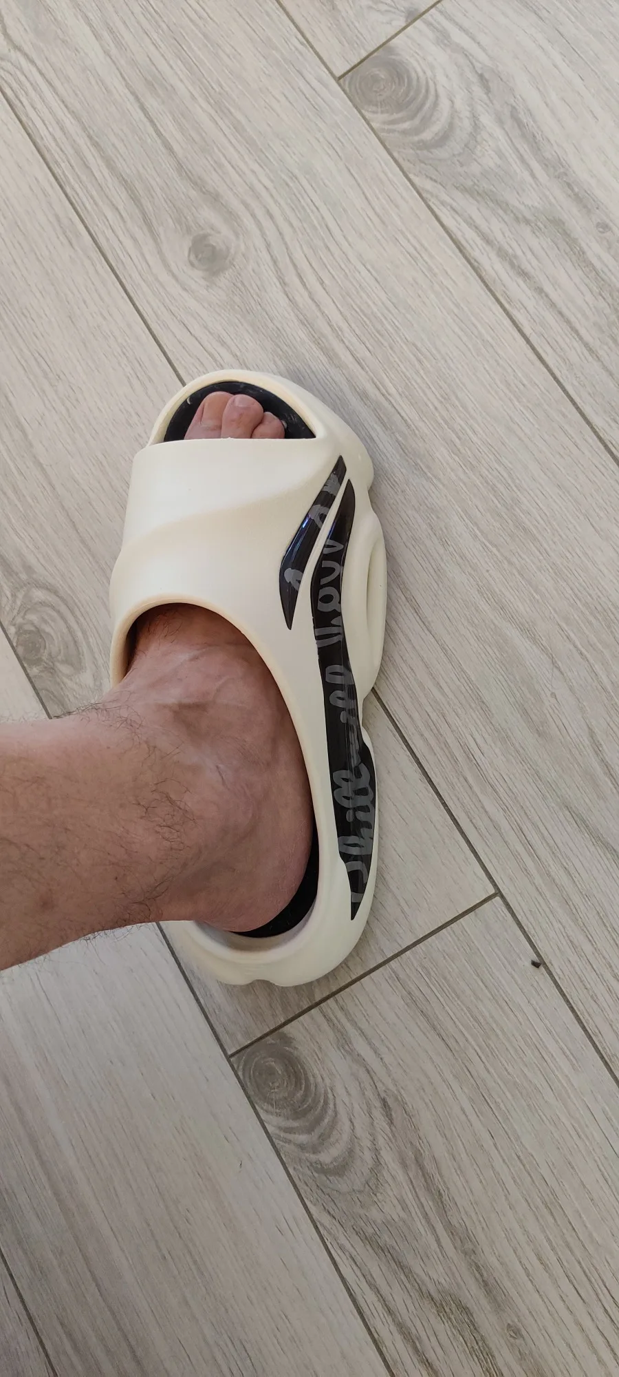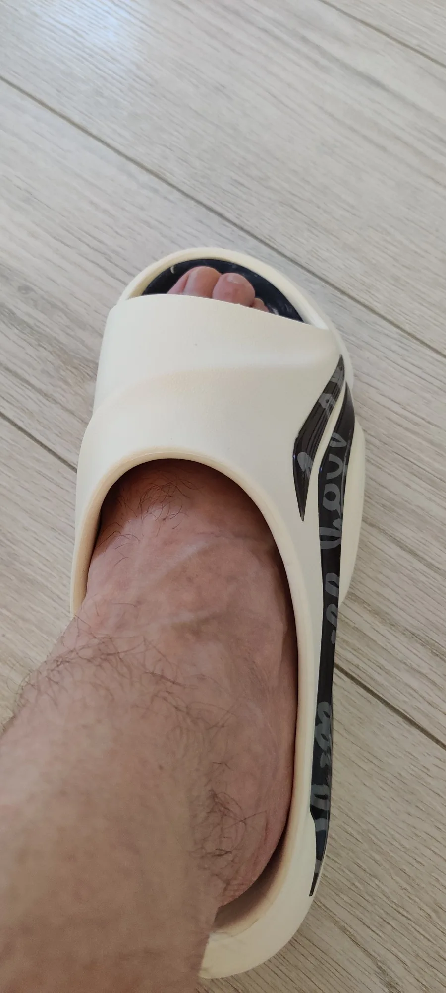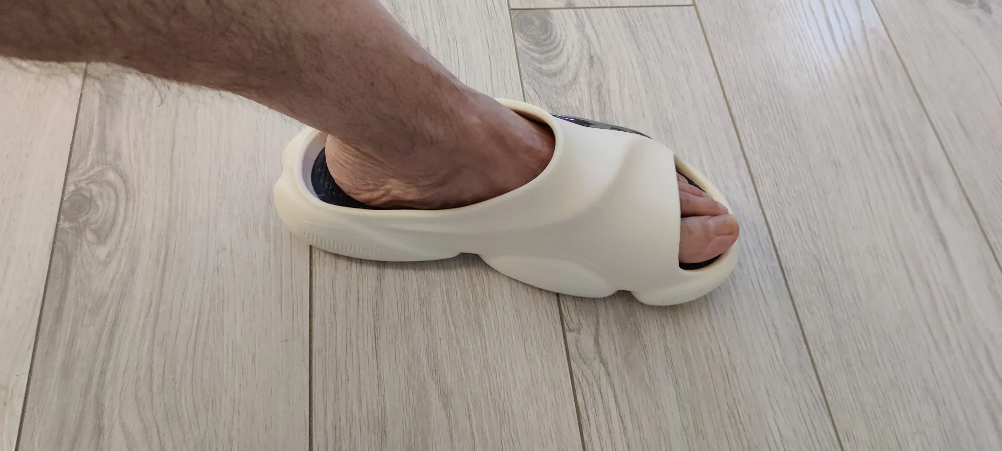 Размер соответствует. Снизу внутри другой материал. В жаркую погоду немного преет в месте прилегания, само-собой. Как кто-то уже писал, ощущение, что можно в них побежать и они не слетят. Ещё амортизирующий эффект хороший, как в кроссовках практически. Доставка вроде быстрая