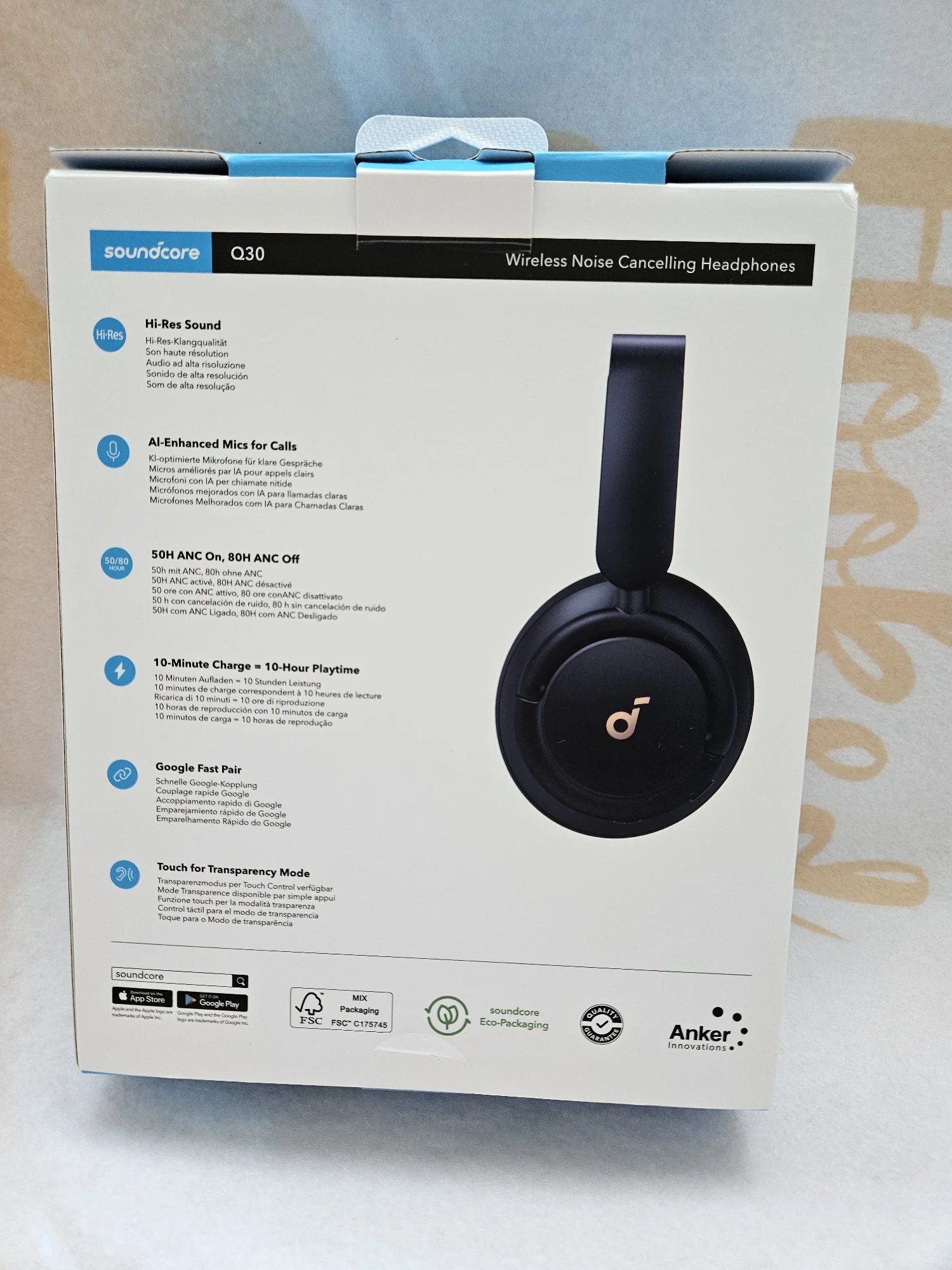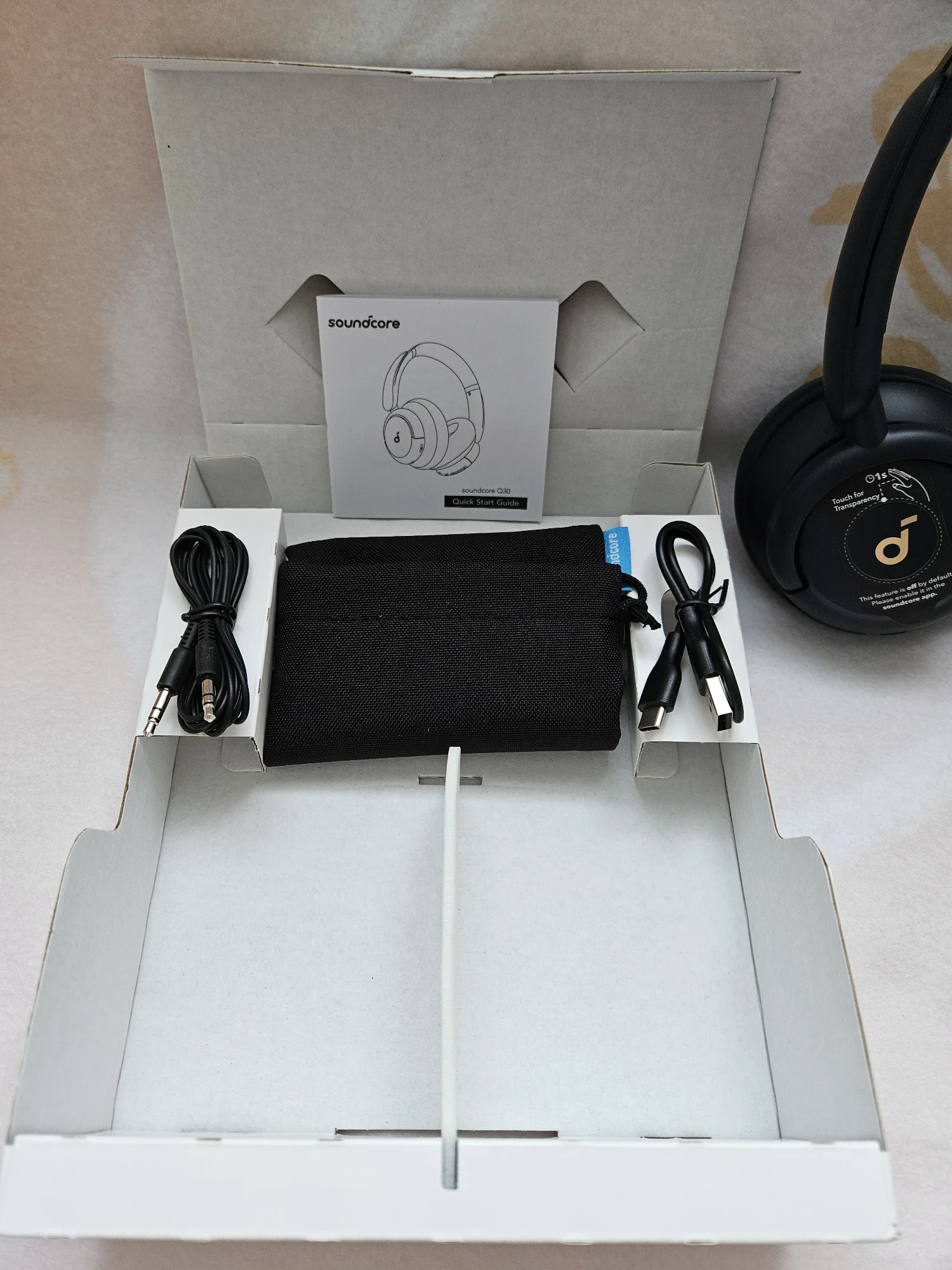 Я просто в шоке от этих наушников. От их качества сборки, от дизайна, от качества звука, от функционала и от приложения-компаньона. Жалею что раньше не решался потратиться и купить что-то подобное. Раньше пользовался только затычками Soundcore R100 и накладными JBL BT510. После покупки данных Q30 можно отложить затычки до зимы, а BT510 выкинуть. По мелочам. 1)Упаковка достойная. Пакет + форменная пупырка для коробки. 2)Комплектация не стандартная. Кабель Type-C, кабель 3.5 Jack для проводного подключения, что удивительно, маленький мануал и мешочек для наушников. 3)Доставка быстрая. До Уфы (РБ) доставили за 2 недели. Продавцу уважение🤝 Теперь снова балдею от любимой музыки😏