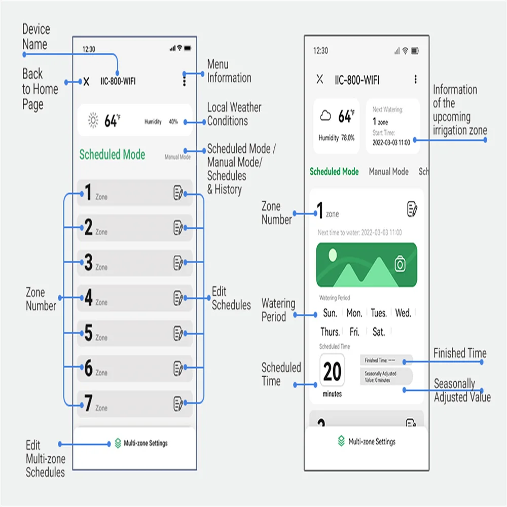 Сезонная регулировка: IIC-800-WIFI оснащен функцией регулировки сезонных изменений, позволяющей нам регулировать продолжительность полива, которое мы запланировали, улучшая выживаемость растений при изменении сезона.