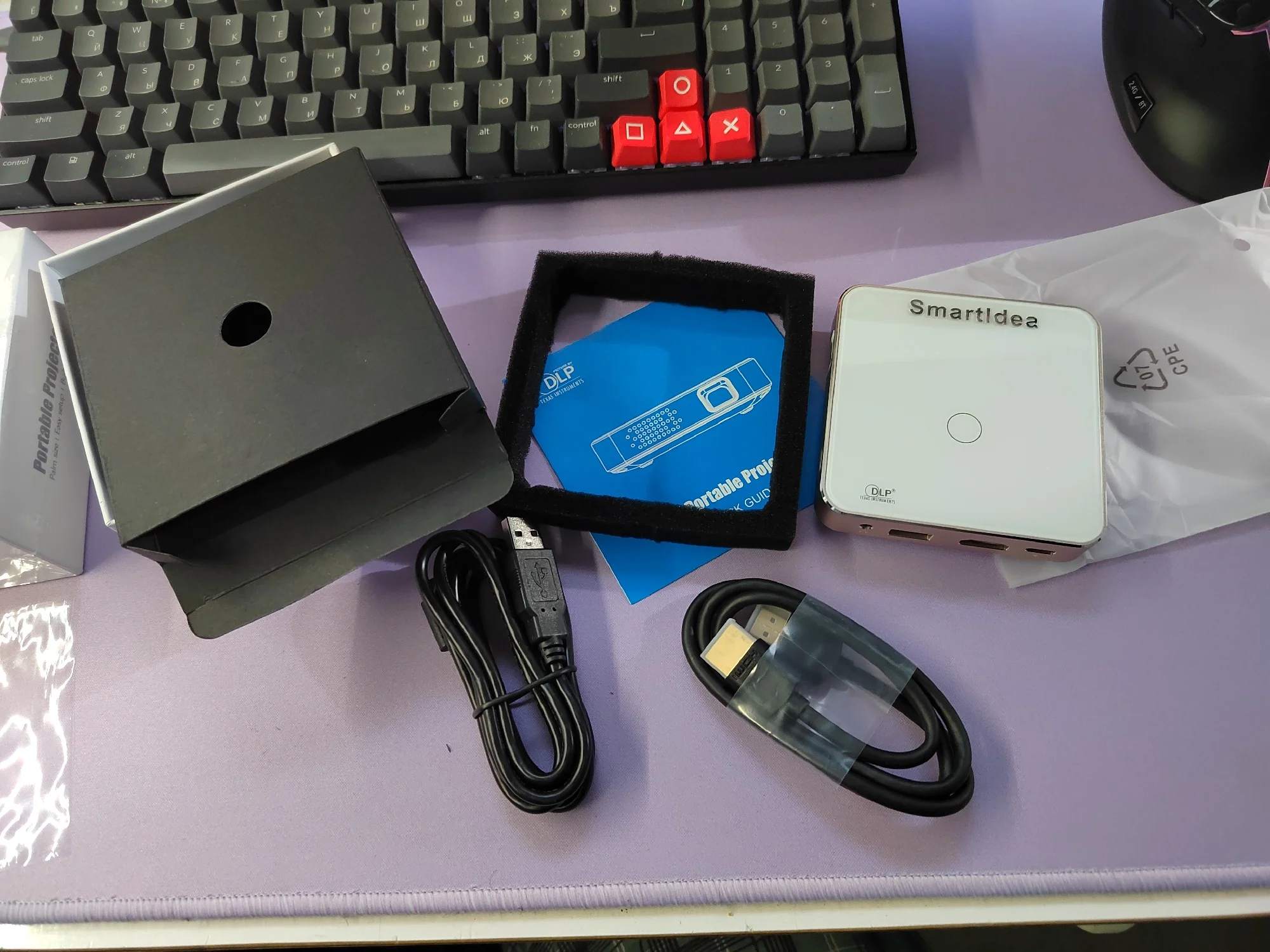 пришло быстро. упаковано в надувной мешок. покупкой очень доволен. маленький, легкий. брал что бы проецировать наброски для больших рисунков. видео пока не пробовал, фото на сд карту и показ фото. есть слайд шоу. в комплекте проектор, руководстао , кабель усб- усб тип с и HDMI кабель.