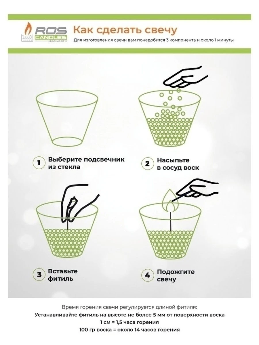 - Комплектация:Гранулированный воск; фитили; инструкция по применению