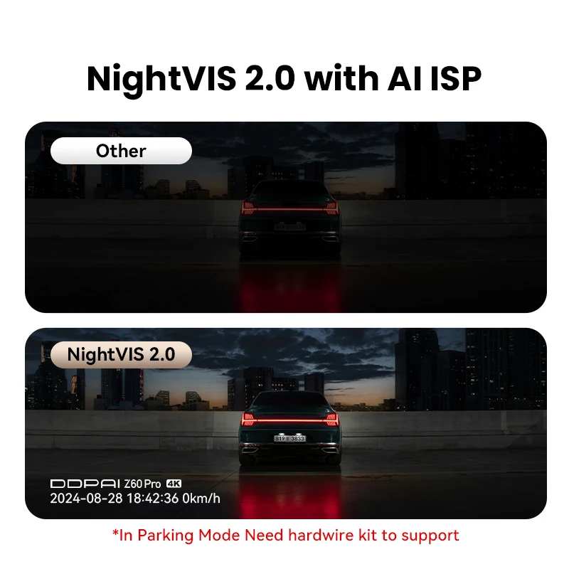 Z60 Pro, оснащенный передовой технологией NiqhtVIS 2.0 от DDPAl и обработкой изображений Al ISP, улучшает ночное видение для мониторинга парковки, обеспечивая более яркие и четкие кадры даже в самых темных условиях.