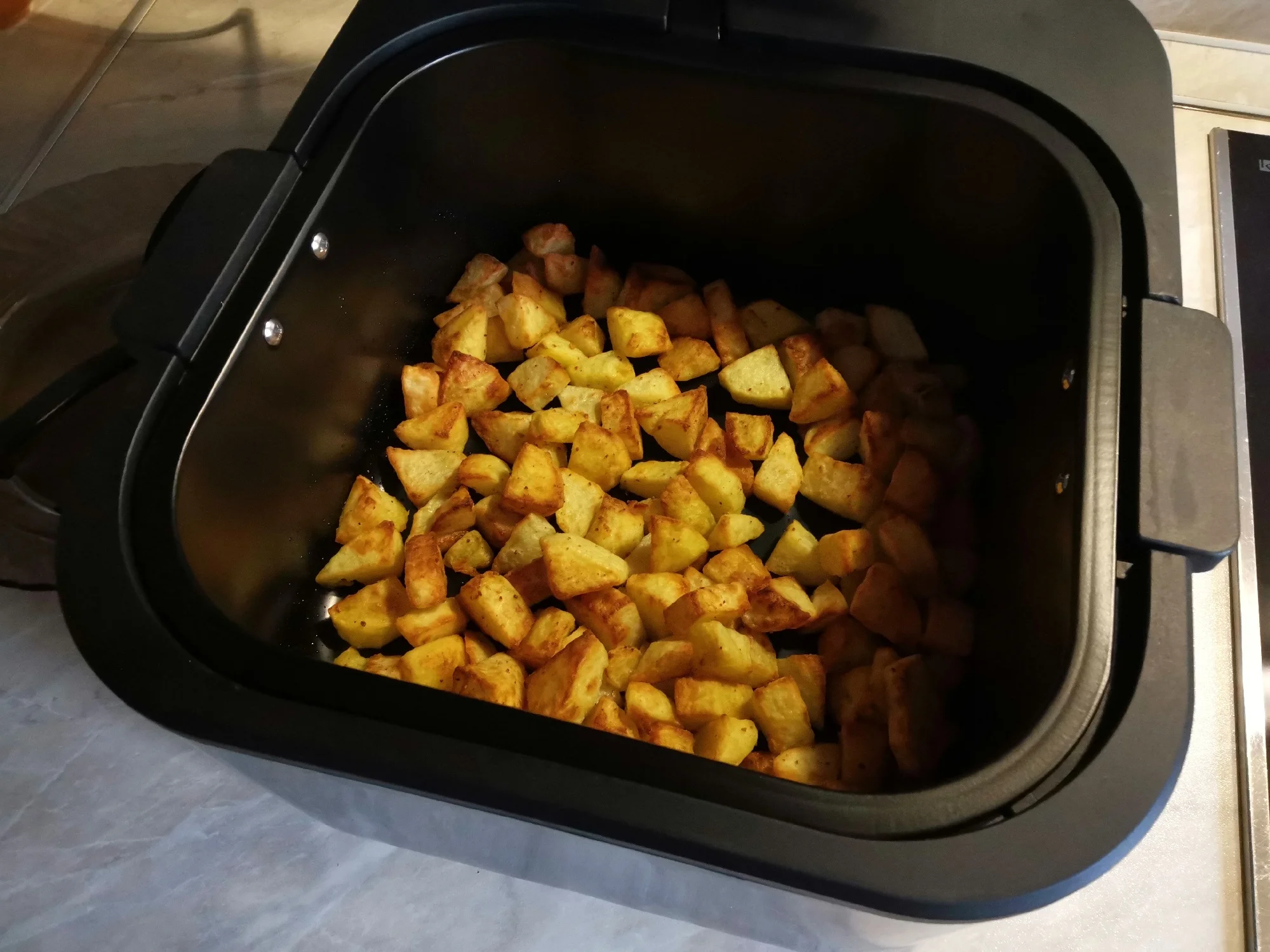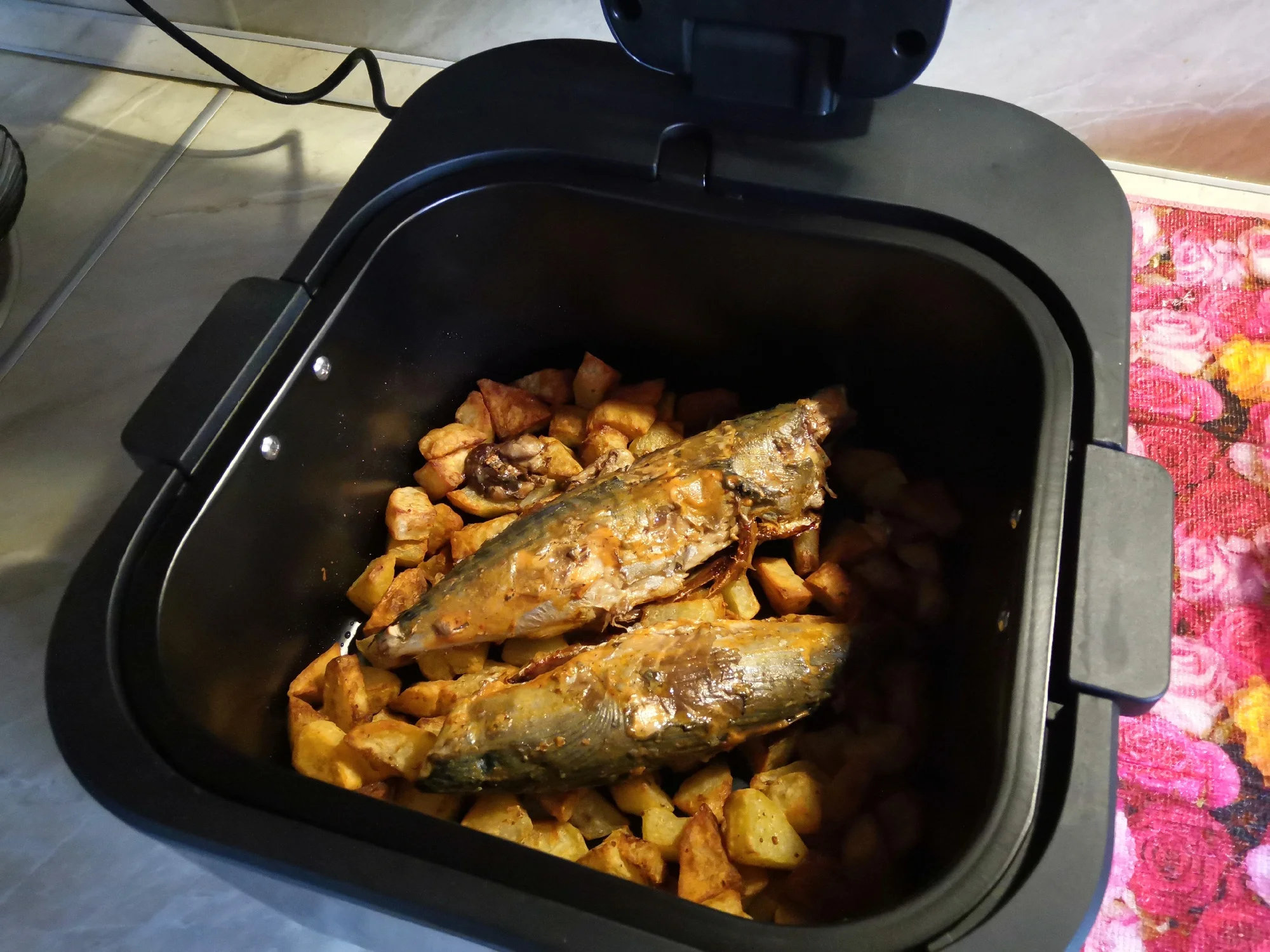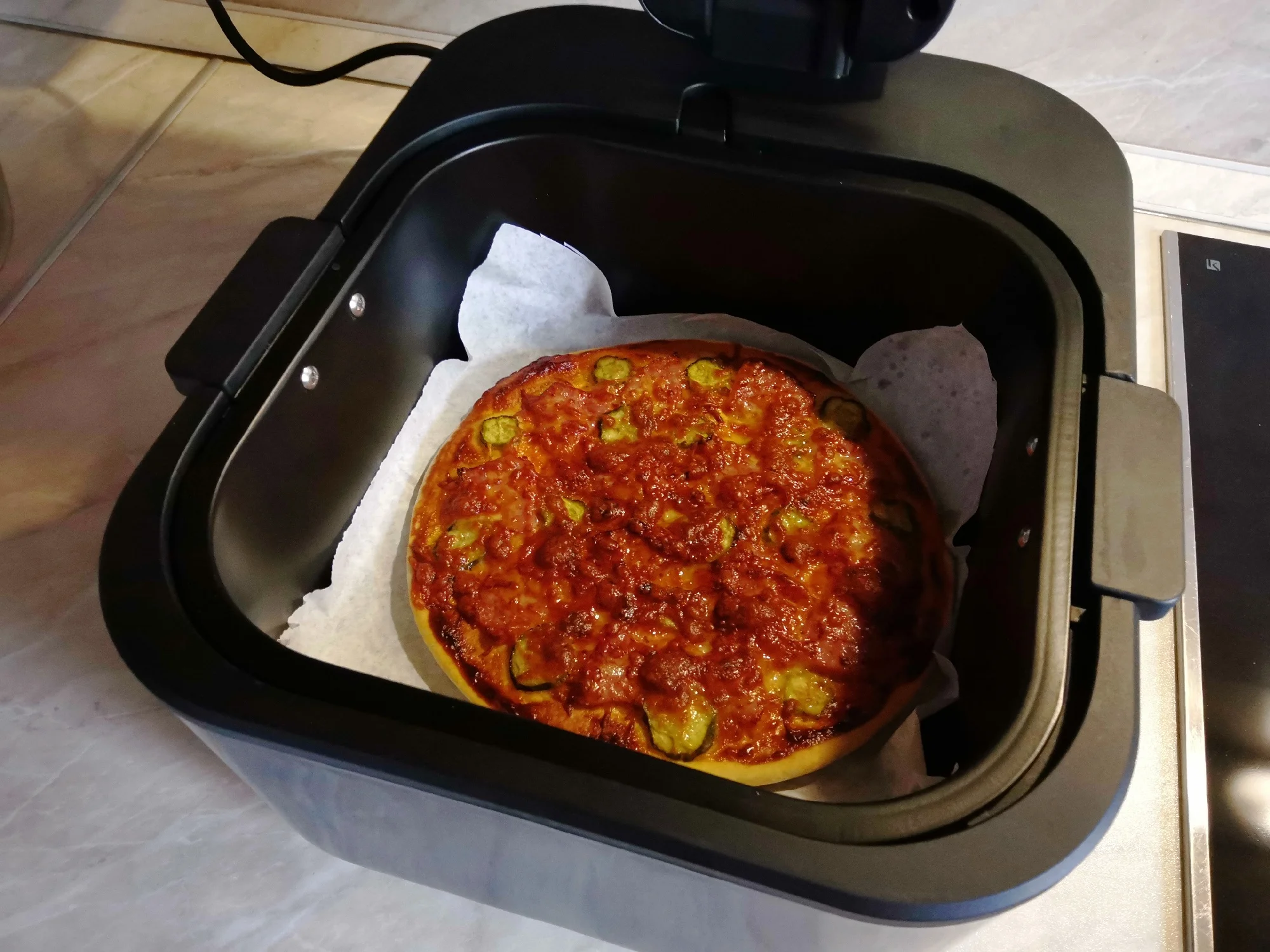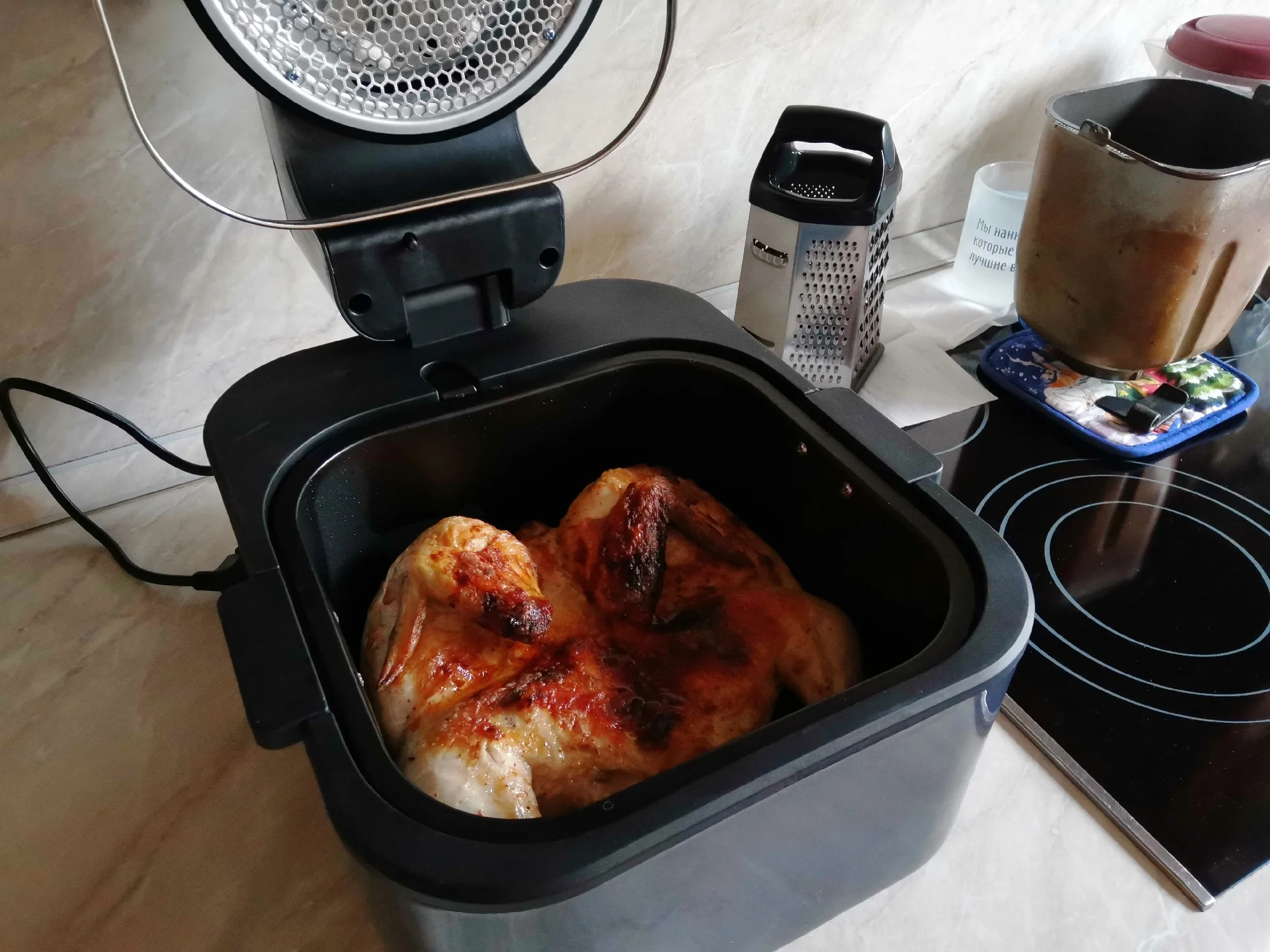 Получил данный аппарат-разобрал для профилактики(для меня стандартная процедура для всего что ко мне попадает). Вердикт: собран хорошо , запах пластмассы отсутствует. 1-приготовление: курица( не люблю больших курей,но меньше не нашел.1,3 кг.) маринад:сметана-майонез 50-50,30 минут. Заключение:курица получилась СОЧНАЯ ! 2-приготовление:картофель(без какой-либо обработки) с рыбой(скумбрия). Заключение:на ура! 3-приготовление:пицца(на пергаменте без масла). Заключение:вкусно(низ белый,без поджарки). 4-приготовление:пицца,без пергамента. Заключение:вкусно(низ с лёгкой обжаркой). 5-приготовление:булочки из песочного теста(без всякой обмазки,только сахар сверху). Заключение:отлично. Брал данный аппарат для курицы в дополнение аналогичному(у него обычный нагреватель,объем-3,5л.) Преимущества данного аппарата: 1-инфракрасный нагреватель. 2-стеклянная крышка(возможность контролировать процесс приготовления. P.S. Выбор температуры и времени приготовления индивидуально(исходя из параметров вашей электросети. ОГРОМНОЕ СПАСИБО и успехов продавцу!!!Аппарат отличный!viktor d. 12 апреля 2025