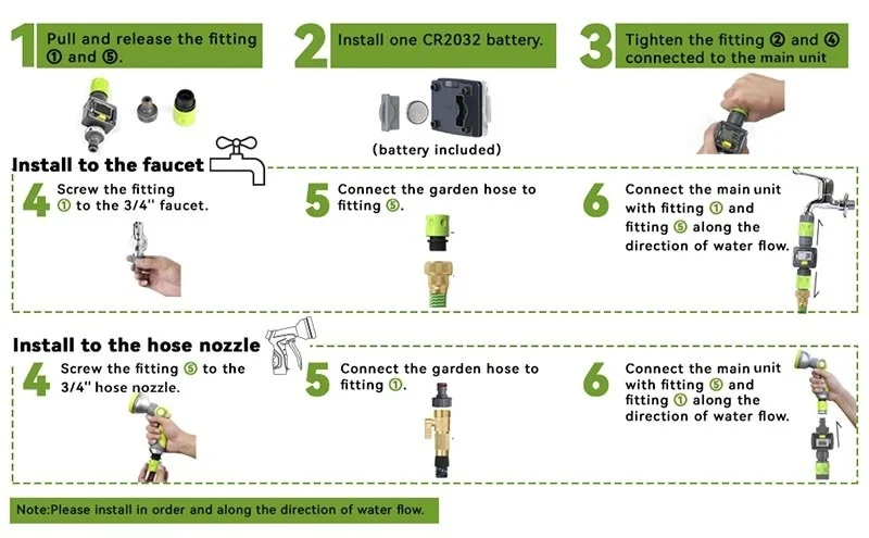 Простое и быстрое соединение> Интеллектуальный расходомер поставляется с быстроразъемными соединителями для шлангов, может быть легко подключен к любой стойке 3/4 ''садовый шланг, кран, спринклер и насадка. Обратите внимание, что Следуйте направлению потока воды, чтобы установить счетчик воды в шланге.