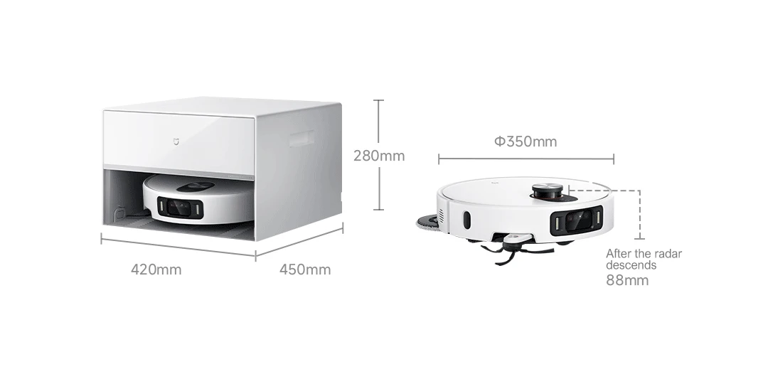Подъем LiDAR разумно опускается при столкновении с низкими участками и достигает всего 9,5 см для глубокой очистки.