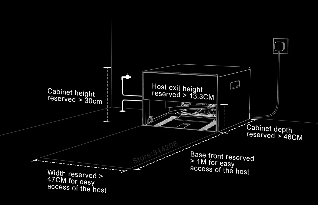 1.Для установки шкафа: Зарезервируйте высоту >30 см и глубину > 46 см.