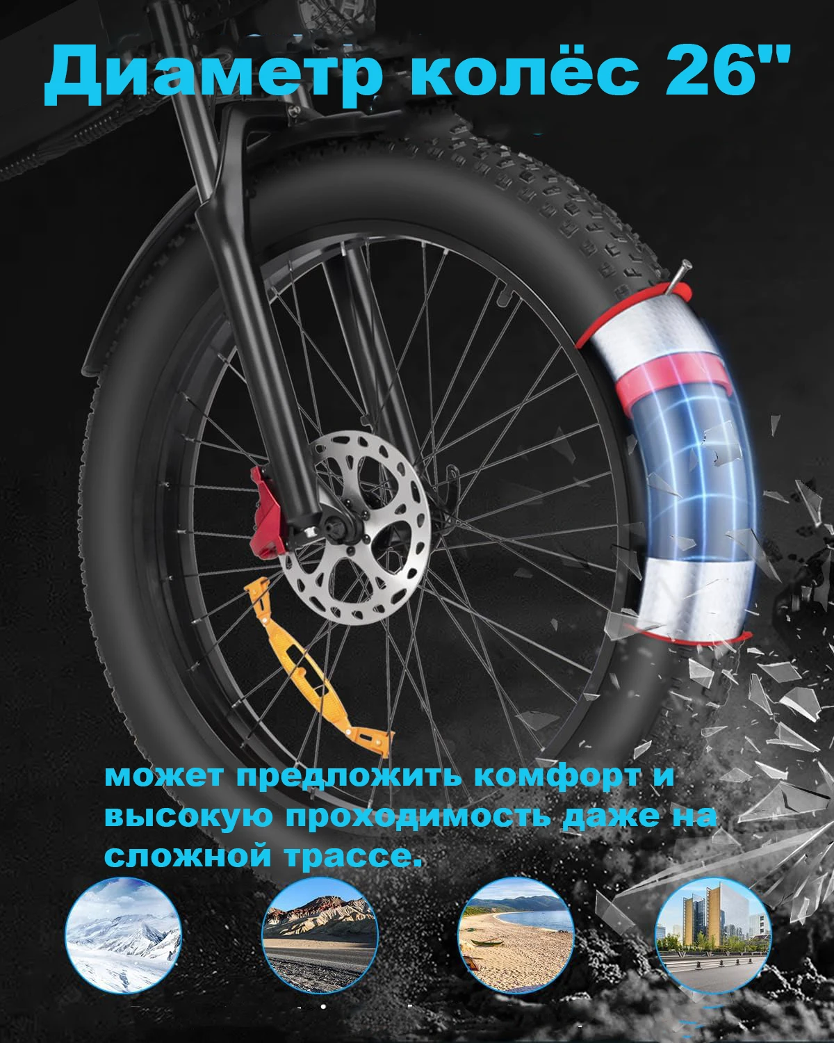 В этом обновленном электровелосипеде используются толстые шины диаметром 26*4,0 дюйма, которые отвечают всем вашим условиям езды, будь то ровная дорога, снежная дорога, горная дорога и т. д.