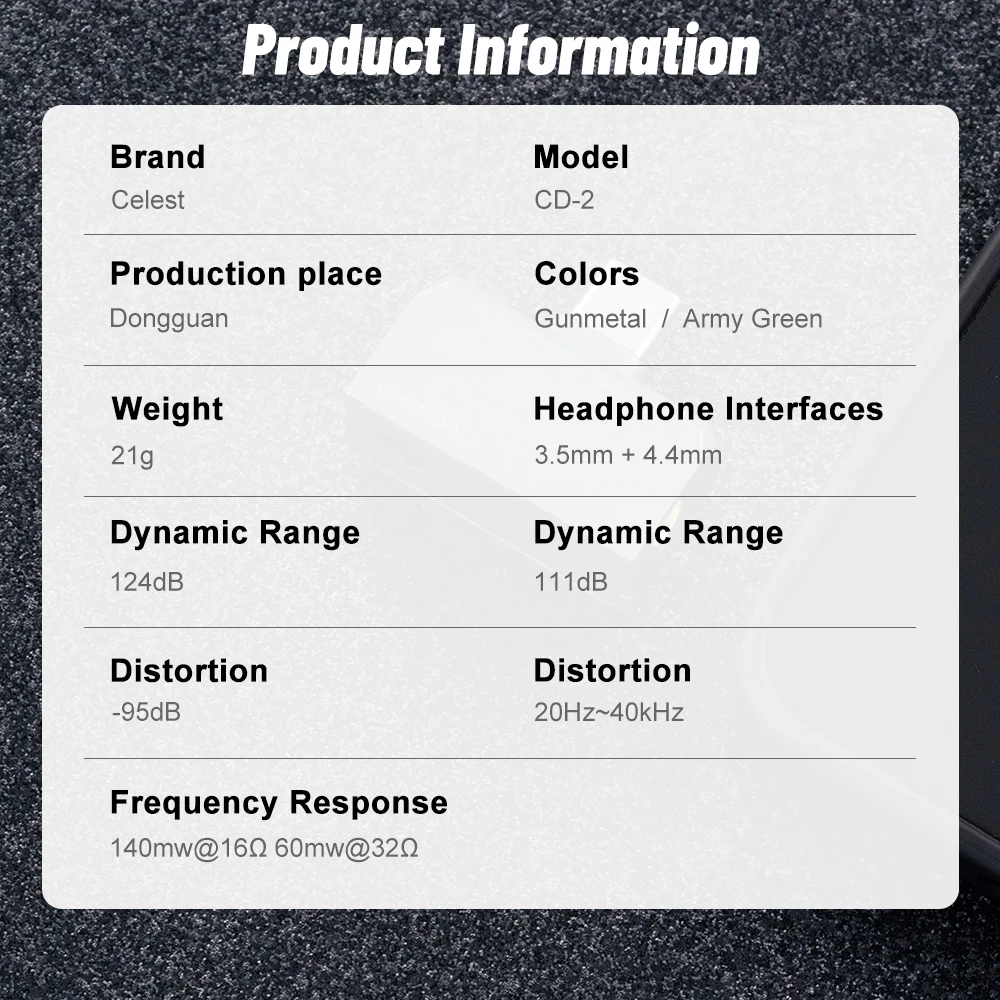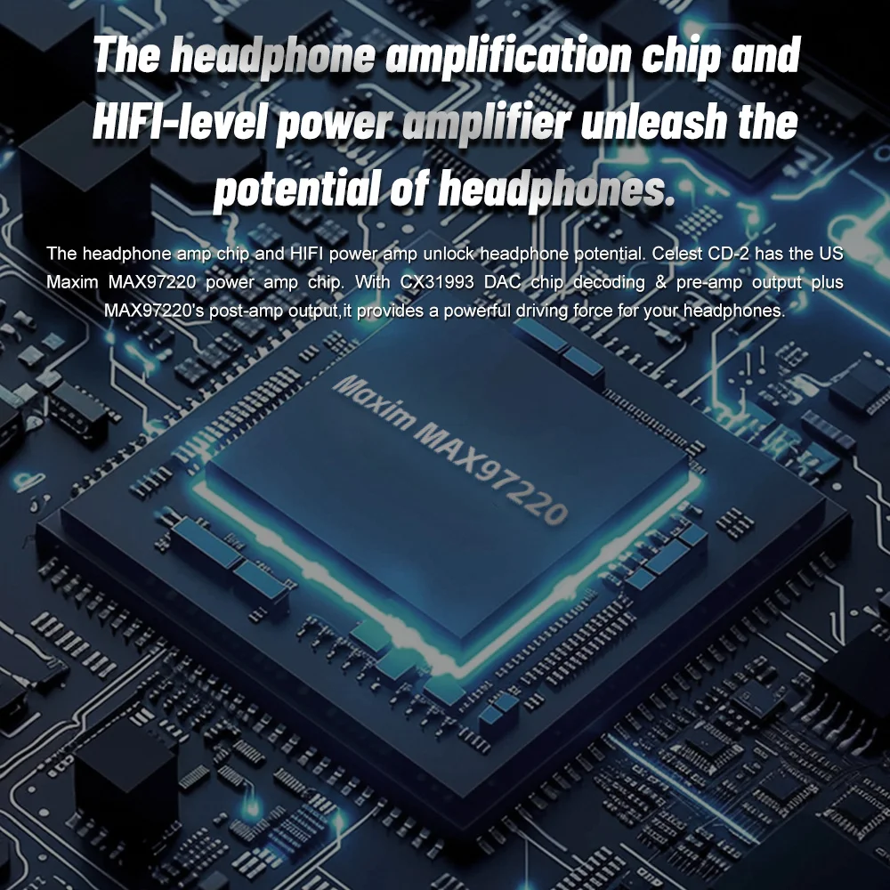 Celest CD-2 имеет чип усилителя мощности US Maxim MAX97220.Благодаря декодированию чипа ЦАП CX31993 и выходу предусилителя, а также выходу пост-ампер MAX97220 он обеспечивает мощную движущую силу для ваших наушников.