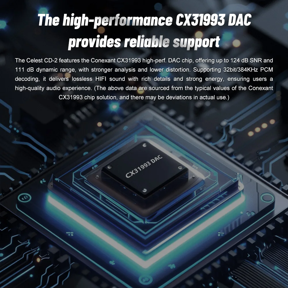 Celest CD-2 оснащен Conexant CX31993 high-perf.Чип ЦАП, обеспечивающий динамический диапазон SNR до 124 дБ и 111 дБ, с более сильным анализом и меньшими искажениями.Поддерживая декодирование PCM 32 бит/384 кГц, он обеспечивает звук HIFI без потерь с богатыми деталями и высокой энергией, гарантируя пользователям высококачественное звучание.(Вышеуказанные данные получены из типичных значений чип-раствора Conexant CX31993, и при фактическом использовании могут быть отклонения.)