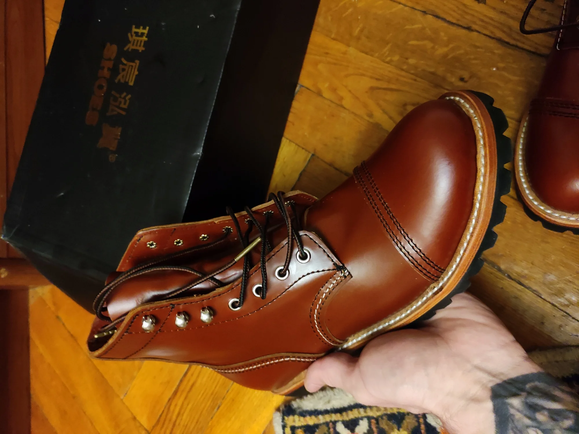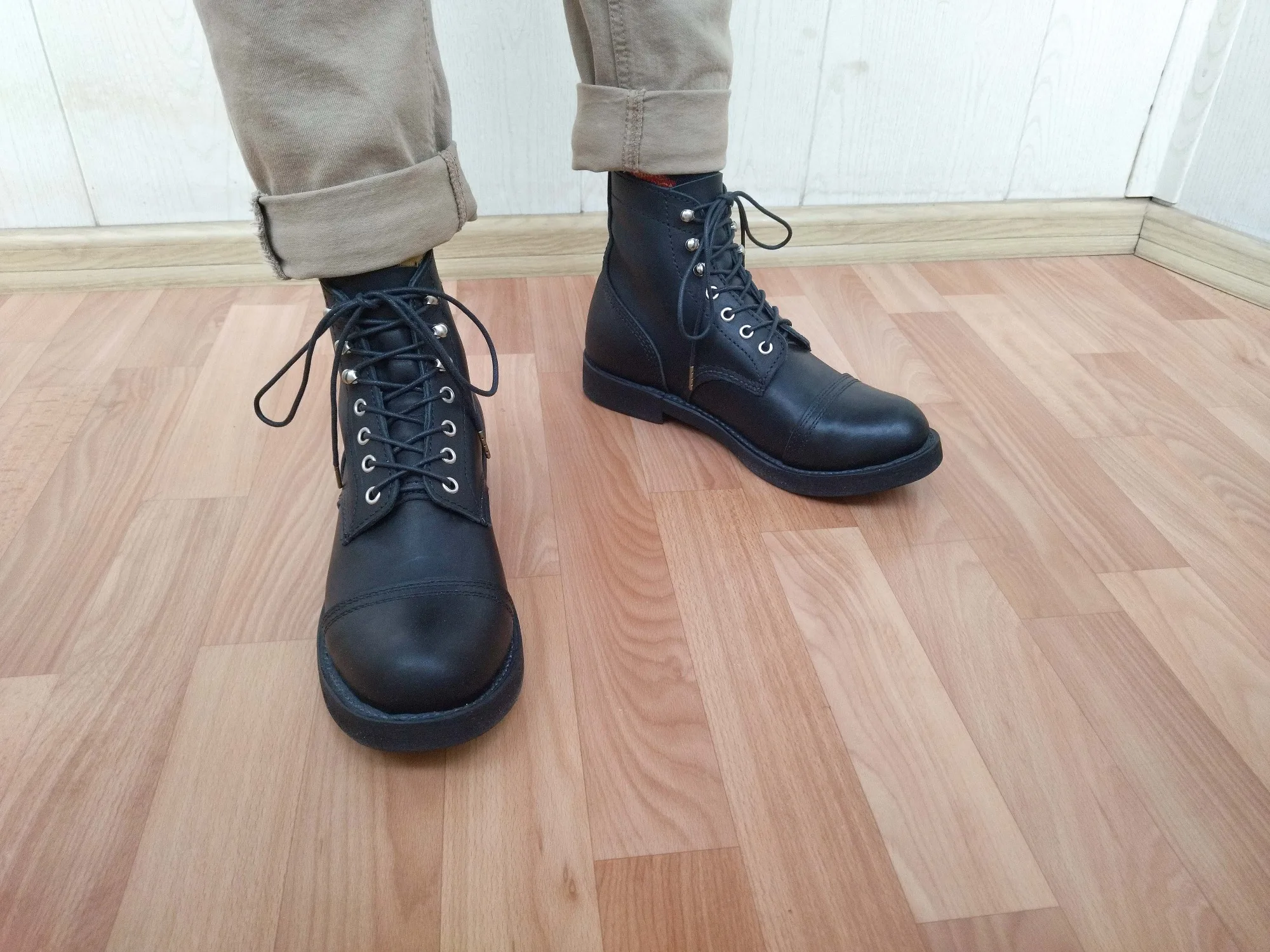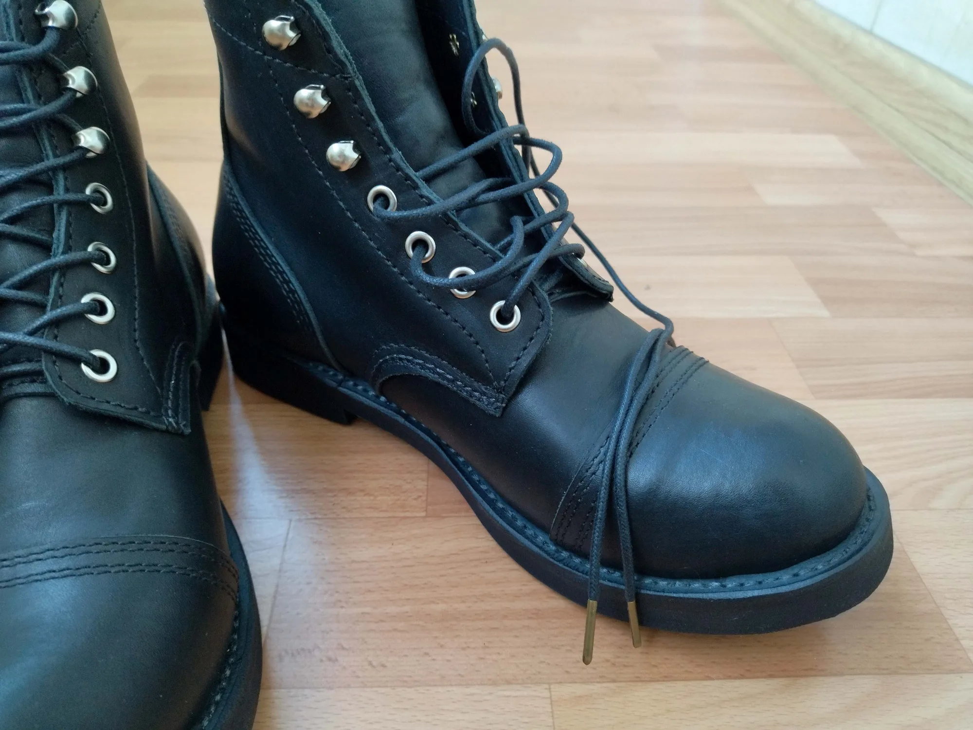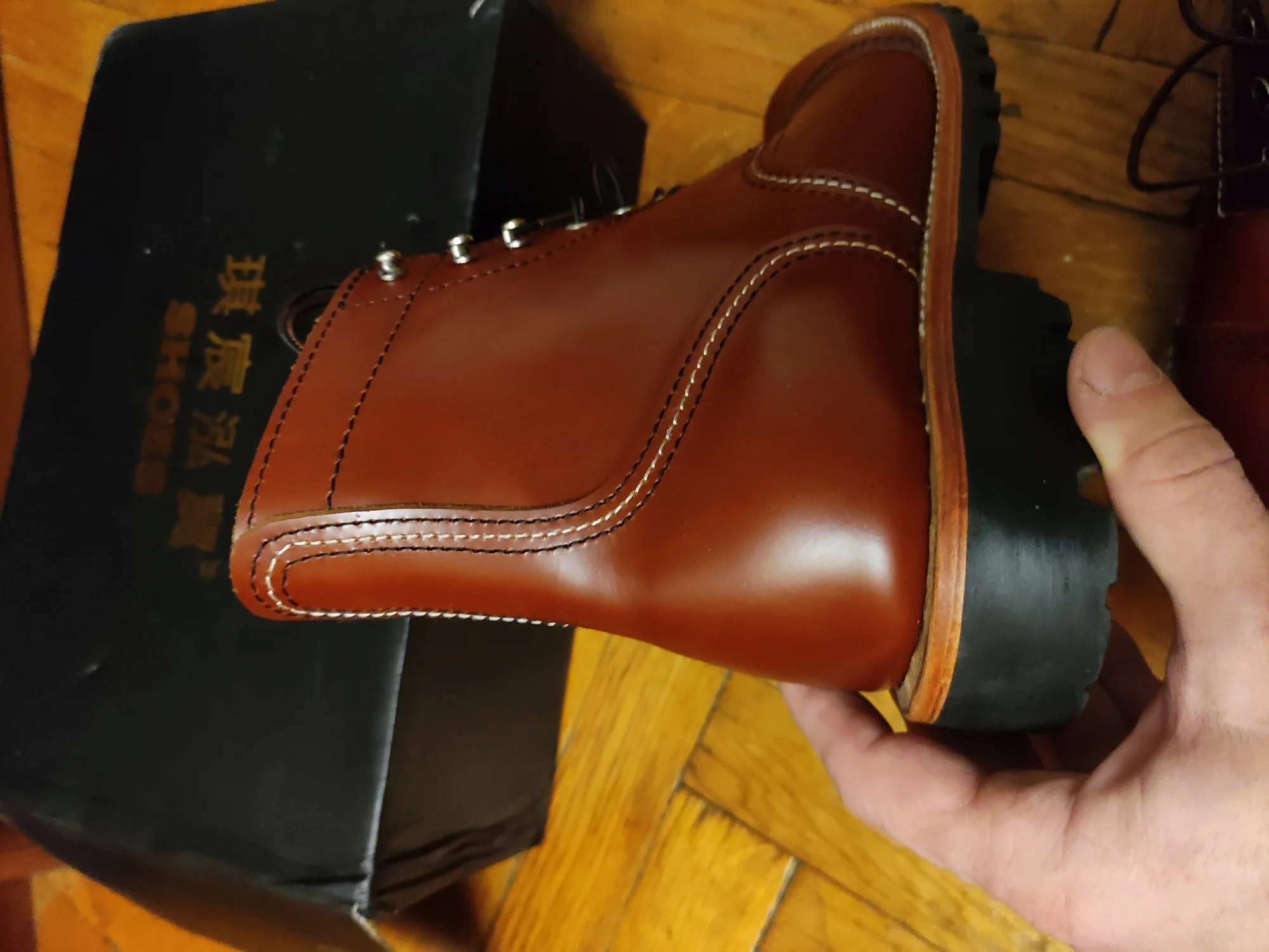 Во Владивосток доставили за месяц. Ботинки выглядят отлично. Сделаны из кожи, жесткая подошва, каблук подбит гвоздями, крючки и люверсы выглядят крепкими. Упакованы в картонную коробку, для каждого ботинка есть пыльник. Размер подошел: длинна моей стопы 26,5 см, взял 41. Для большого пальца есть запас, по бокам немного поджимает. Думаю и 42 бы подошел, так как носить такую обувь только со стелькой. Тем у кого высокий подъем берите на размер больше. Так же, если планируете вставлять стельку, посадка ноги становится плотнее - исходите из этого когда будете выбирать размер. Эта обувь, явно, не для холодной или дождливой погоды. Теперь к недостаткам. Запах клея - временный недостаток. Сомнения вызывают: тонкая стелька, и то как сшиты половинки берца (фото 1), кривой шов (фото 2), есть не прошитое место (фото 3,4) гвозди не забиты до конца (на фото 5 каблук слева забил сам). Когда будете подбивать, он может вылезти - учитывайте это. Ожидал что продавец учтет мои пожелания, так как я хотел что бы они были похожи на IRON RANGER 8084. Но видимо я неправильно донес до него информацию. В любом случае спасибо. Надеюсь что в последствии продавец учтет эти недостатки.Alexsandr Z. 17 декабря 2023