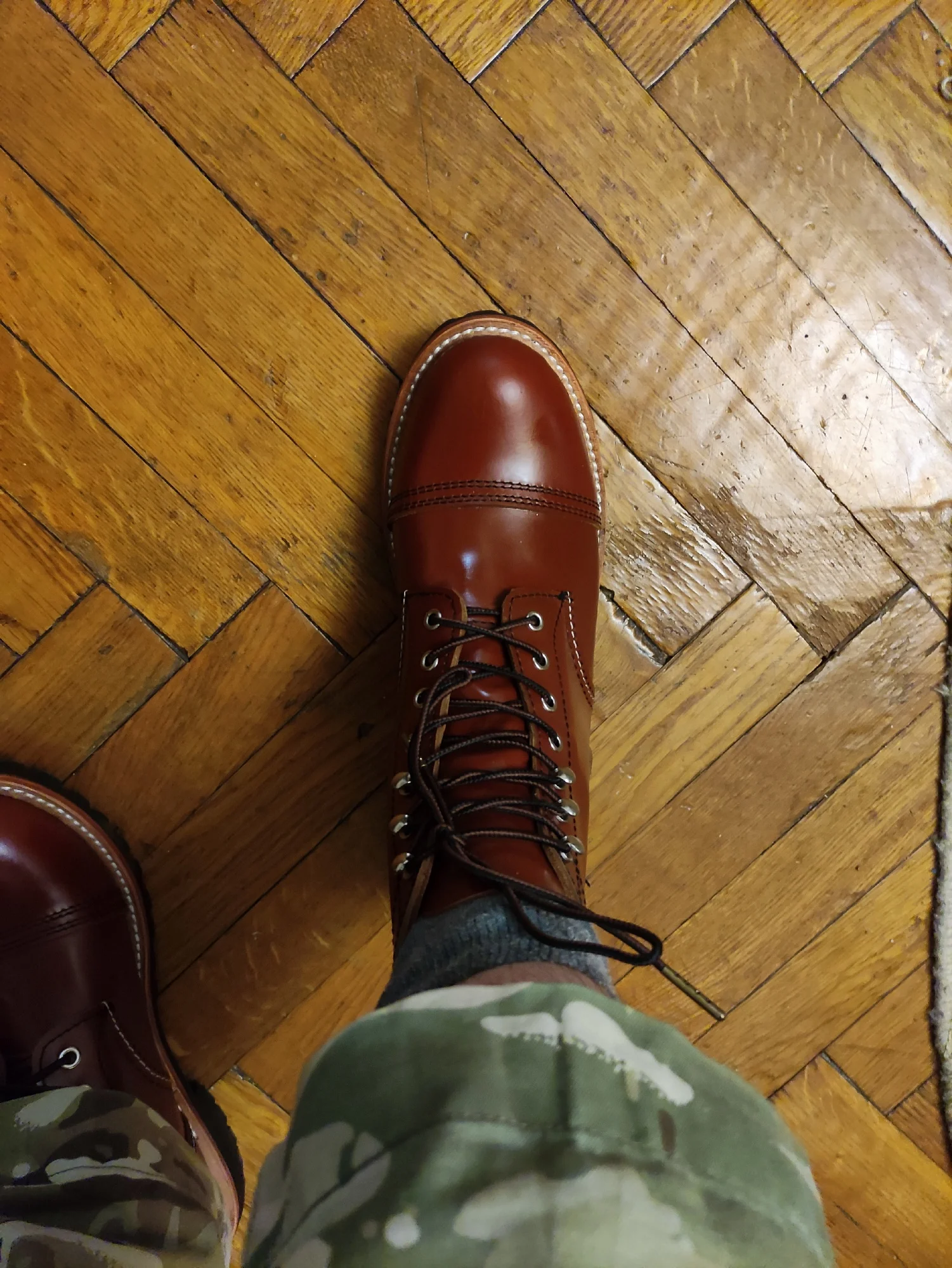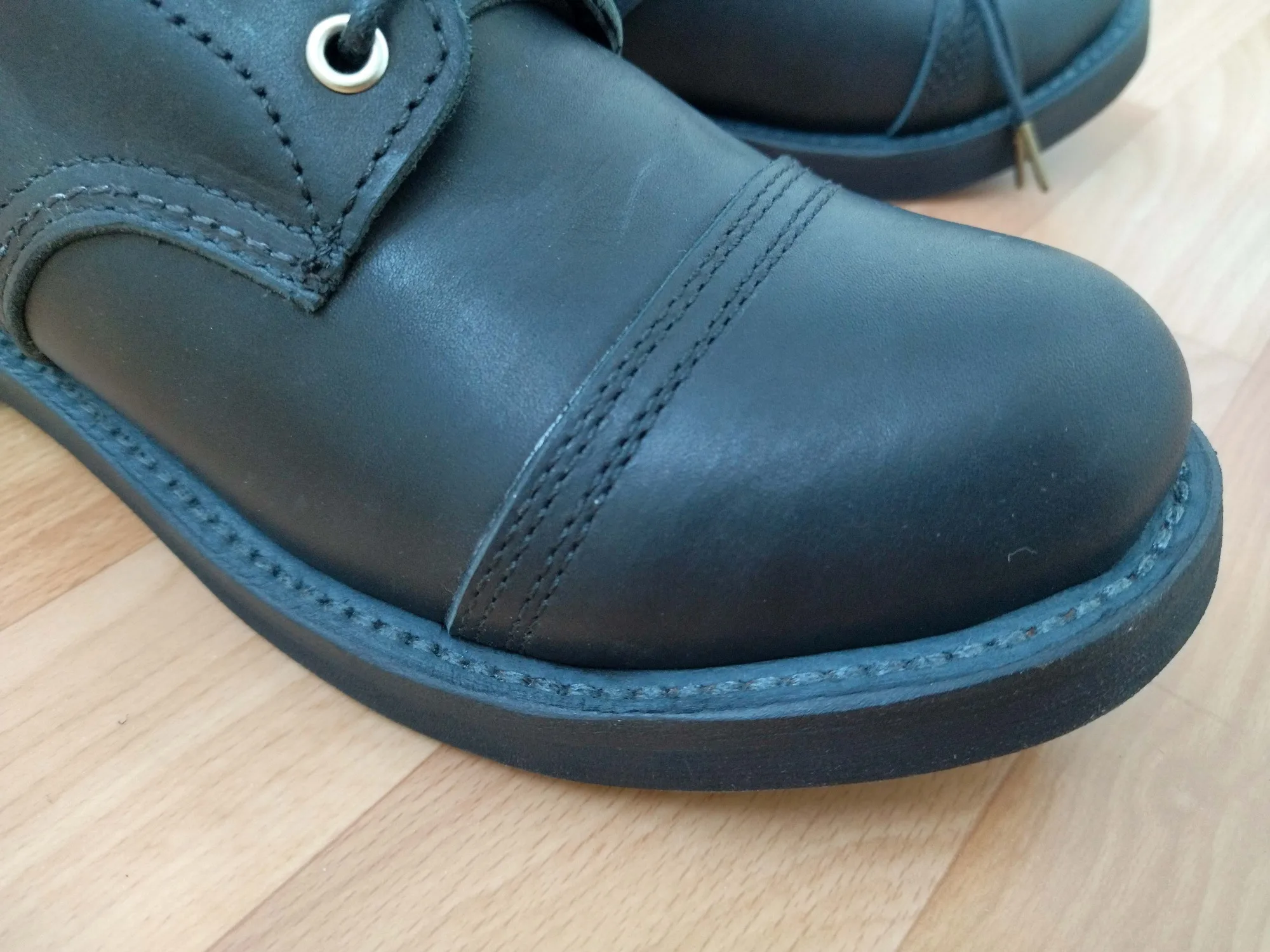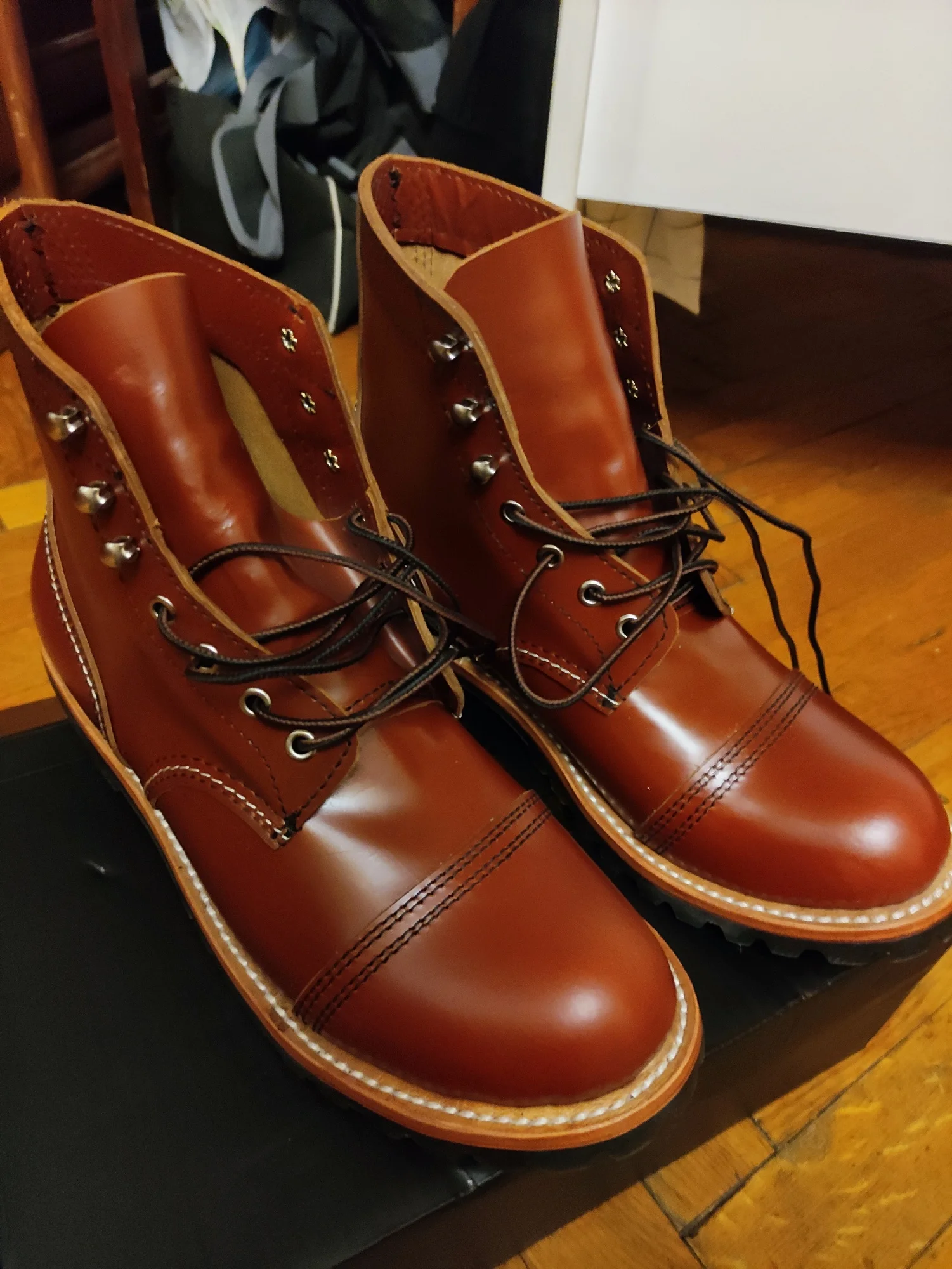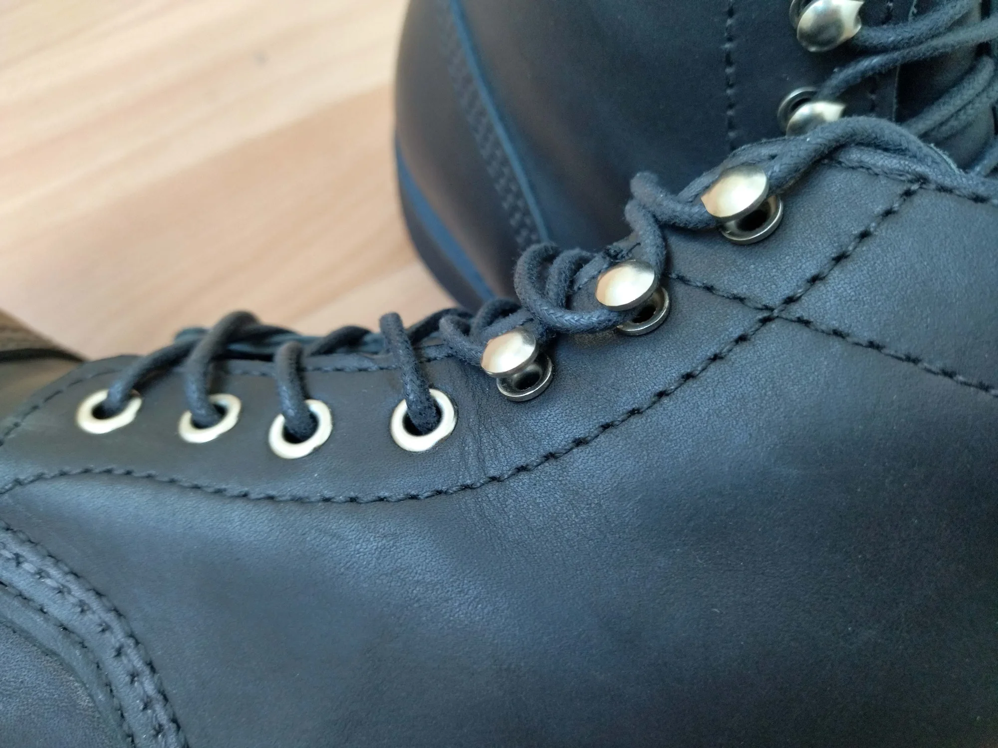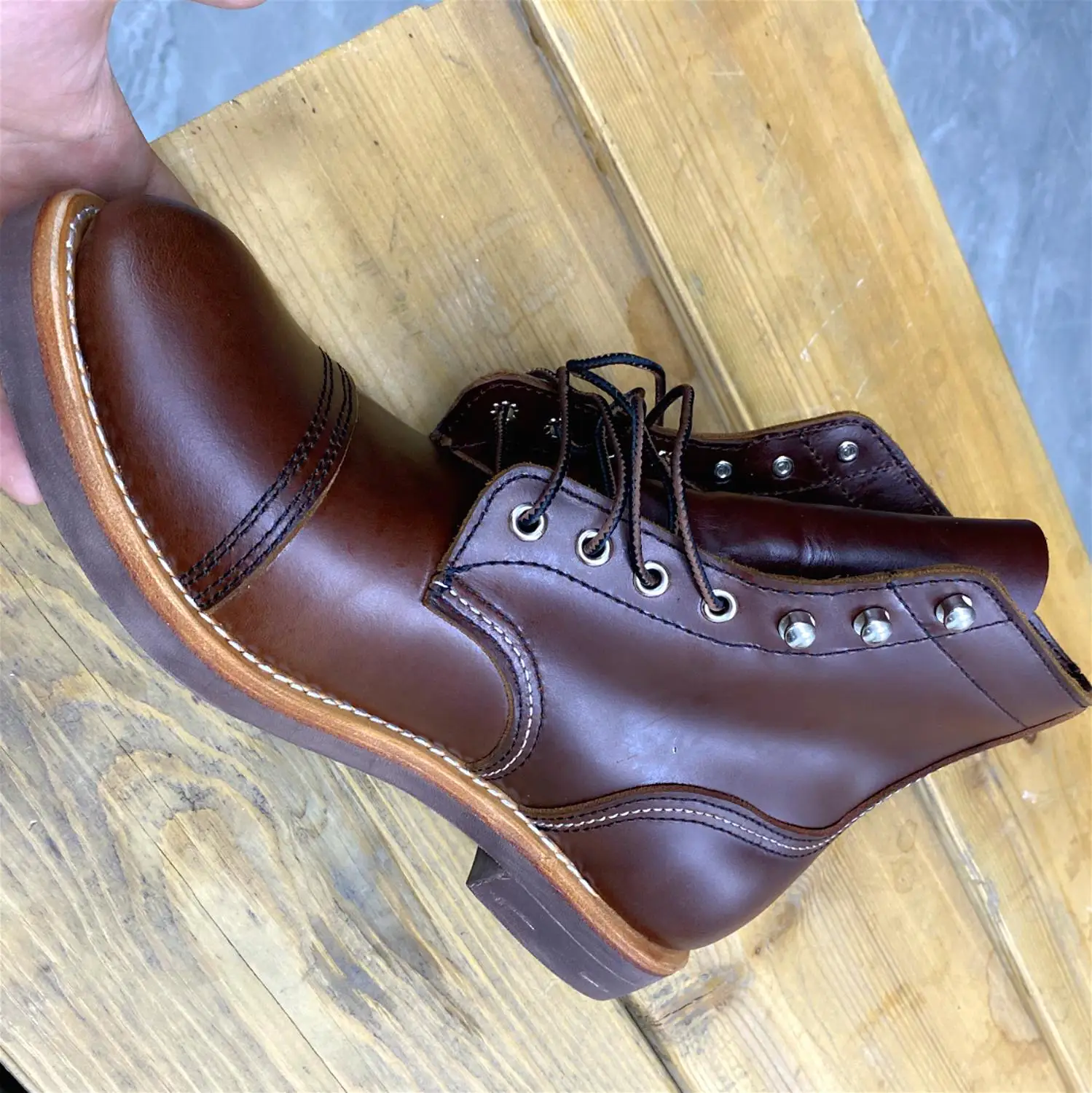 Во Владивосток доставили за месяц. Ботинки выглядят отлично. Сделаны из кожи, жесткая подошва, каблук подбит гвоздями, крючки и люверсы выглядят крепкими. Упакованы в картонную коробку, для каждого ботинка есть пыльник. Размер подошел: длинна моей стопы 26,5 см, взял 41. Для большого пальца есть запас, по бокам немного поджимает. Думаю и 42 бы подошел, так как носить такую обувь только со стелькой. Тем у кого высокий подъем берите на размер больше. Так же, если планируете вставлять стельку, посадка ноги становится плотнее - исходите из этого когда будете выбирать размер. Эта обувь, явно, не для холодной или дождливой погоды. Теперь к недостаткам. Запах клея - временный недостаток. Сомнения вызывают: тонкая стелька, и то как сшиты половинки берца (фото 1), кривой шов (фото 2), есть не прошитое место (фото 3,4) гвозди не забиты до конца (на фото 5 каблук слева забил сам). Когда будете подбивать, он может вылезти - учитывайте это. Ожидал что продавец учтет мои пожелания, так как я хотел что бы они были похожи на IRON RANGER 8084. Но видимо я неправильно донес до него информацию. В любом случае спасибо. Надеюсь что в последствии продавец учтет эти недостатки.Alexsandr Z. 17 декабря 2023