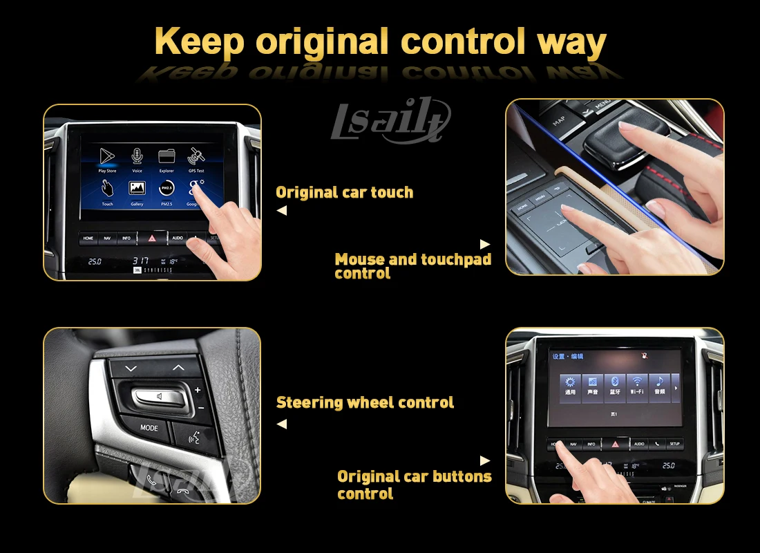 Это мультимедийный интерфейс без монитора. Он интегрируется с OEM-экраном и радио. Интерфейс Lsailt подключается к разъемам позади монитора, не мешая Головному Устройству. С помощью данного модуля можно не только использовать Yandex, NF,YT, навигатор или навитель с пробками в реальном времени, но и воспроизводить видео, скачивать приложения и использовать USB накопители. Блок интерфейса Android поддерживает подключение через себя к автомобилю дополнительного оборудования: различных аудио-и видеоустройств, Камеры Переднего Вида 360 камеры.