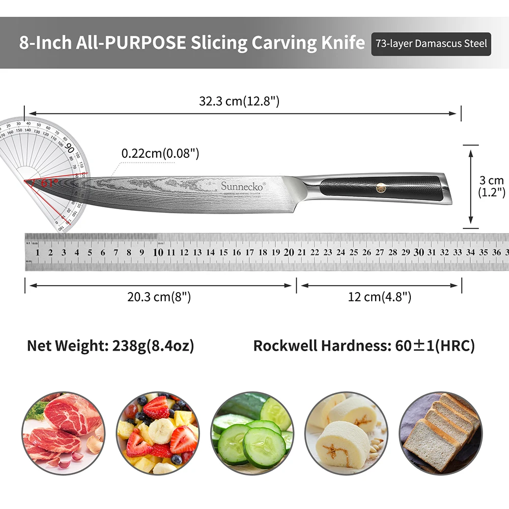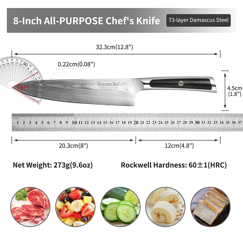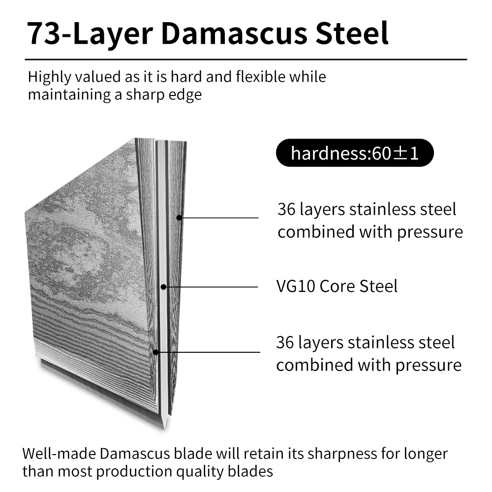 Технические характеристики: -Материал лезвия:73 слоя дамасской стали и японское лезвие со стальным сердечником VG10,